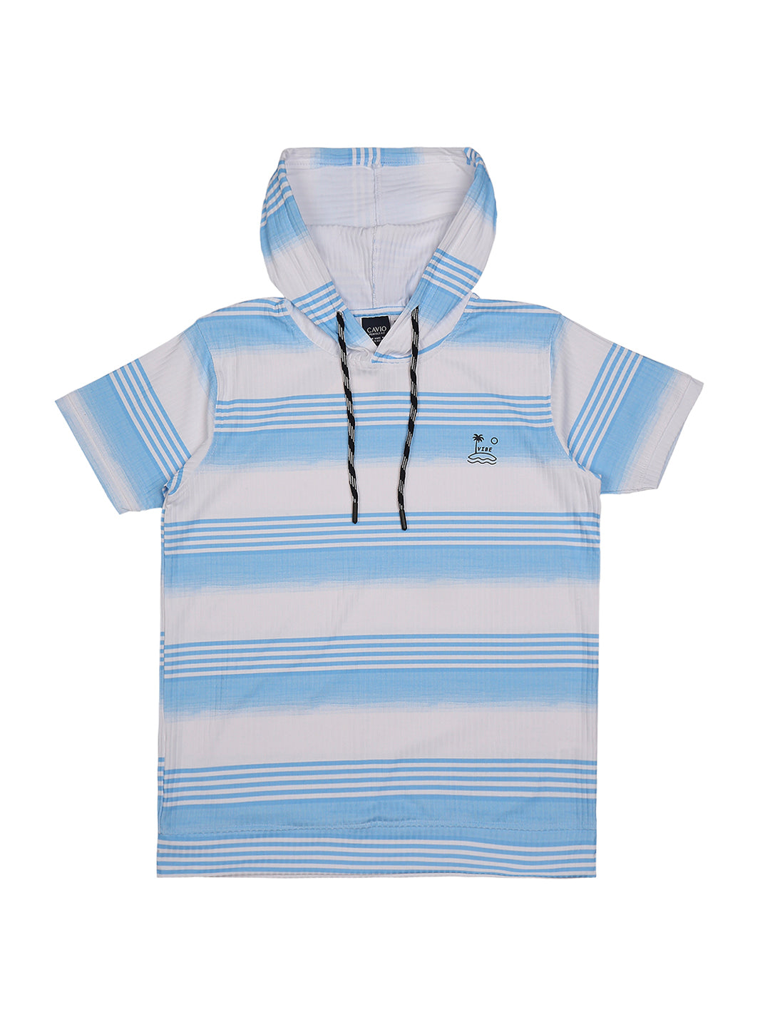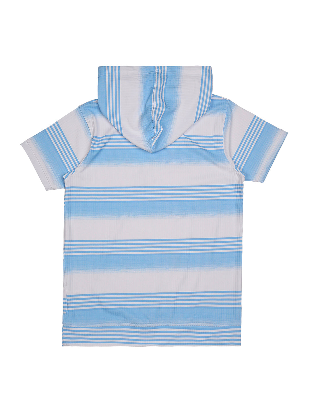 Peach-coloured and white striped T-shirt, has a hooded, short sleeves
