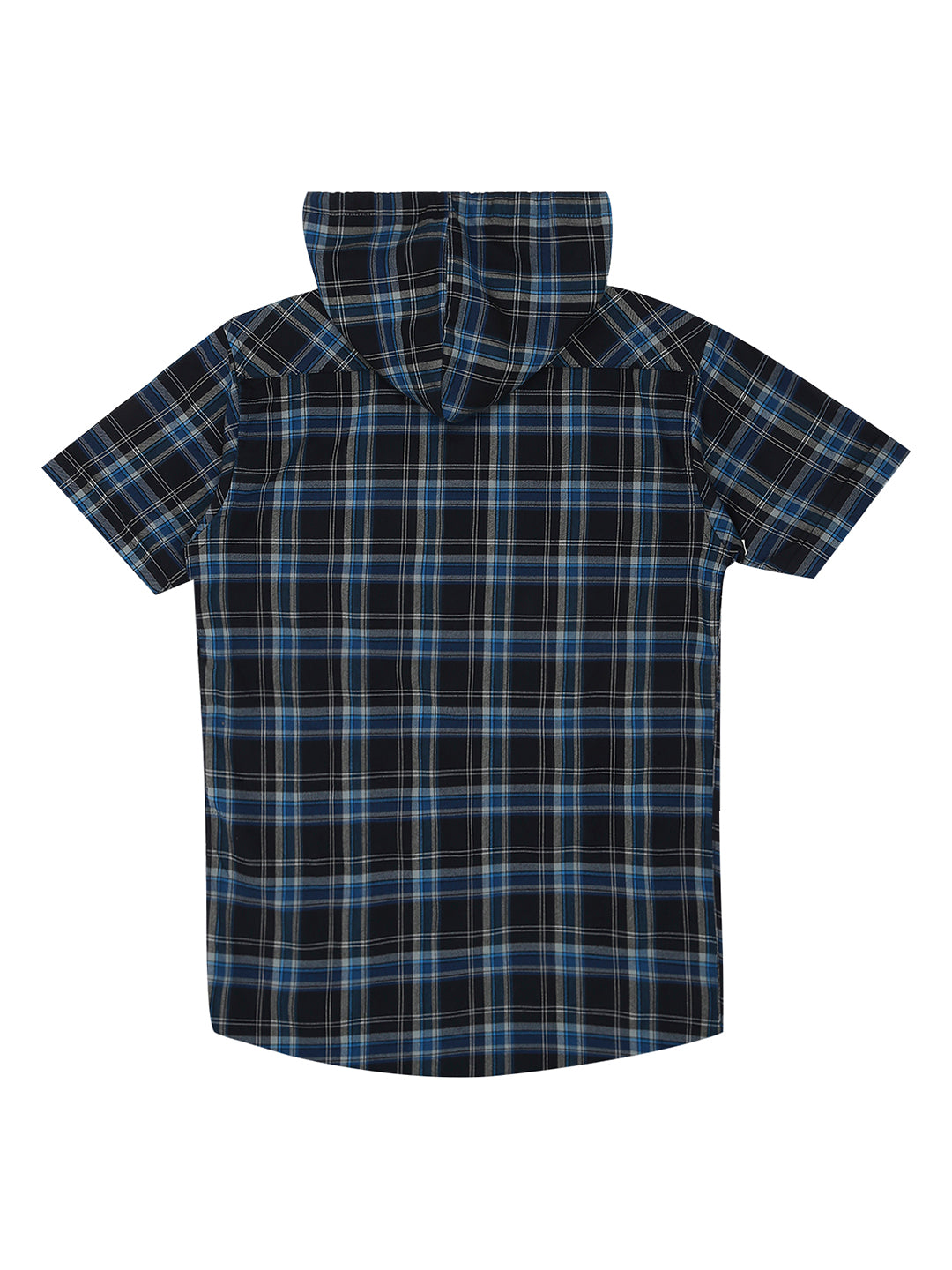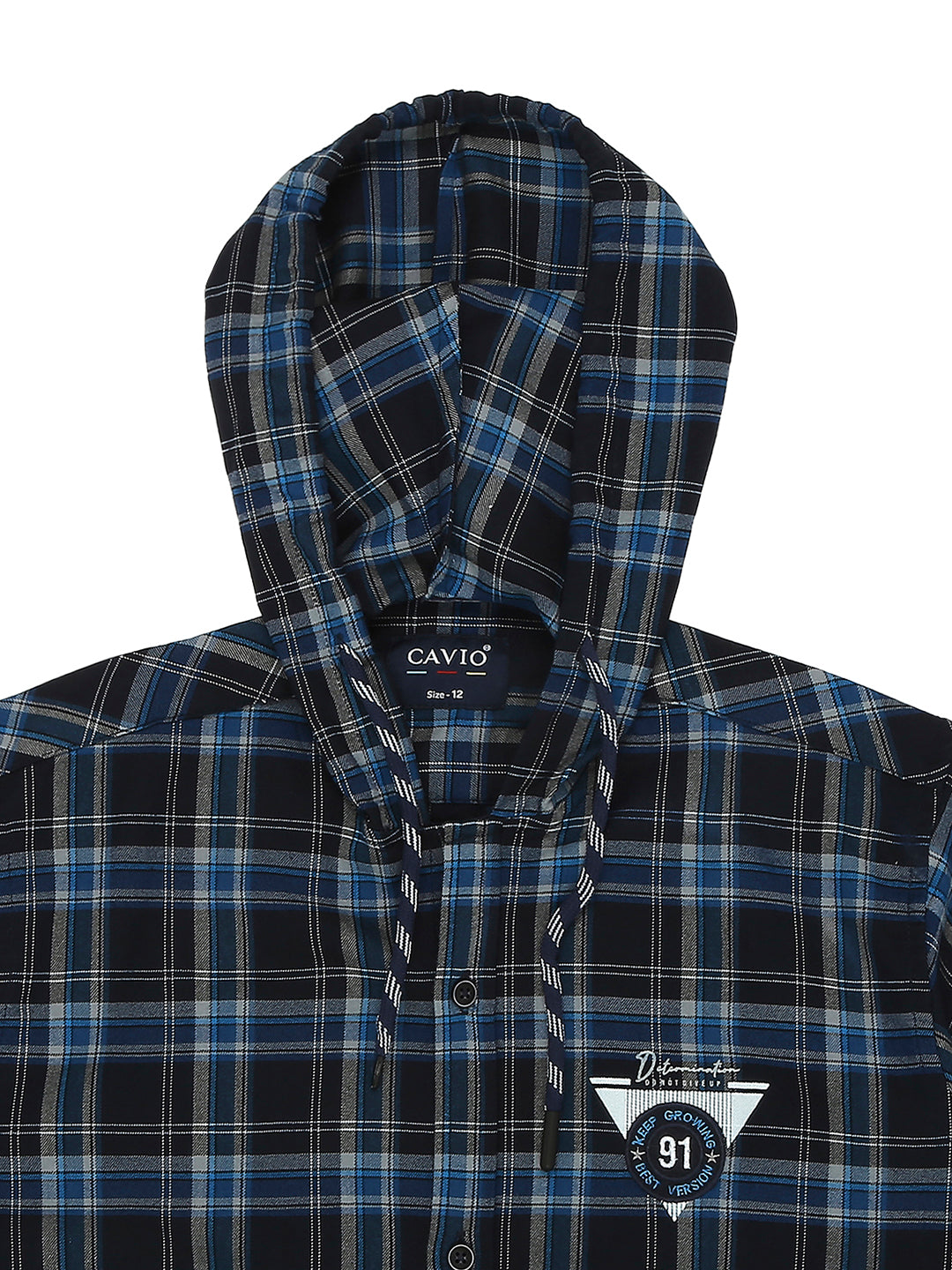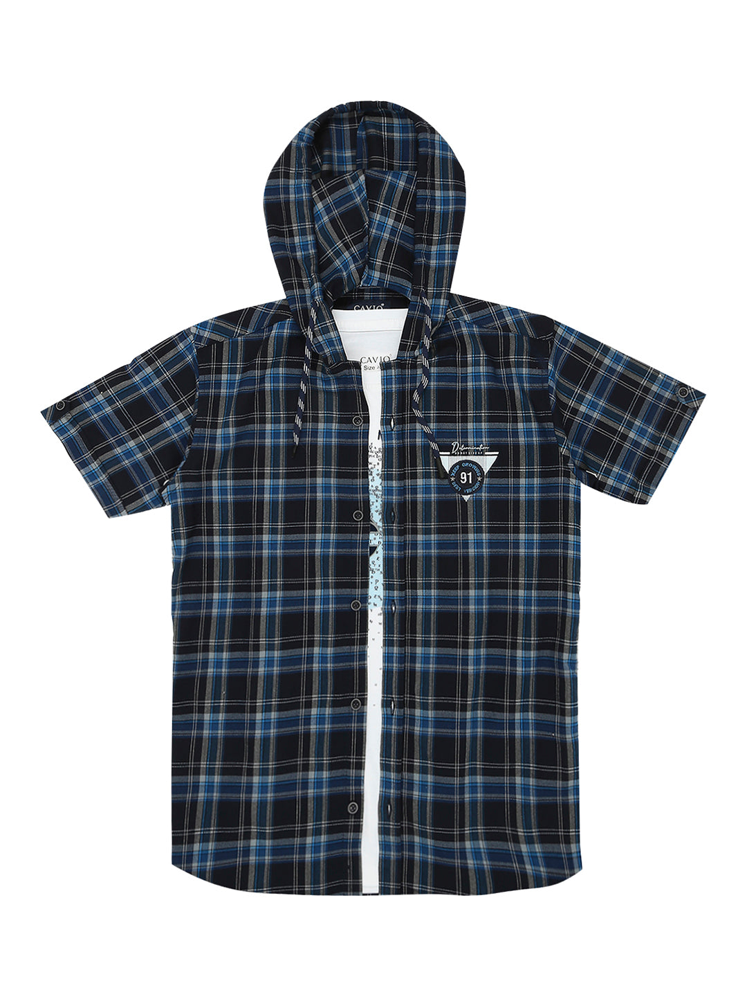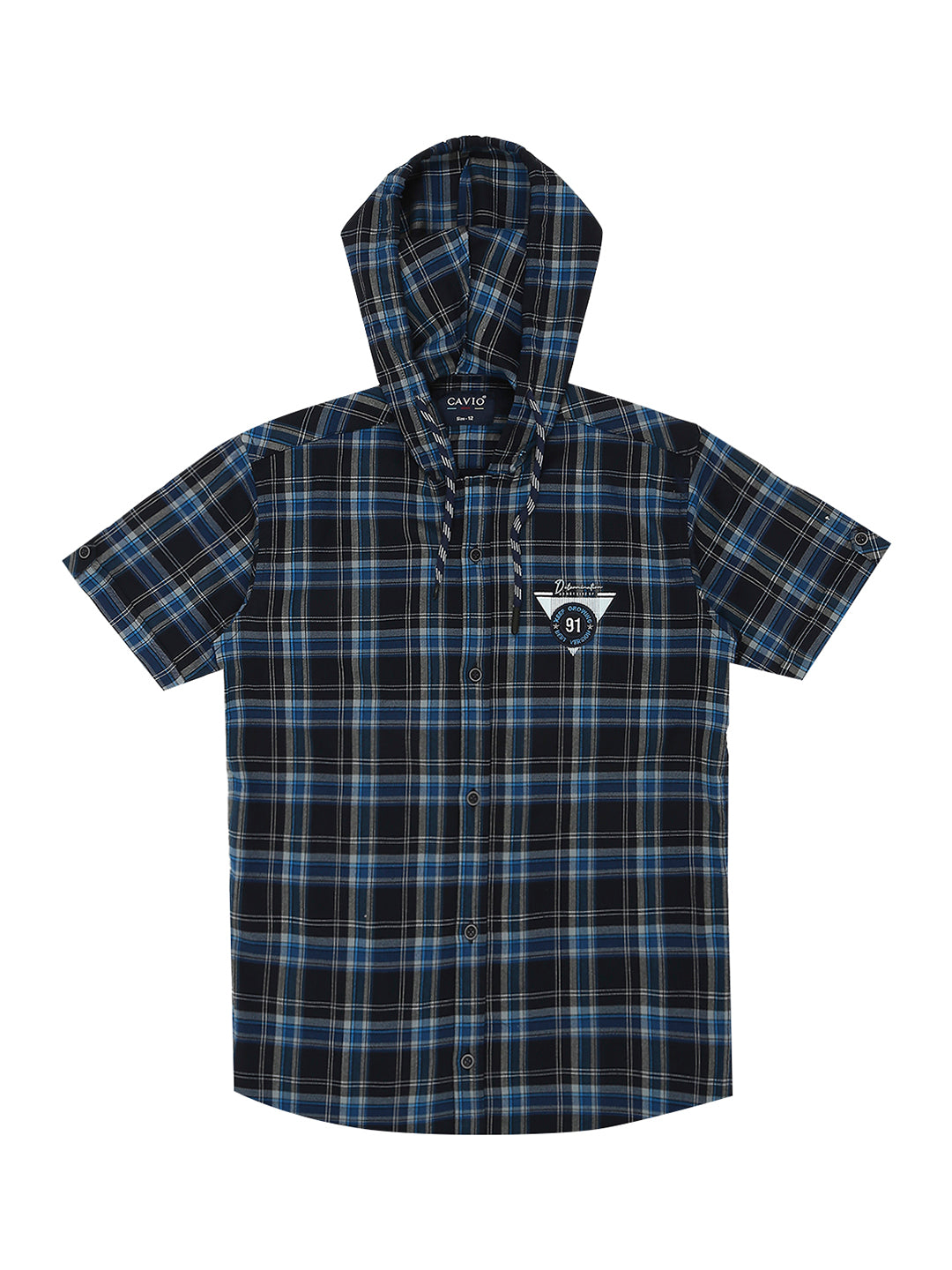 Navy Blue tartan checks checked opaque Casual shirt ,has a hooded neck, button placket, short regular sleeves, curved hem