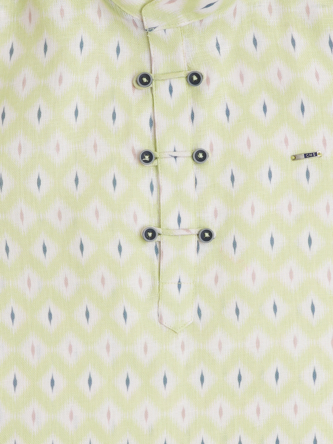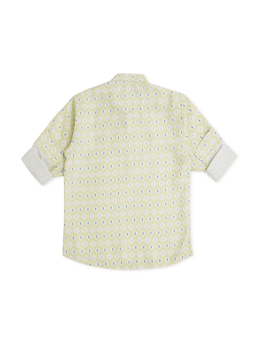 Green conversational printed Casual shirt ,has a mandarin collar, button placket, long roll-up sleeves, curved hem