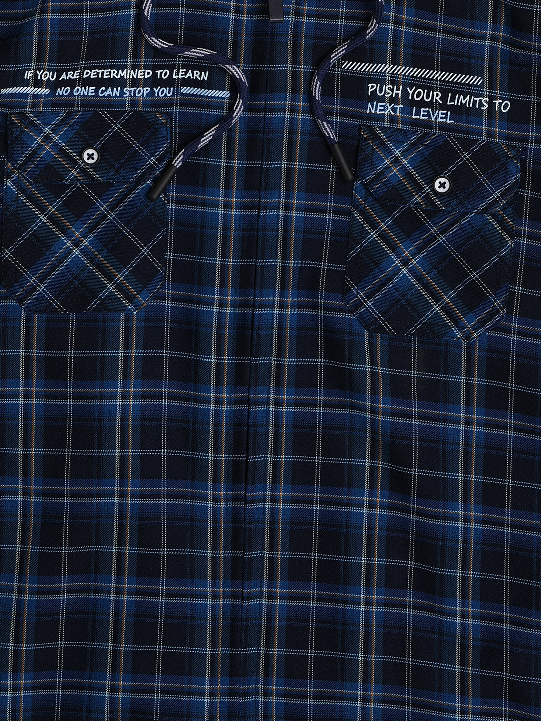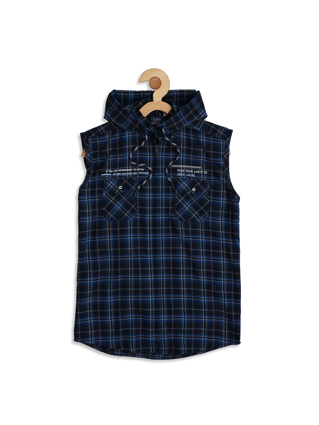 Maroon tartan checked opaque Casual shirt ,has a hood, zip, 2 pocket, sleeveless, straight hem.