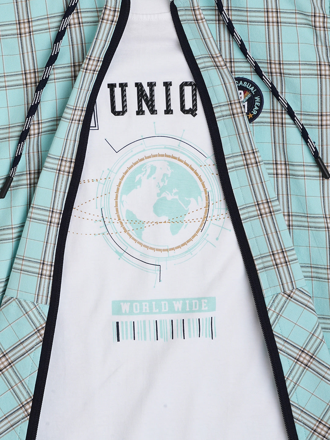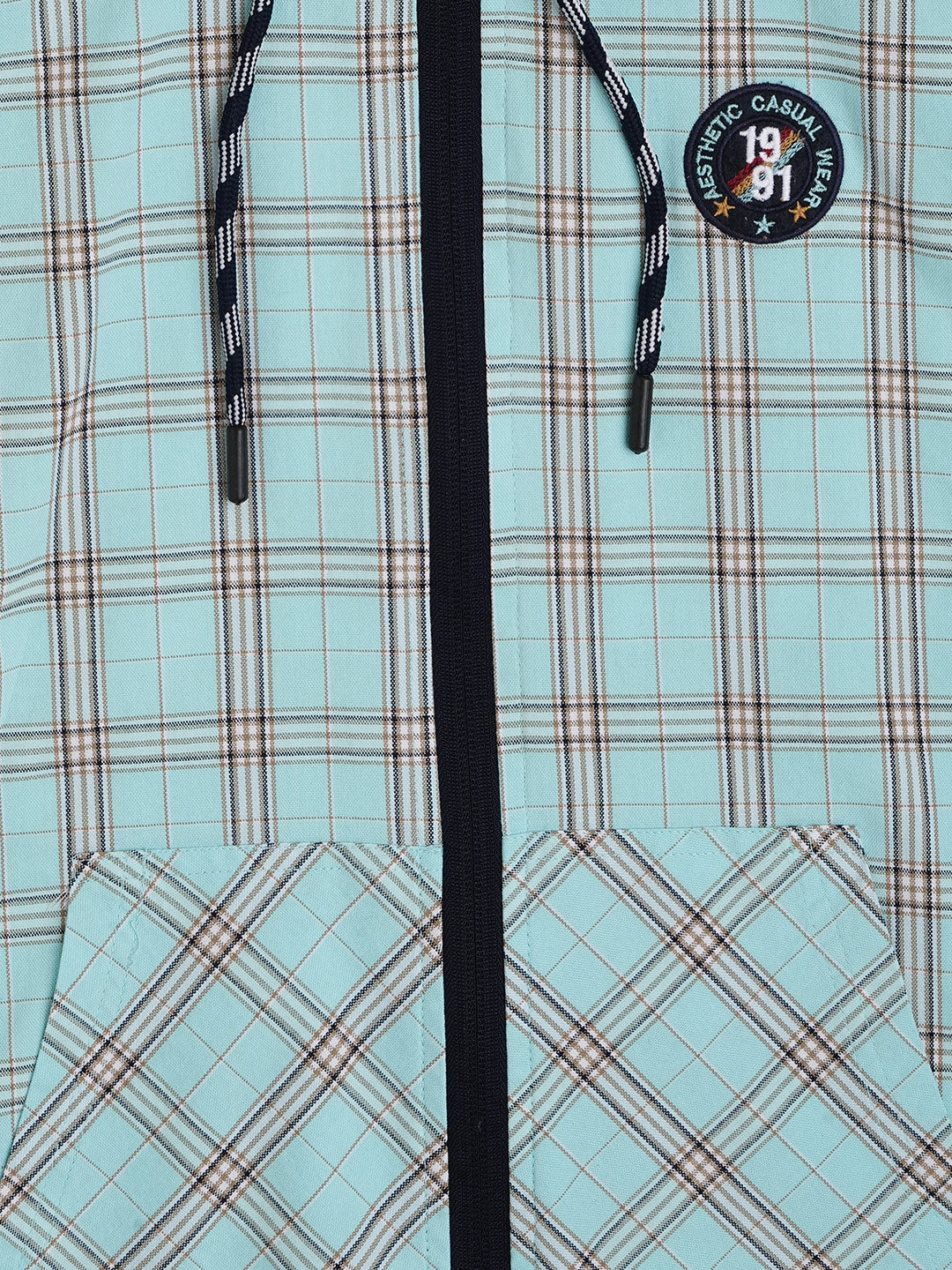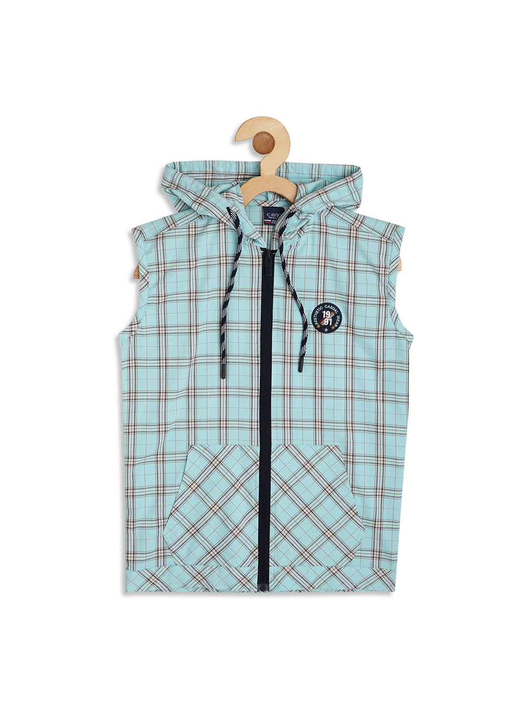 Blue checked opaque Casual shirt ,has a hood, zip, 2 pocket, sleeveless, straight hem.