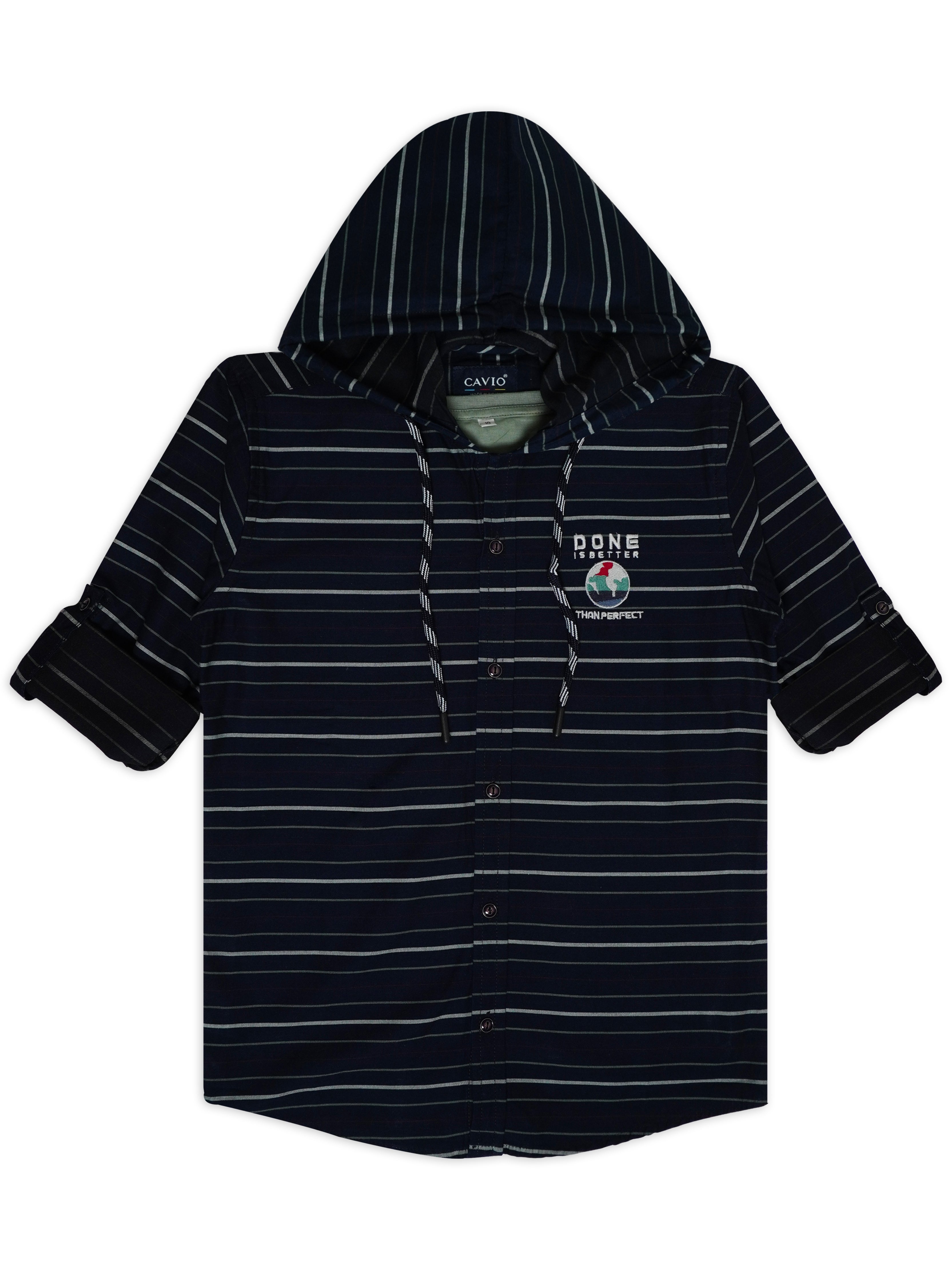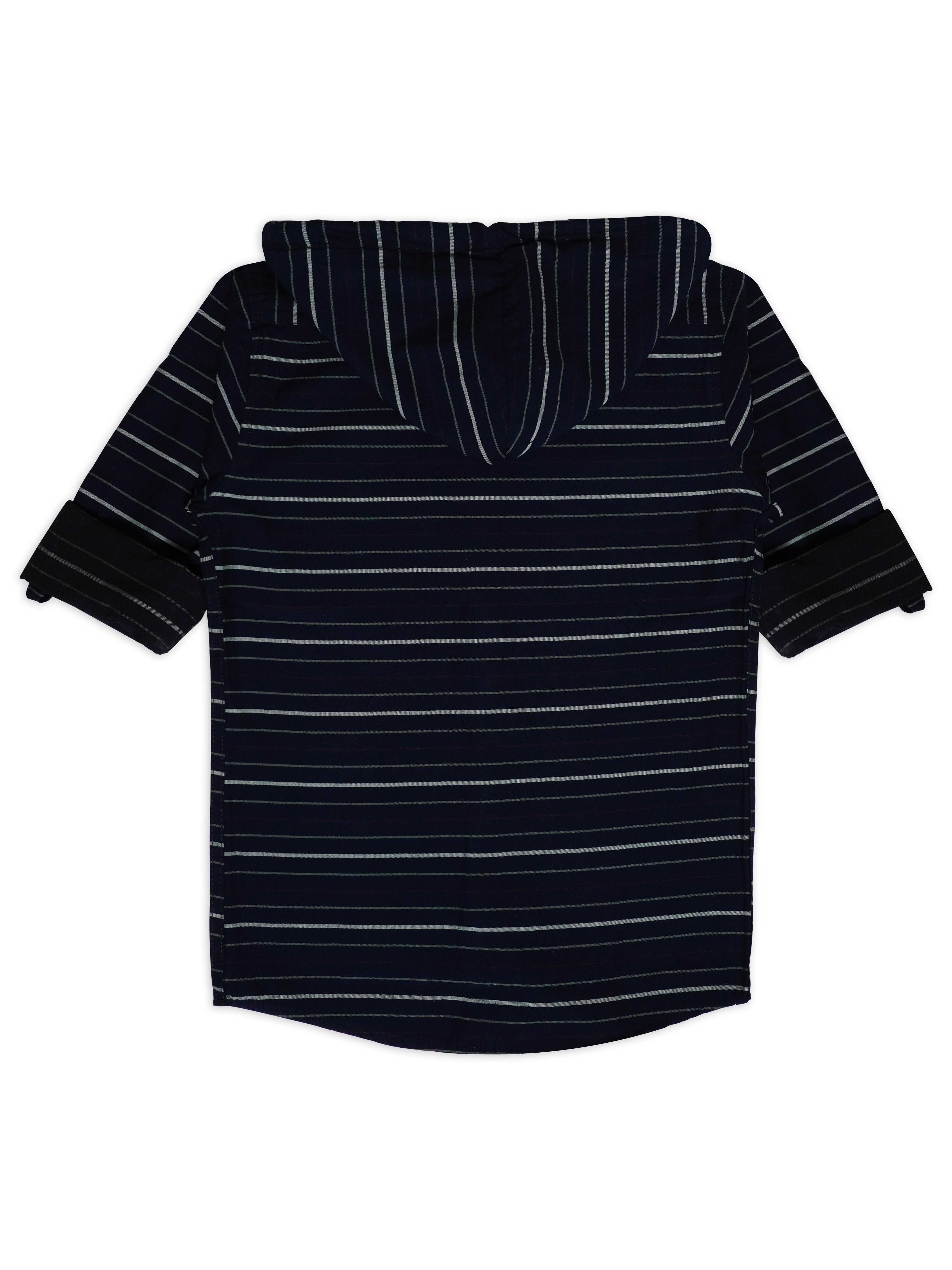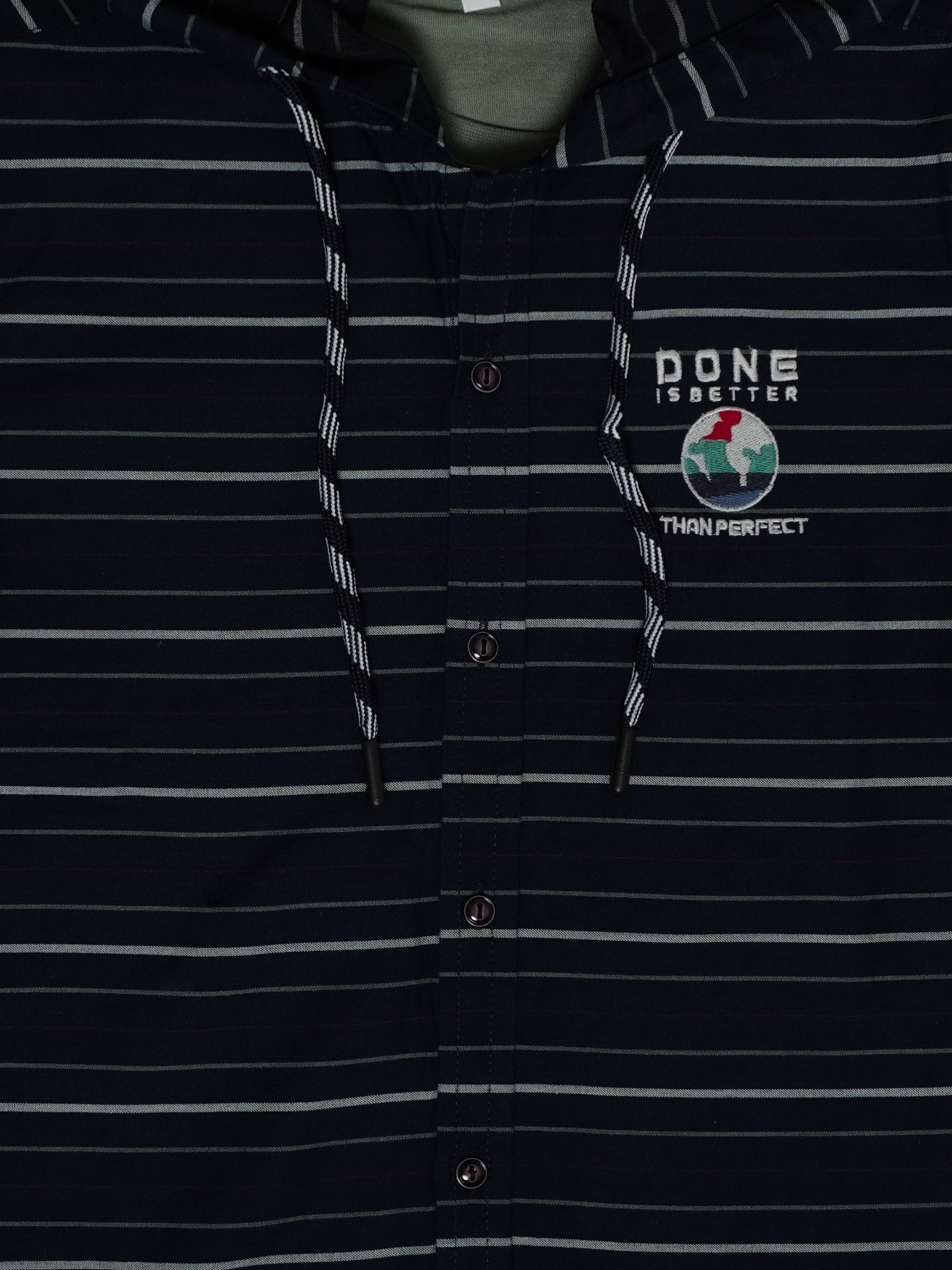 Green horizontal striped opaque Casual shirt ,has a hood, button placket, long roll-up sleeves, curved hem