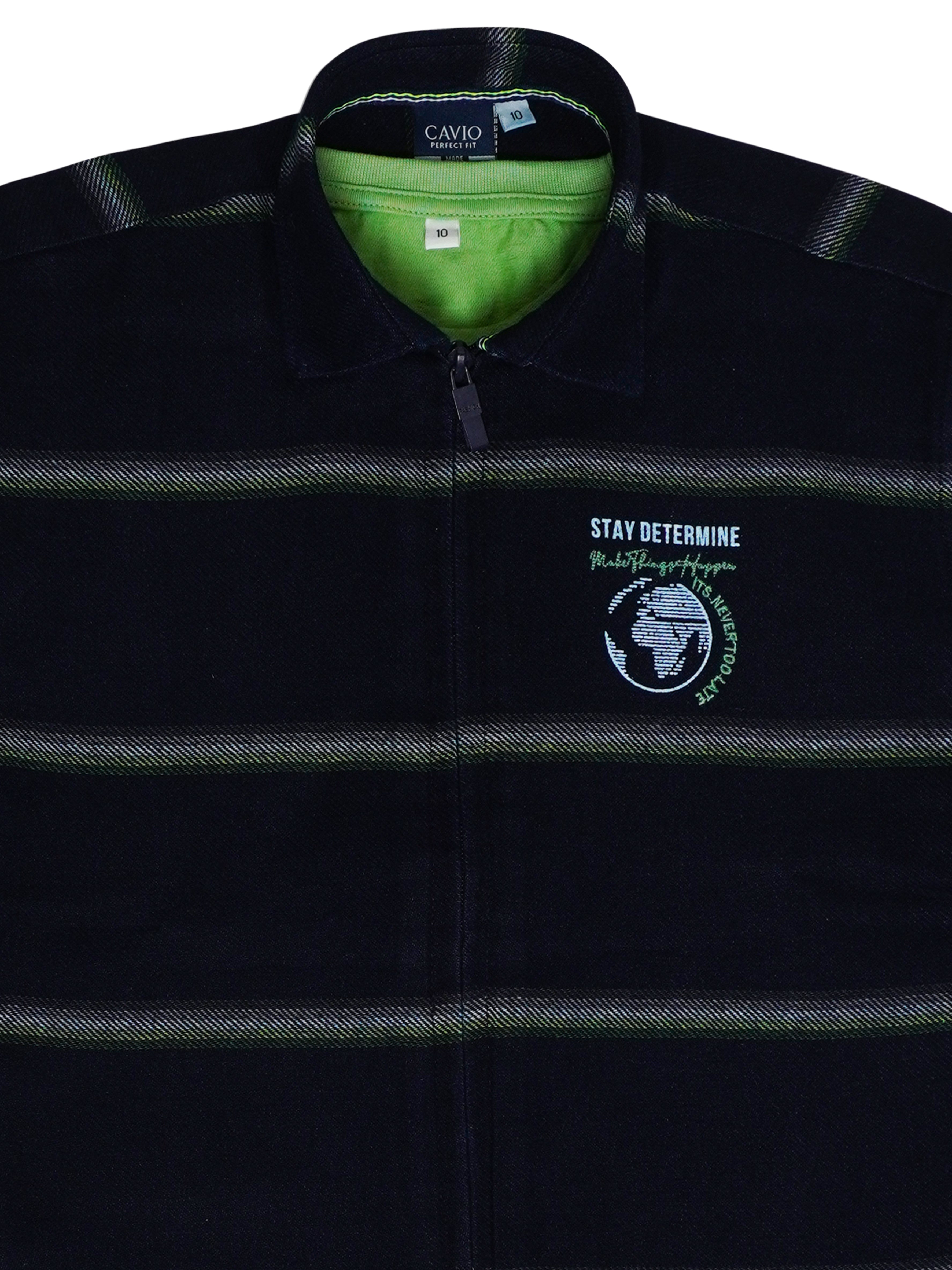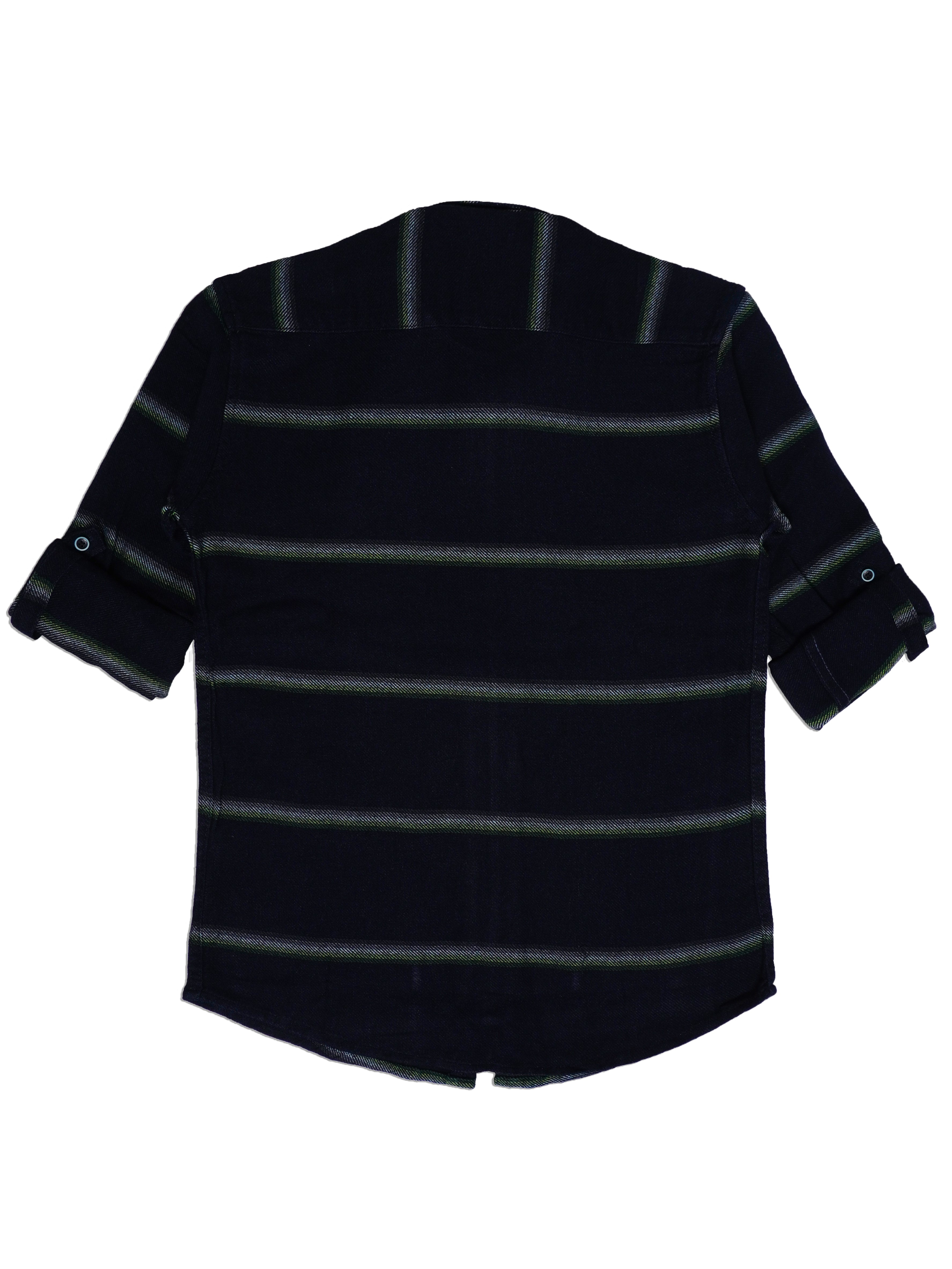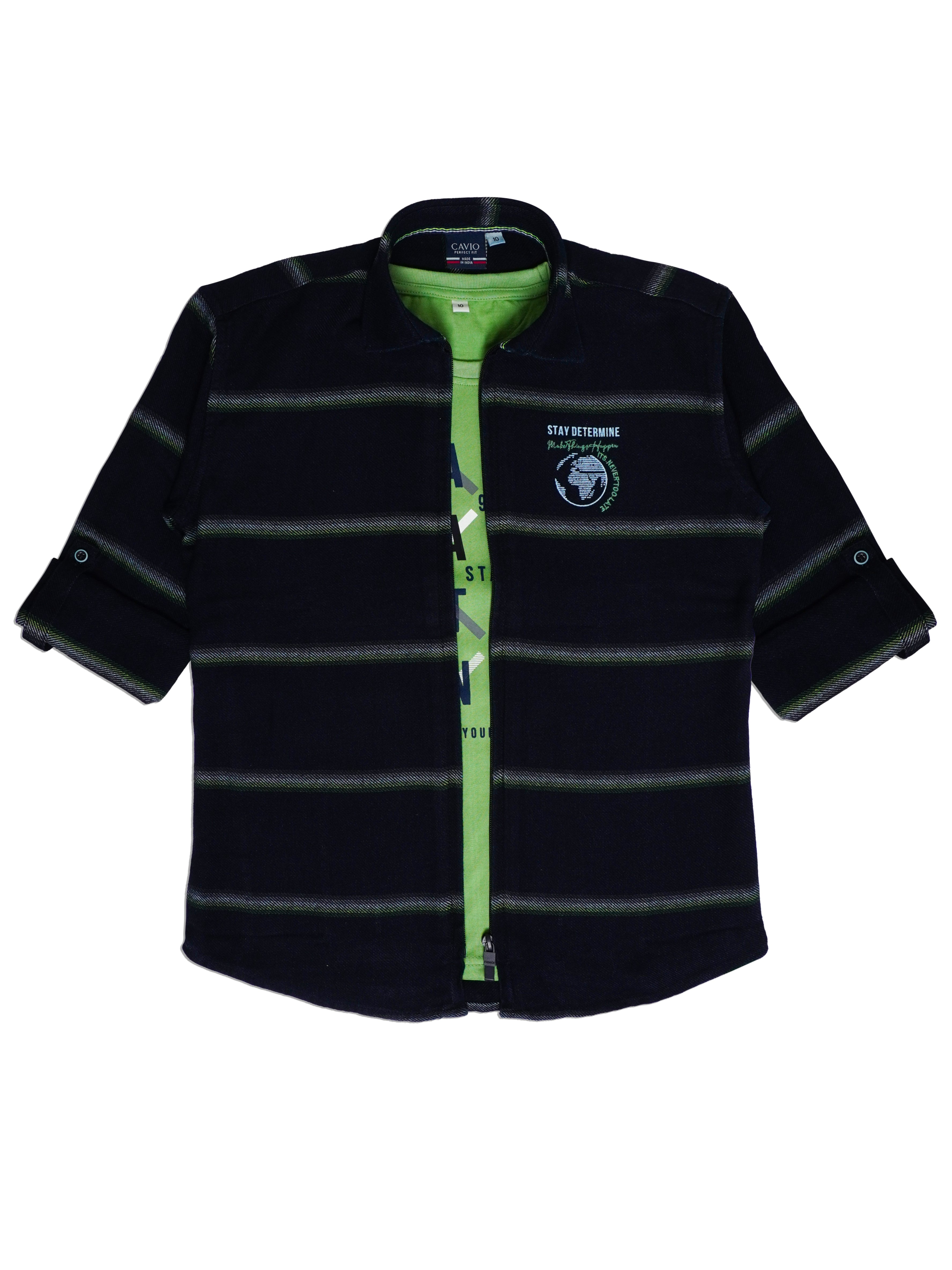 Green & black horizontal striped opaque casual shirt with t-shirt ,has a spread collar, zip, no pocket, long roll-up sleeves, curved hem