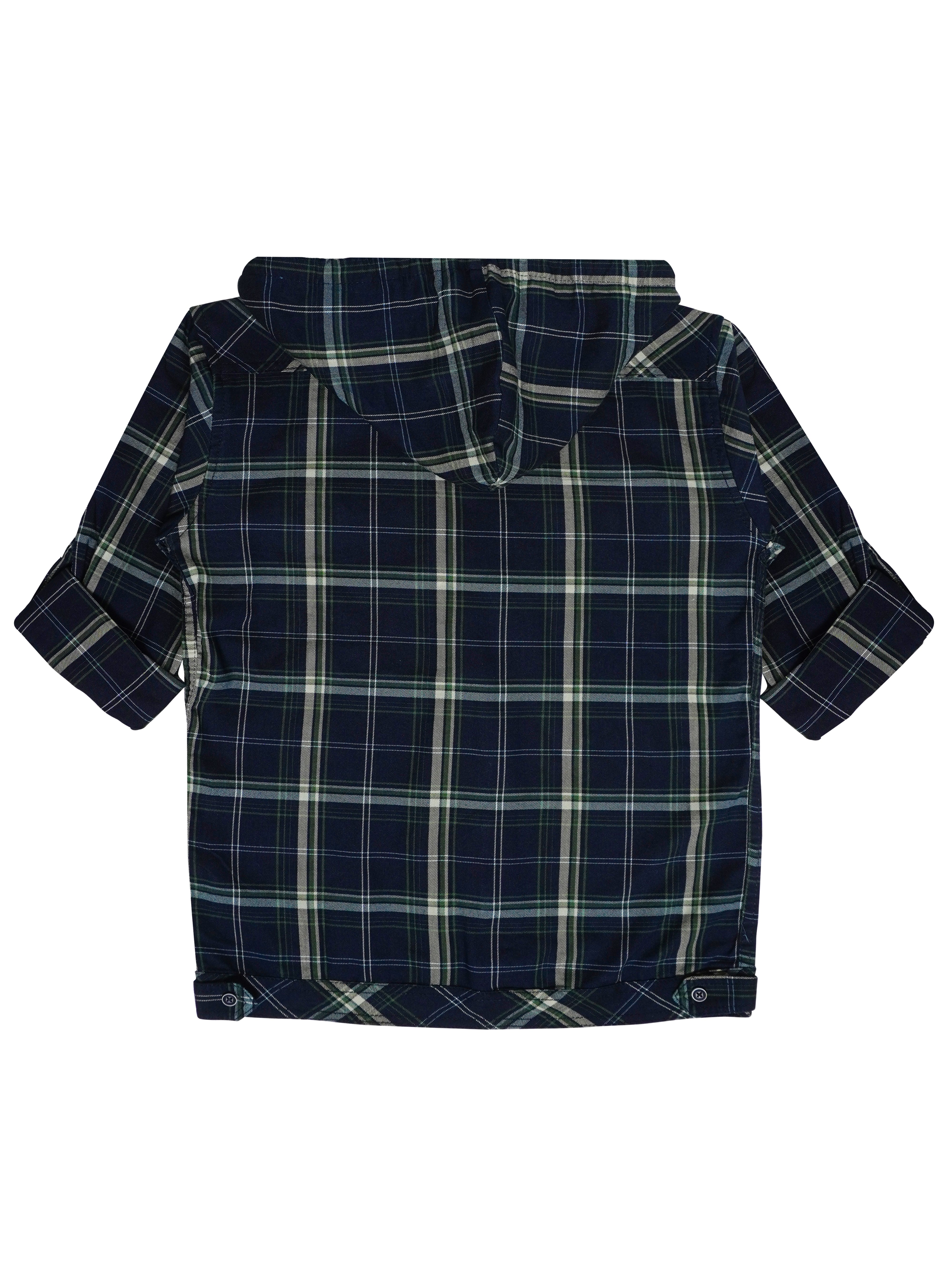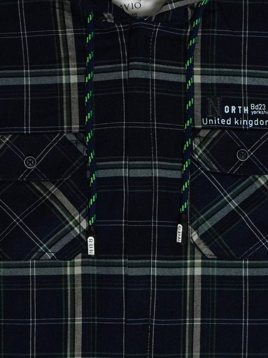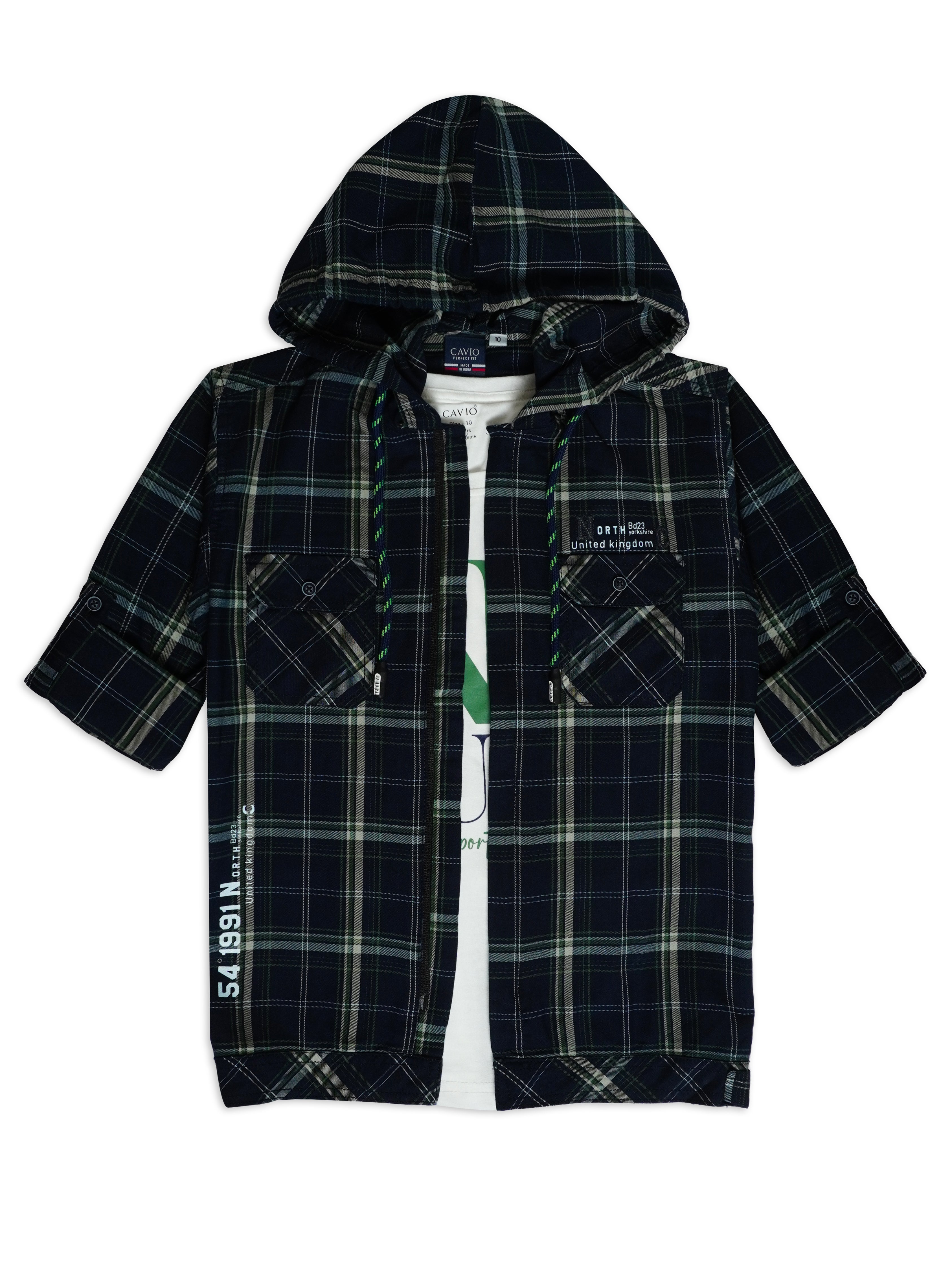 Green & white tartan checked opaque casual shirt with t-shirt ,has a hooded, zip, 2 flap pocket, long regular sleeves, curved hem
