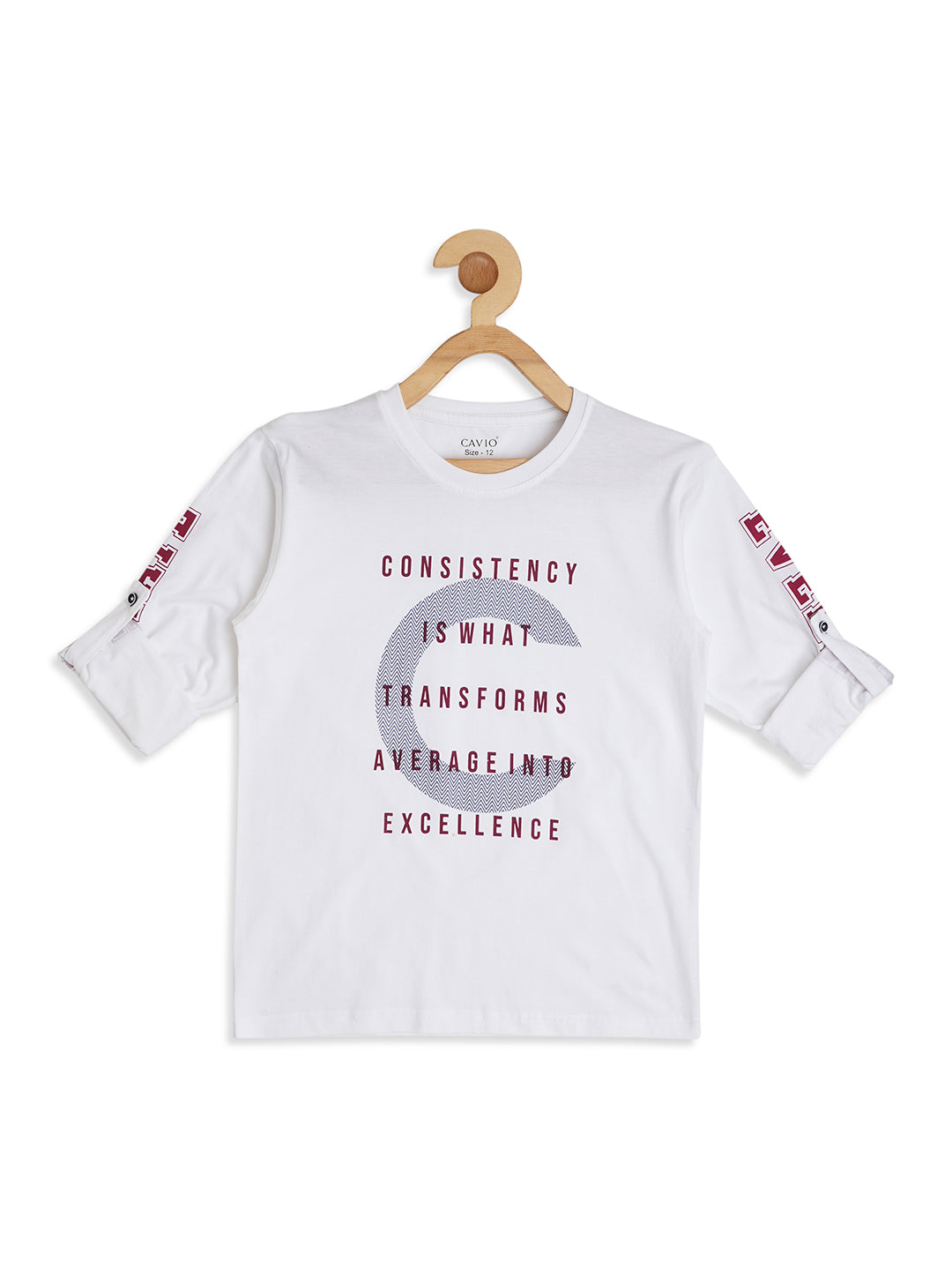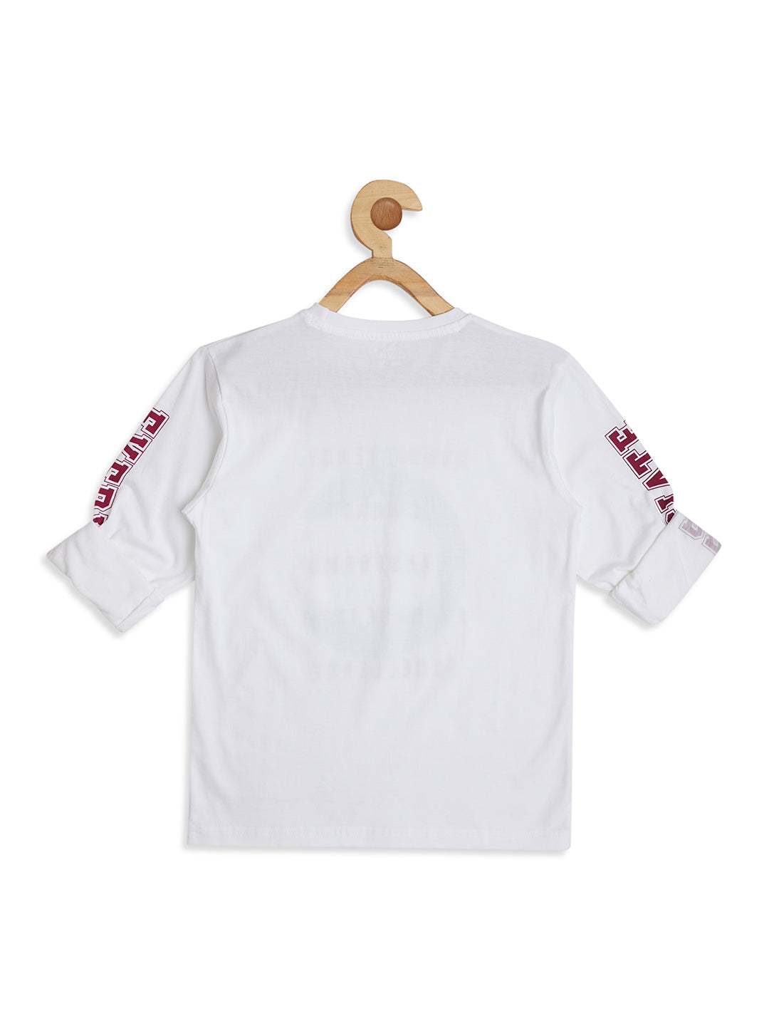 Comes with a white typography printed long roll-up sleeves T-shirt