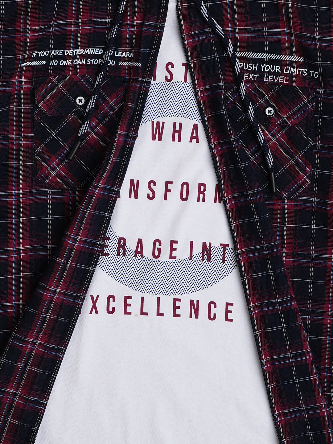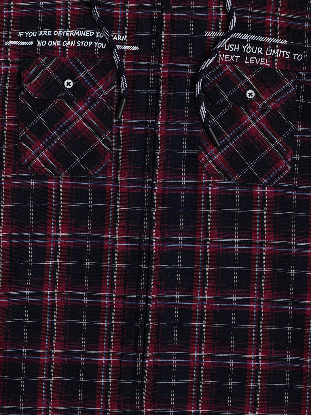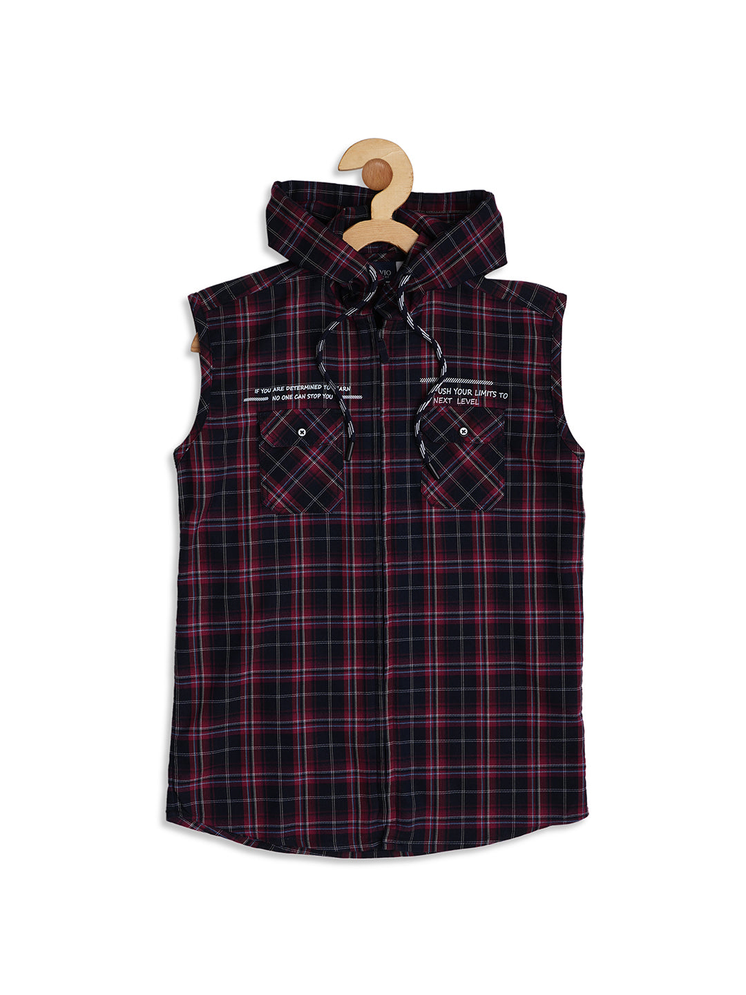 Maroon tartan checked opaque Casual shirt ,has a hood, zip, 2 pocket, sleeveless, straight hem.