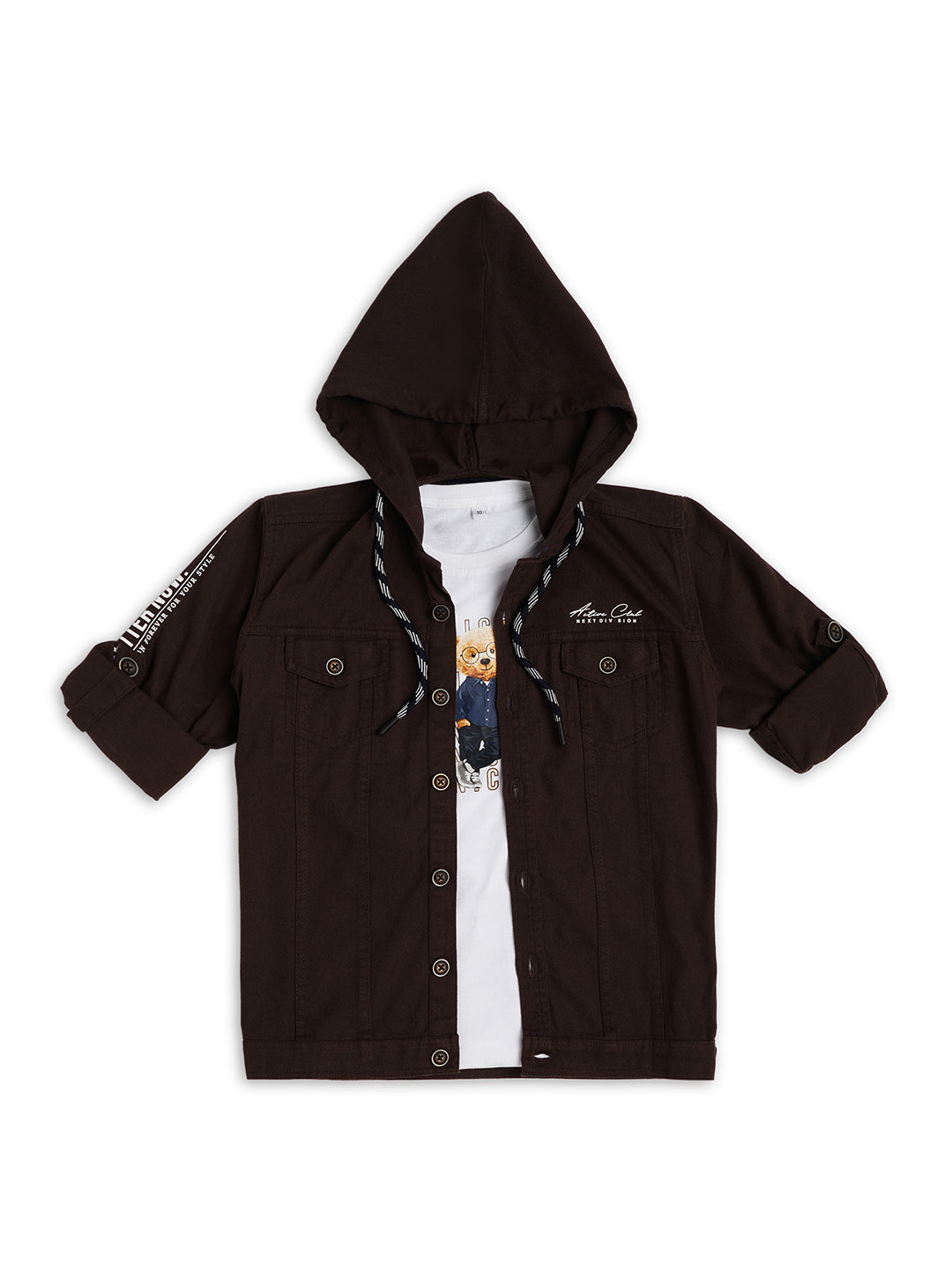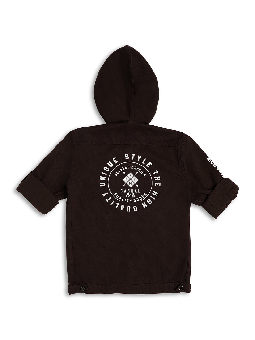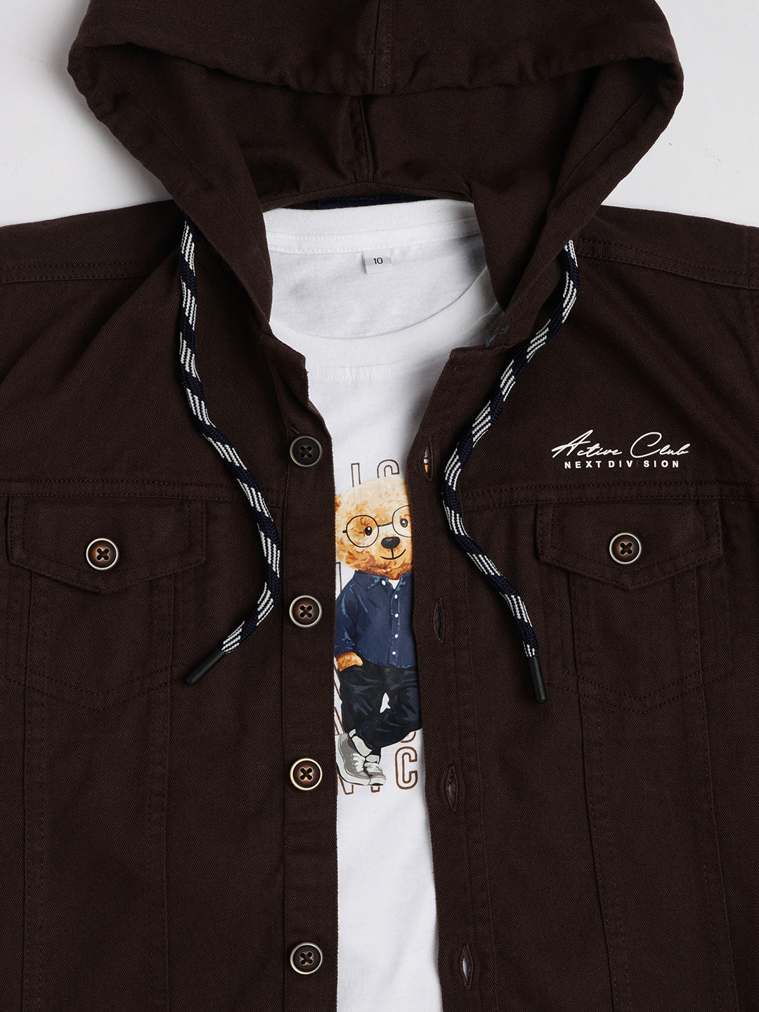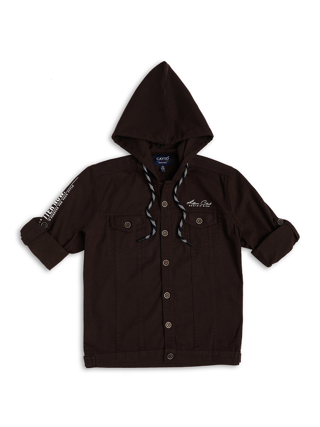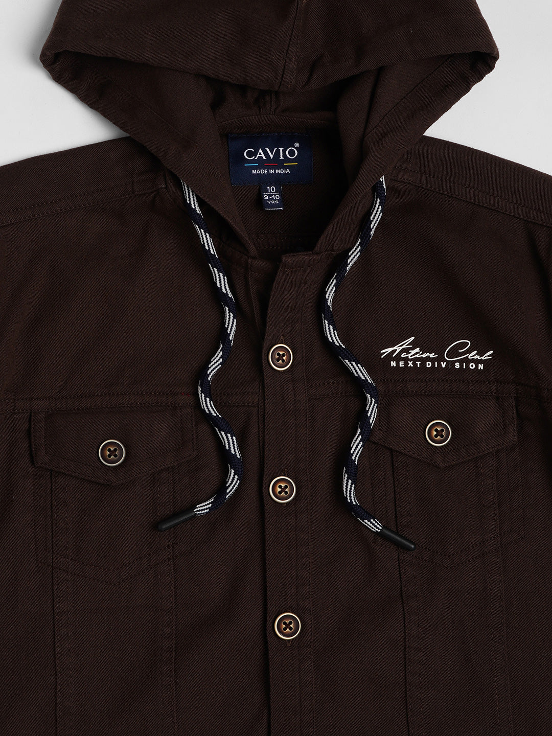 Maroon solid opaque casual shirt ,has a hooded , button placket, 2 flap pocket, long roll-up sleeves, straight hem