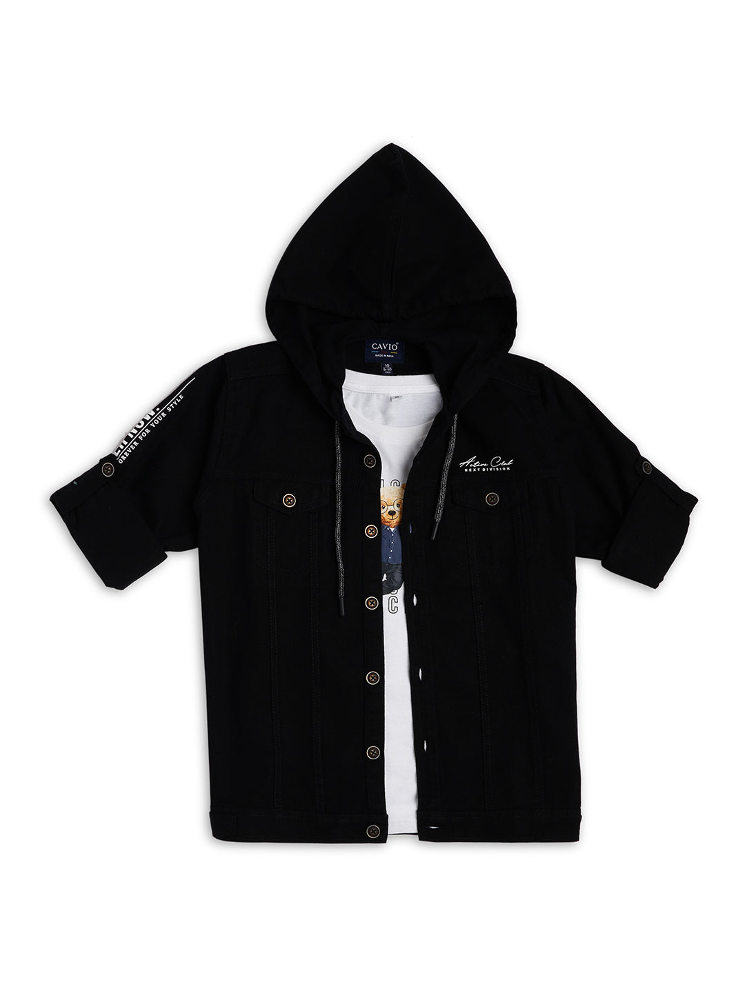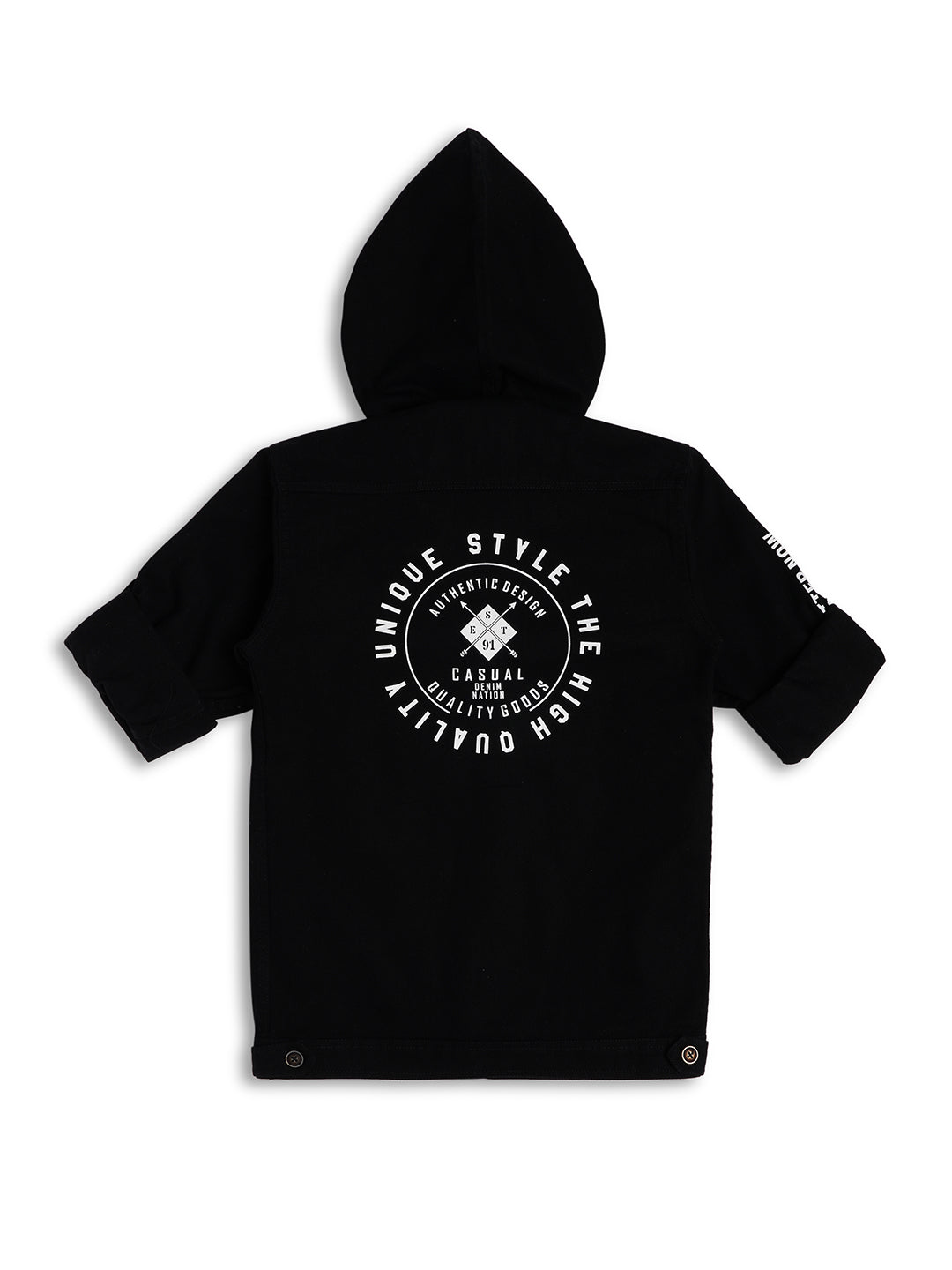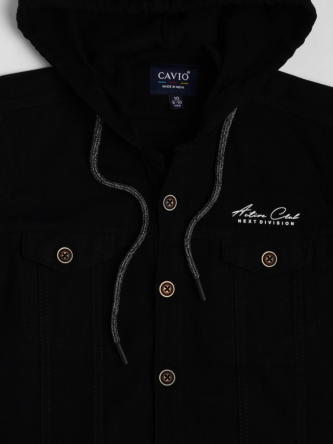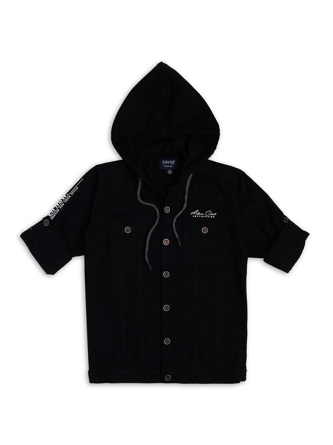 Black solid opaque casual shacket,has a hood, button placket, 2 flap pockets, long roll up sleeves, straight hem