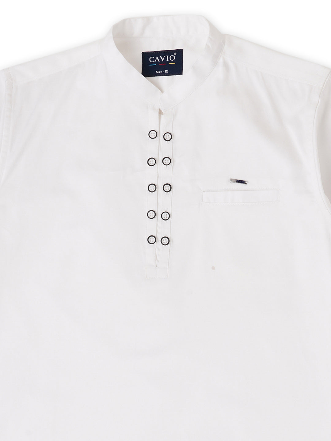 White solid Casual shirt ,has a mandarin collar, button placket, long roll-up sleeves, curved hem