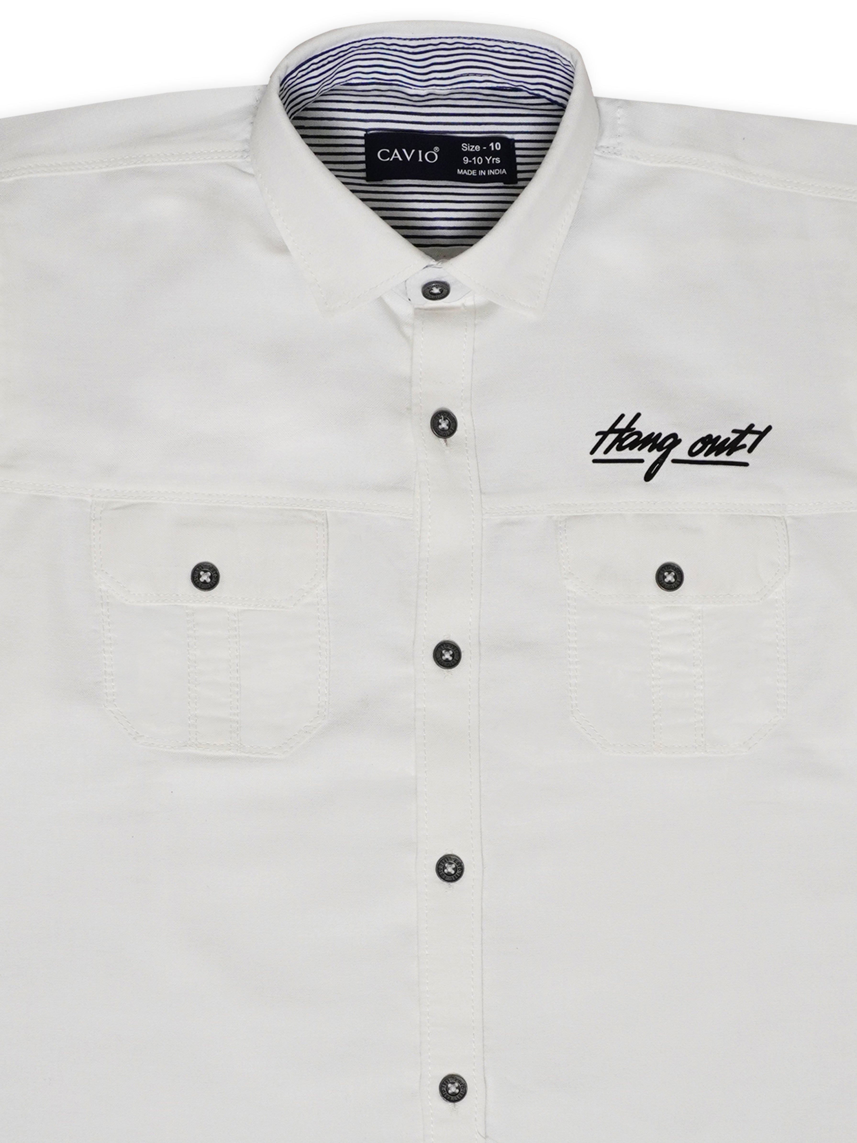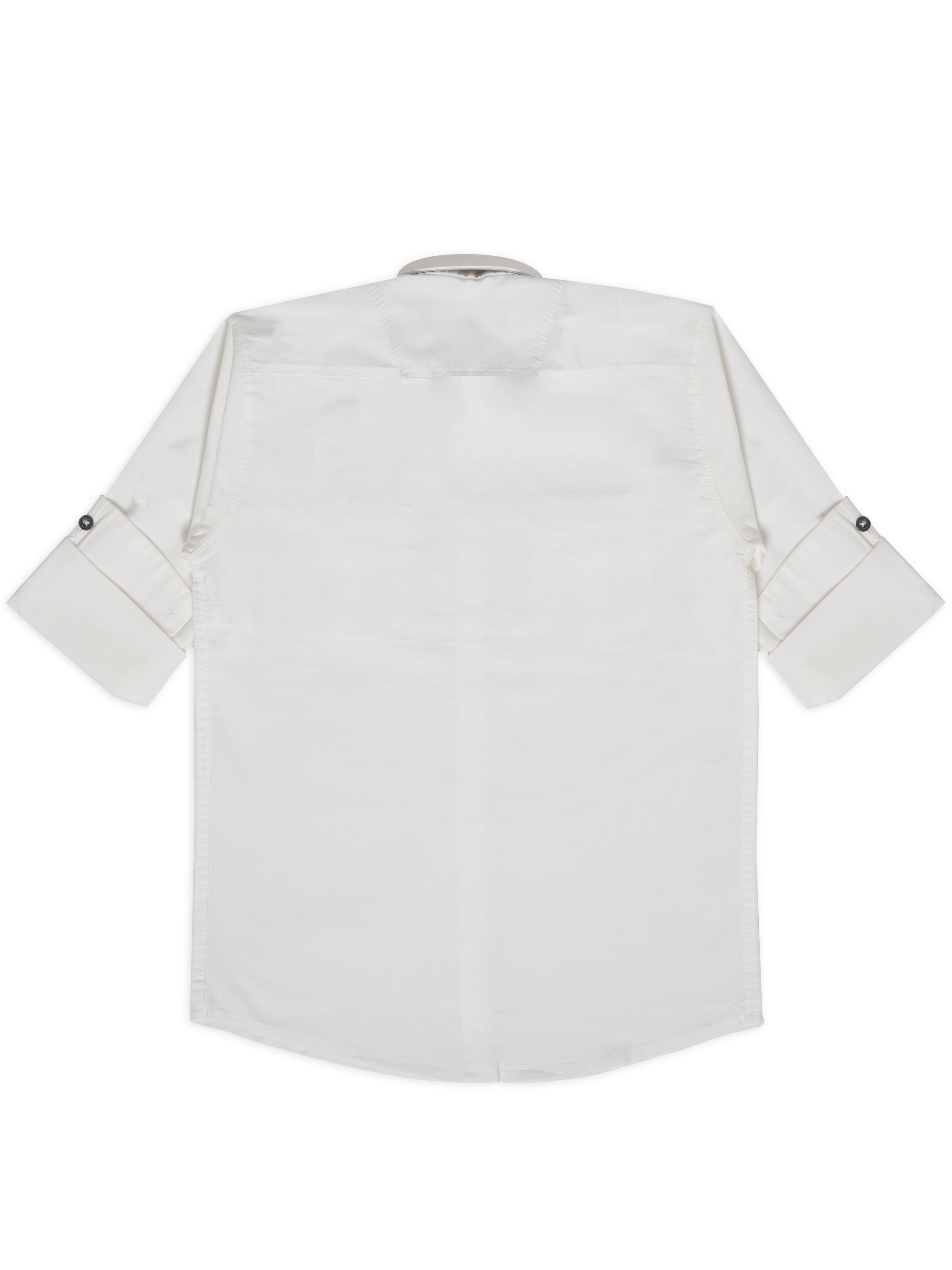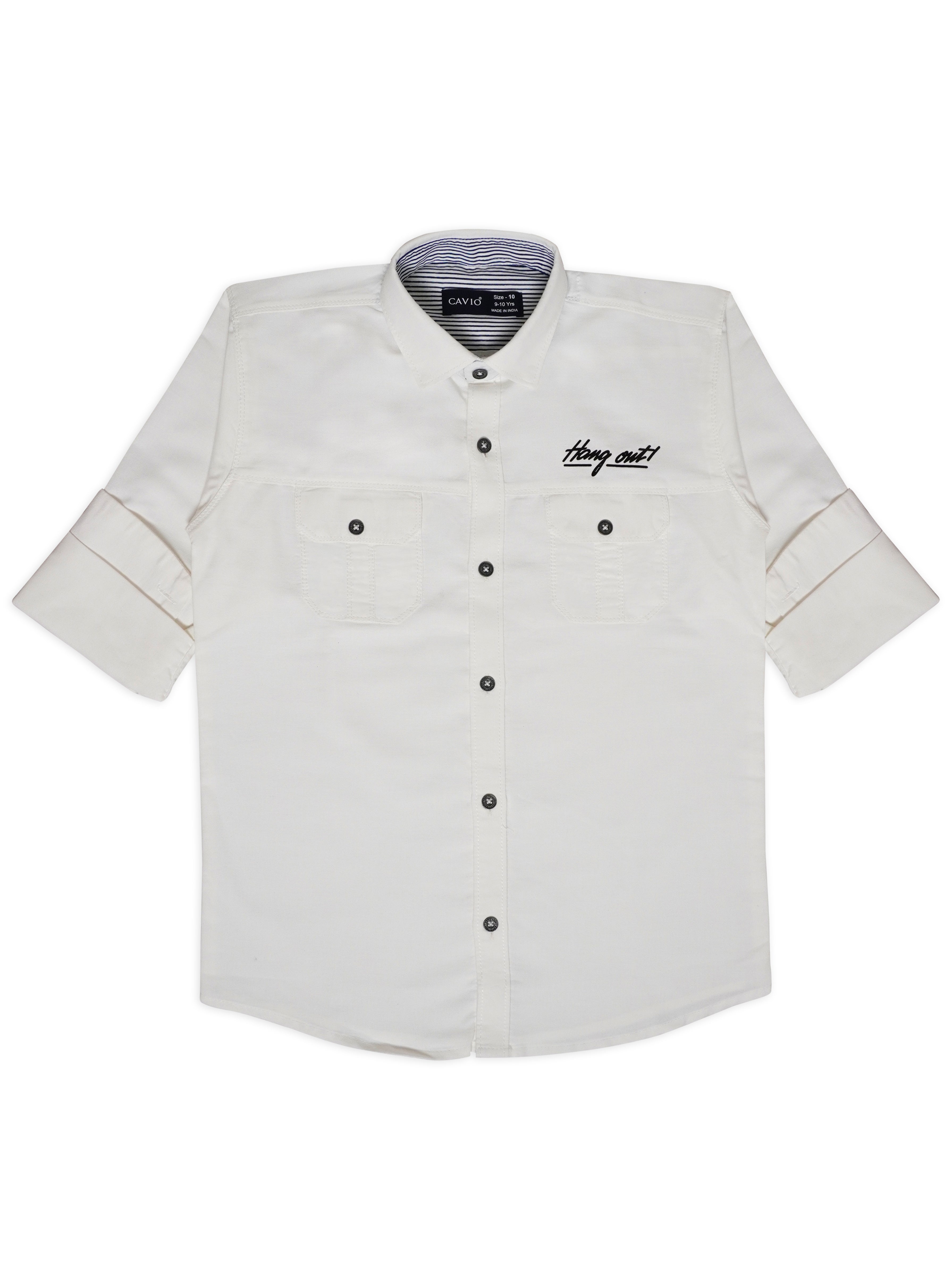 White solid opaque casual shirt, has a spread collar, button placket, 2 flap pocket, long regular sleeves, curved hem