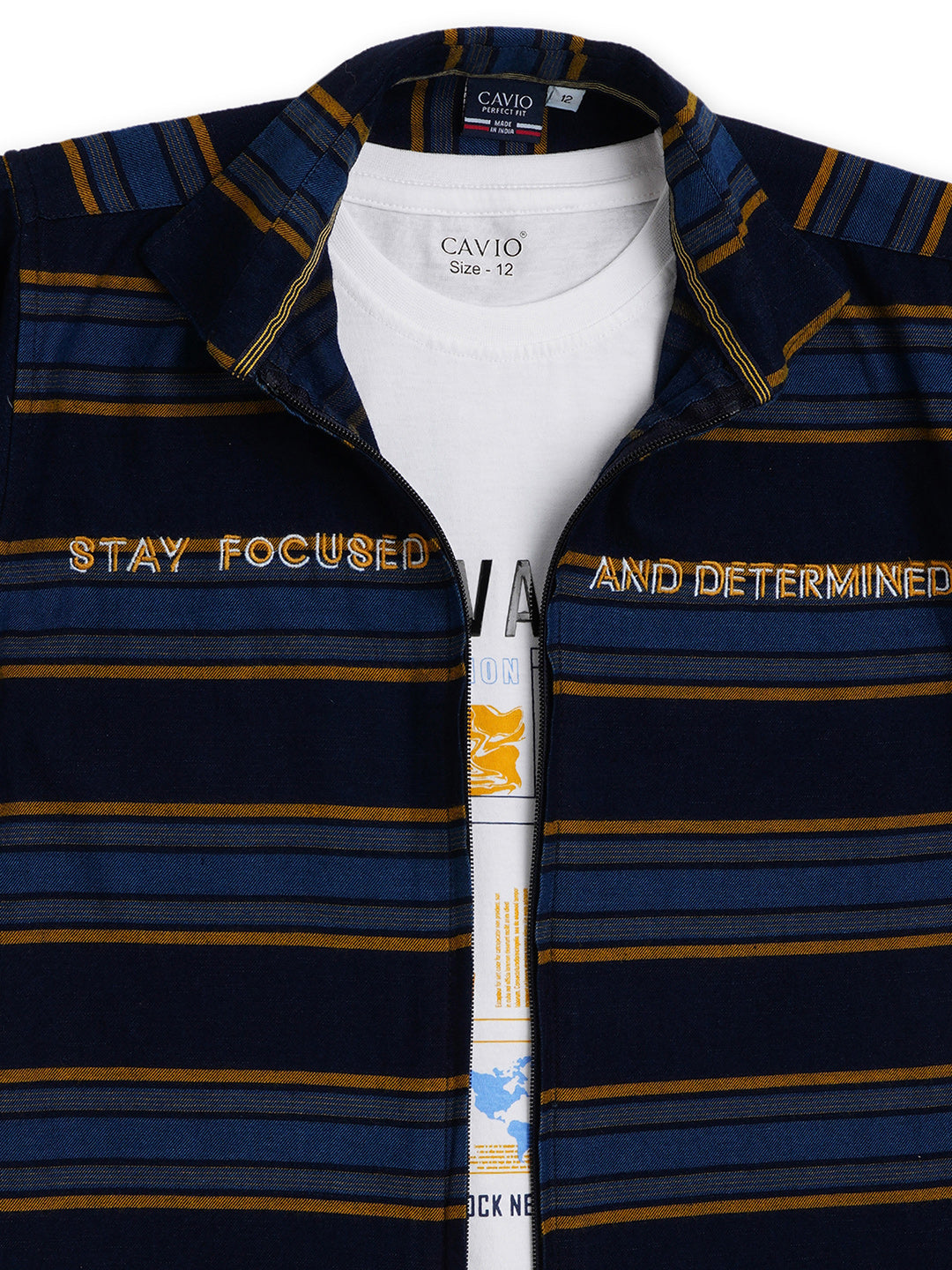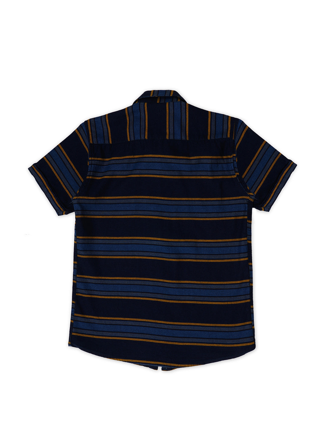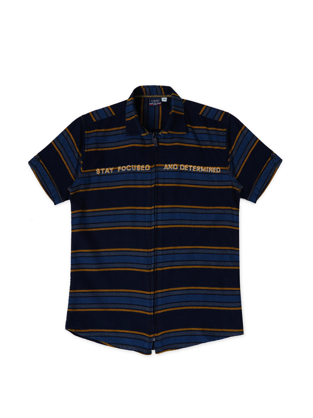 Navy blue, gold-toned & white horizontal stripes opaque casual shirt ,has a spread collar, zip, short regular sleeves, curved hem