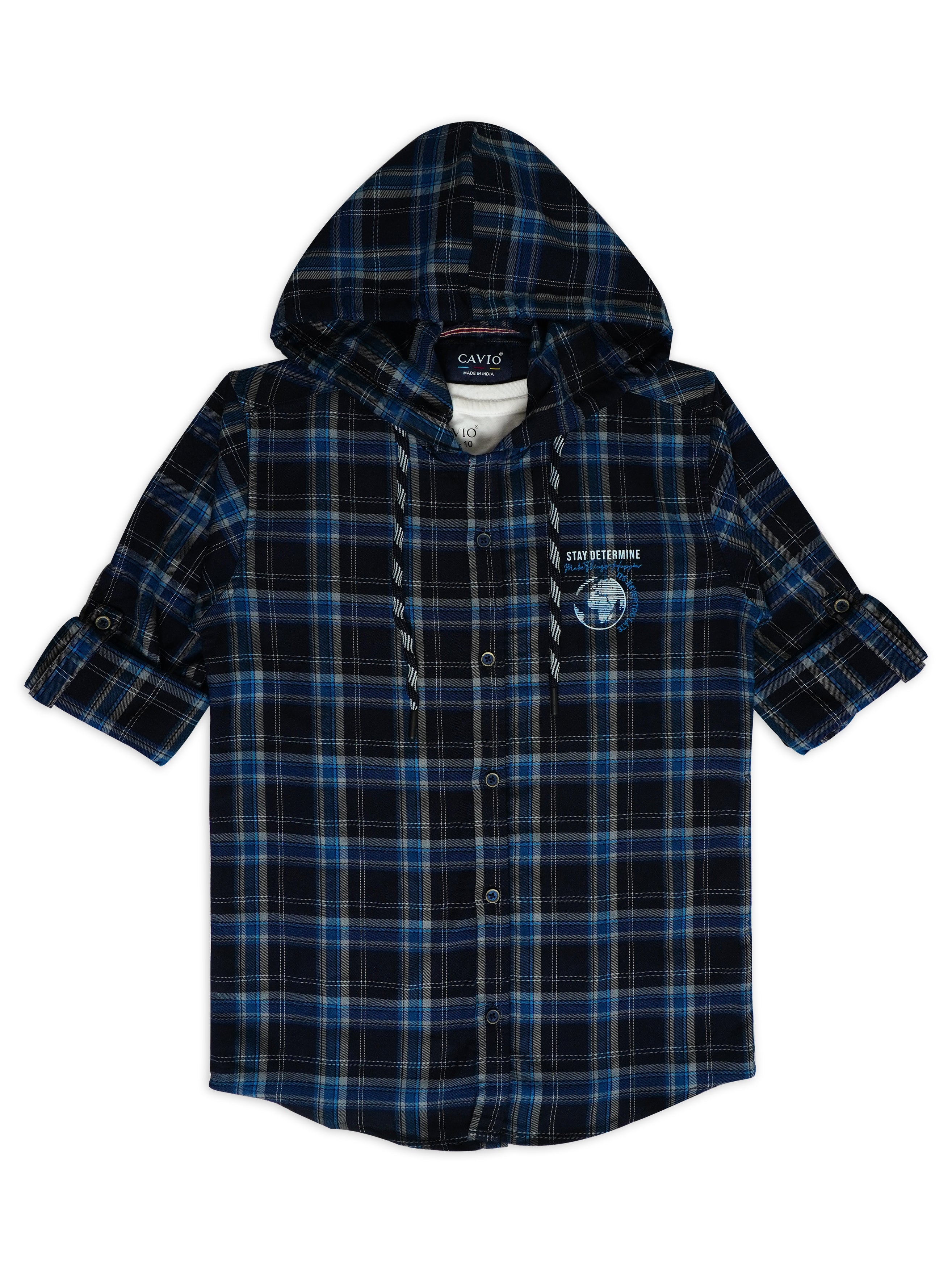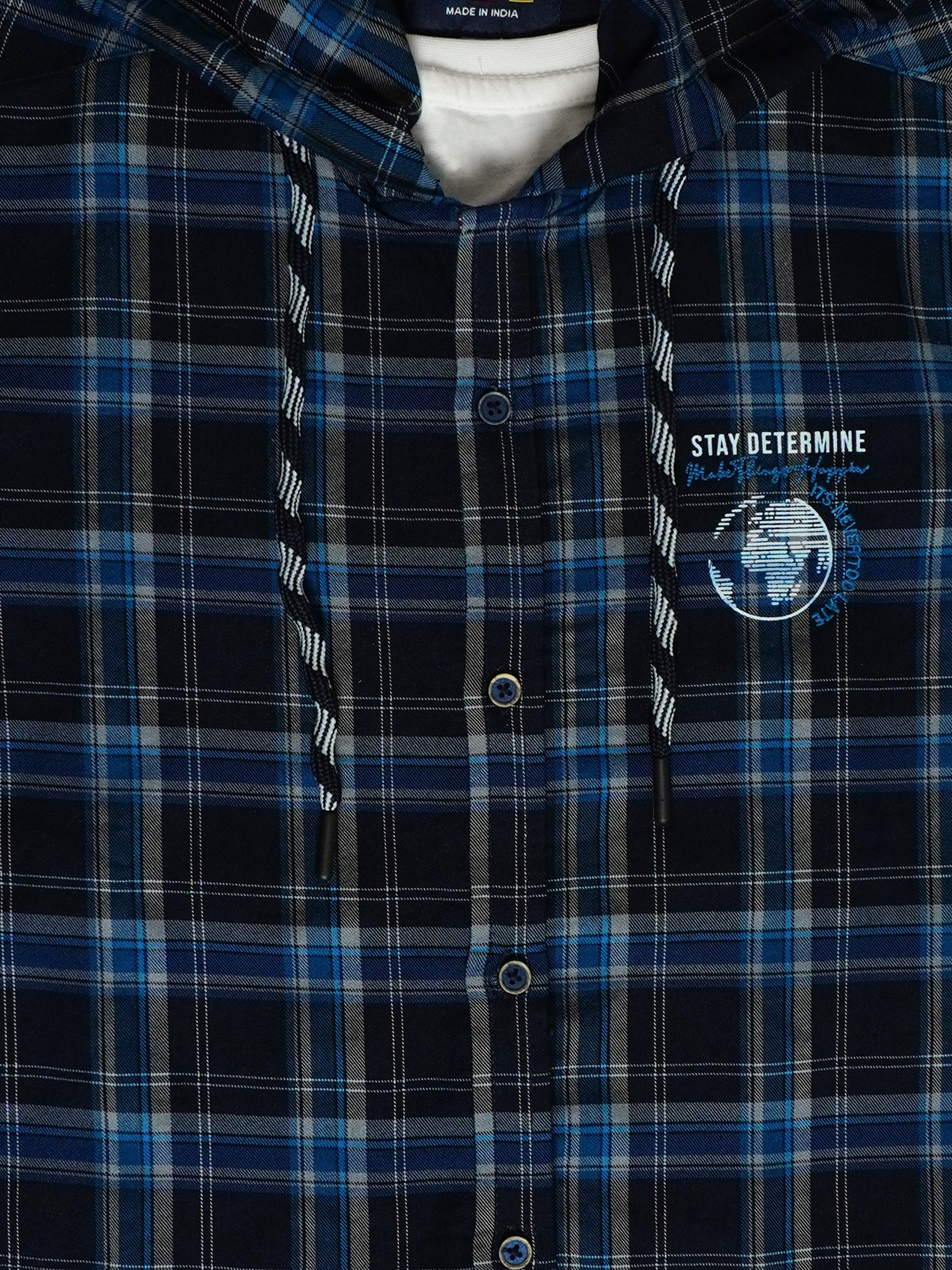 Blue tartan checks checked opaque casual shirt, has a hooded, button placket, long regular sleeves, straight hem