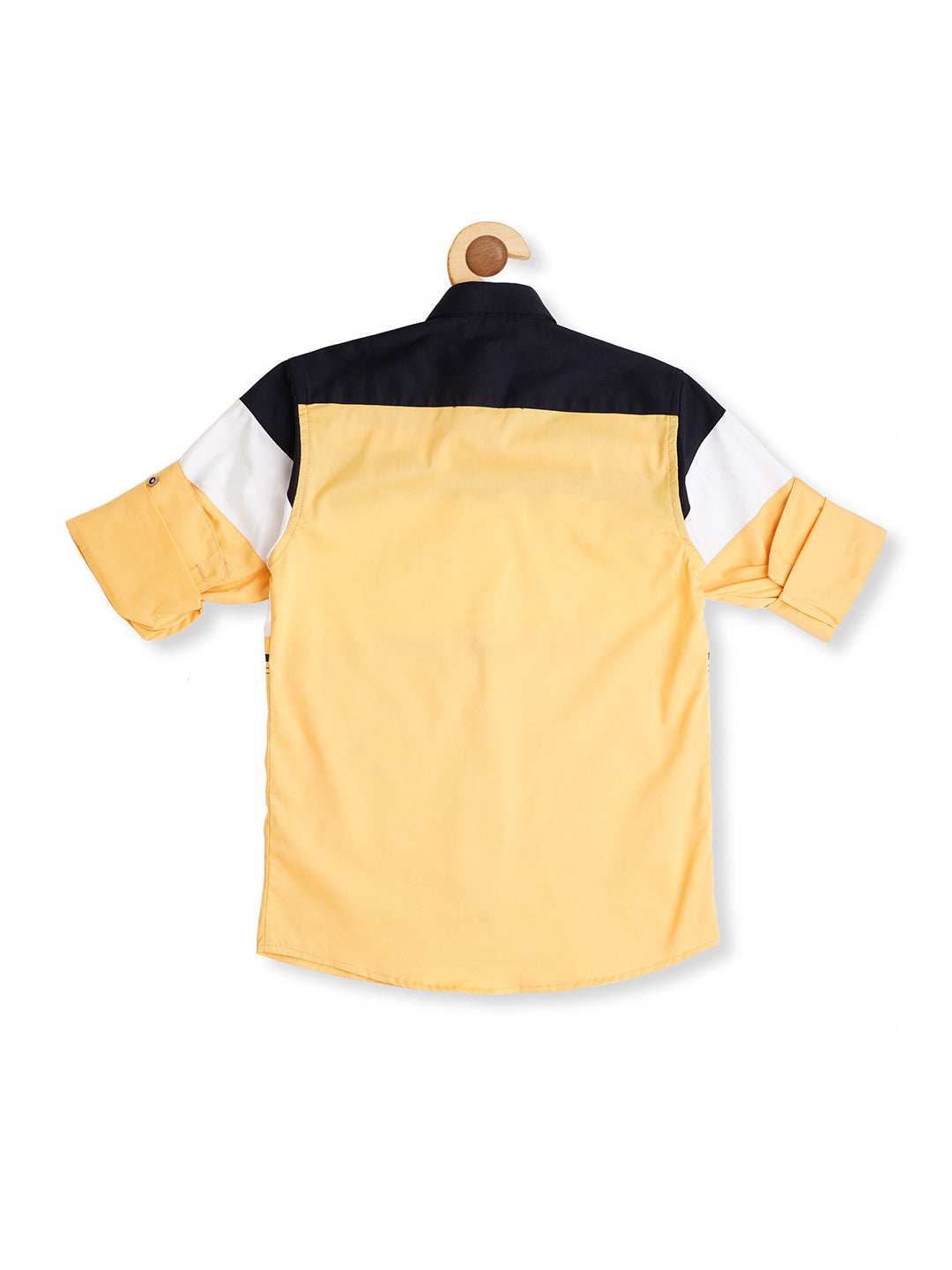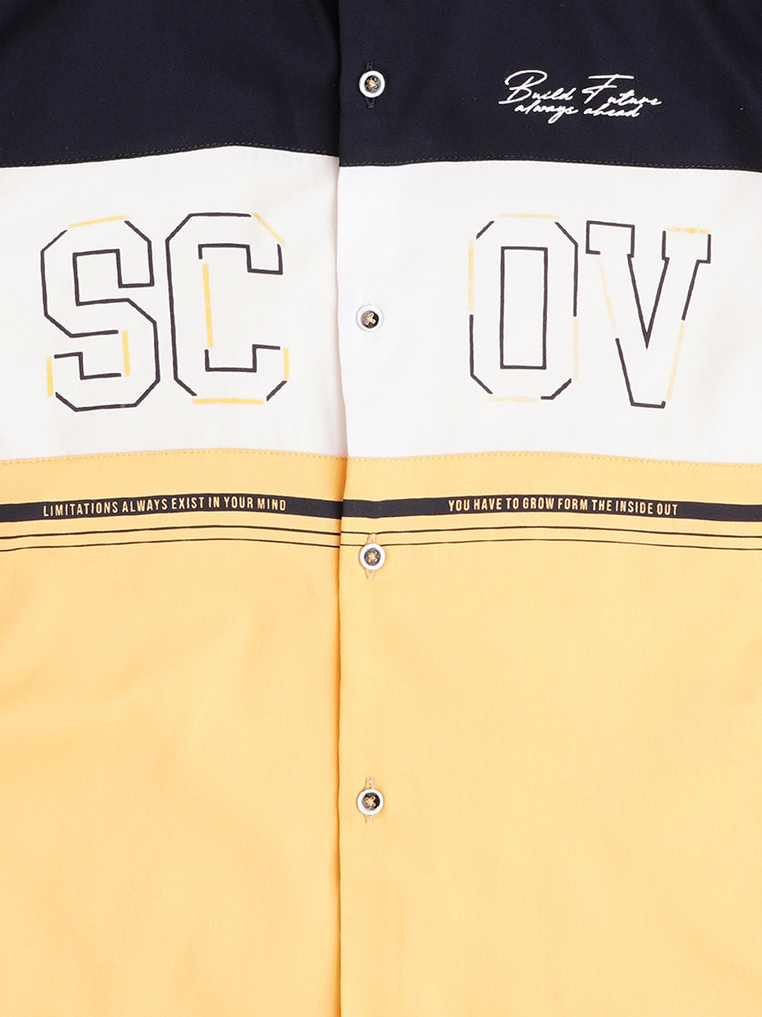 Yellow, black & white typography printed casual shirt, has a spread collar, button placket, long roll-up sleeves, curved hem