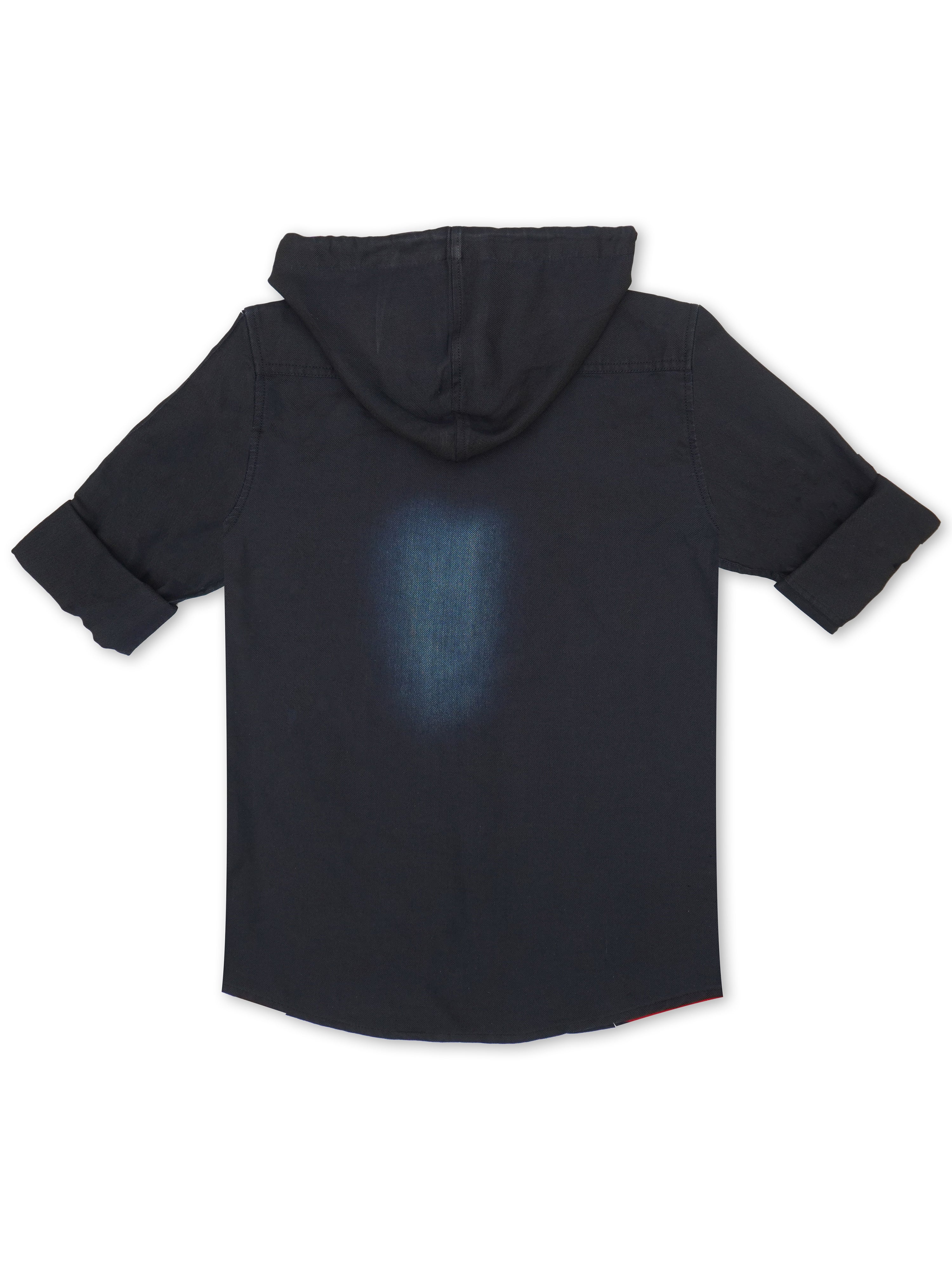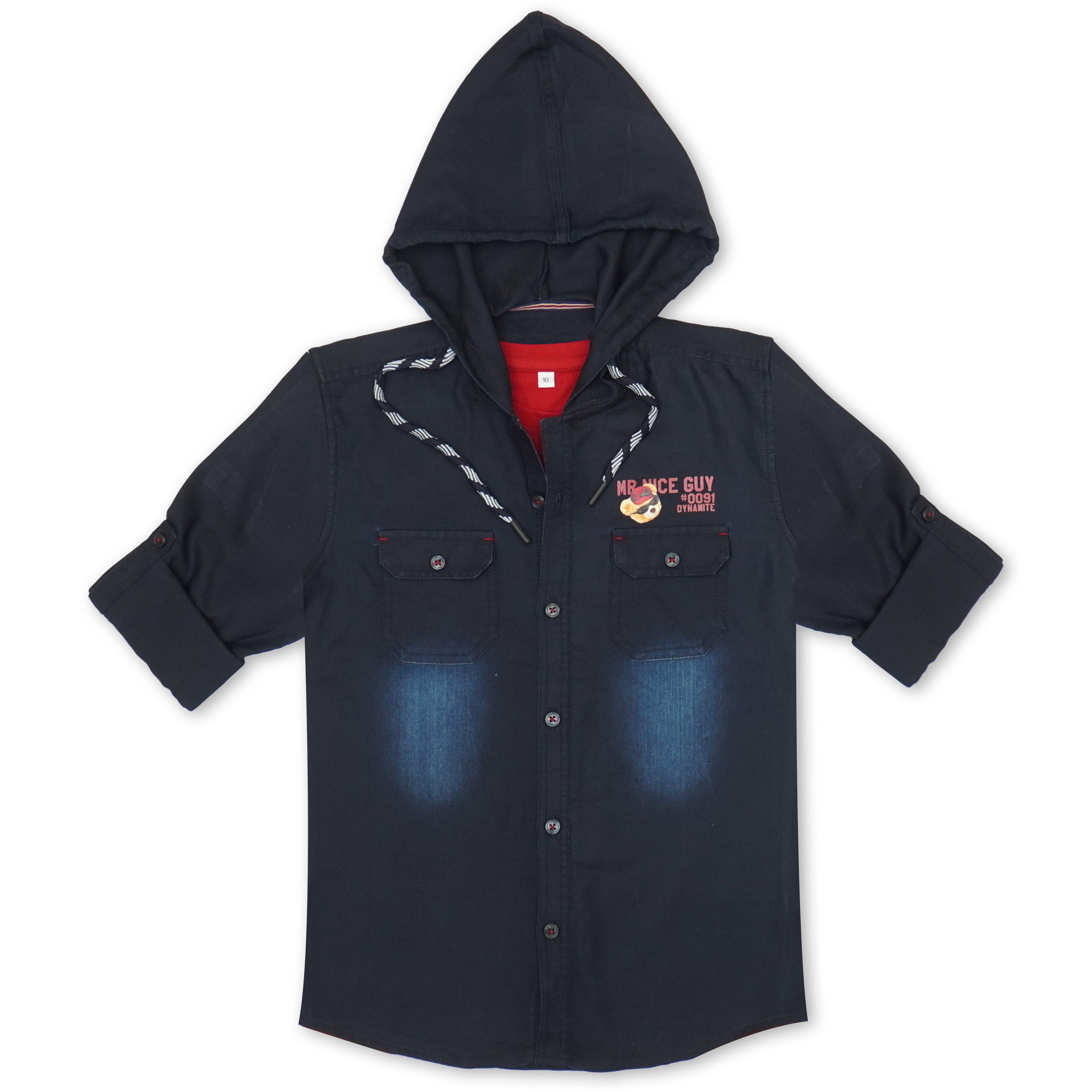 Navy blue faded opaque casual shirt, has a hooded collar, button placket, 2 flap pockets, long roll-up sleeves, curved hem