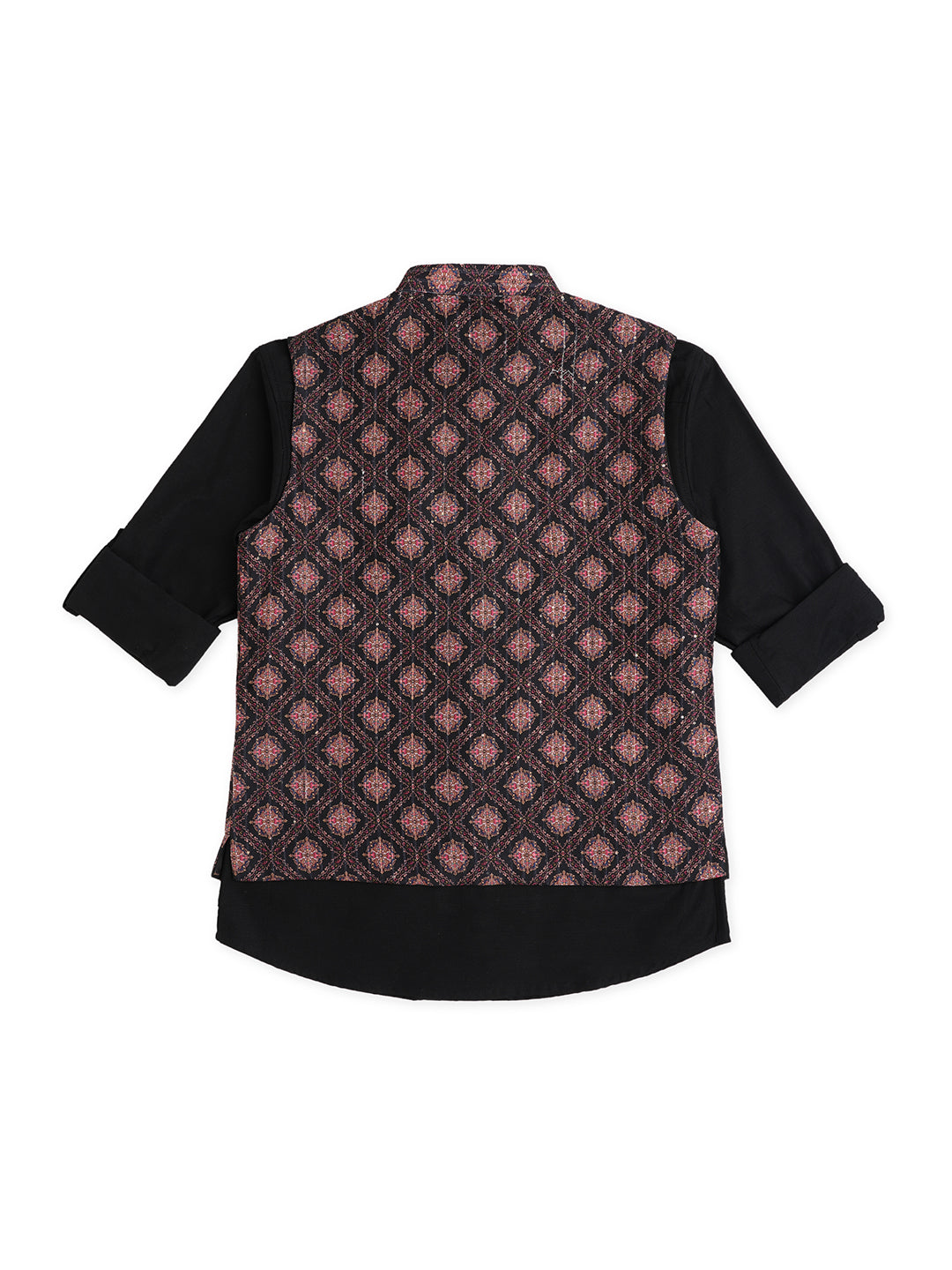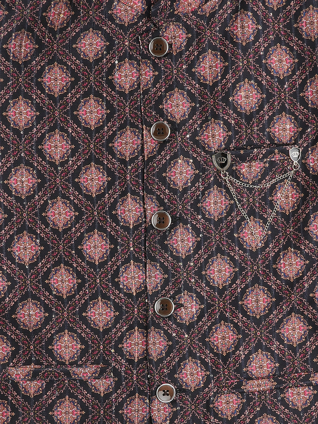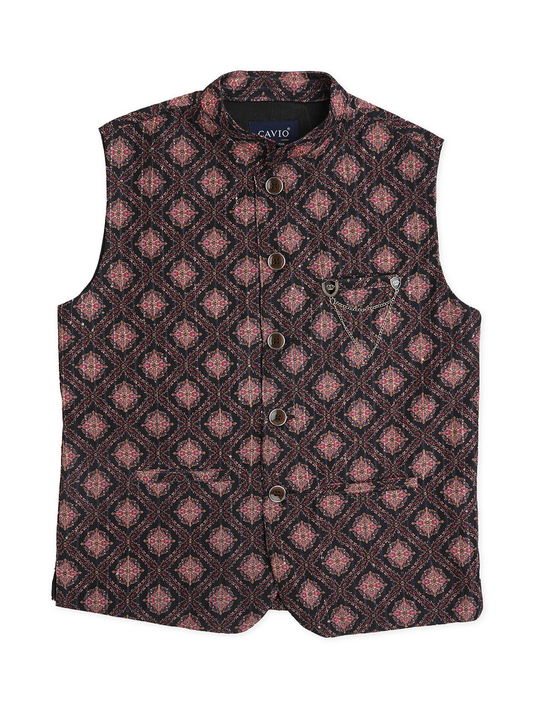 Black and brown woven design Nehru jacket, has mandarin collar, sleeveless, straight hem, and three pockets