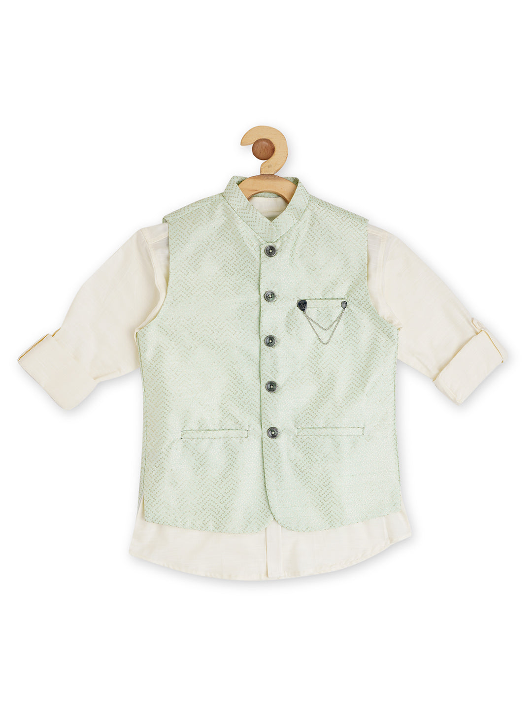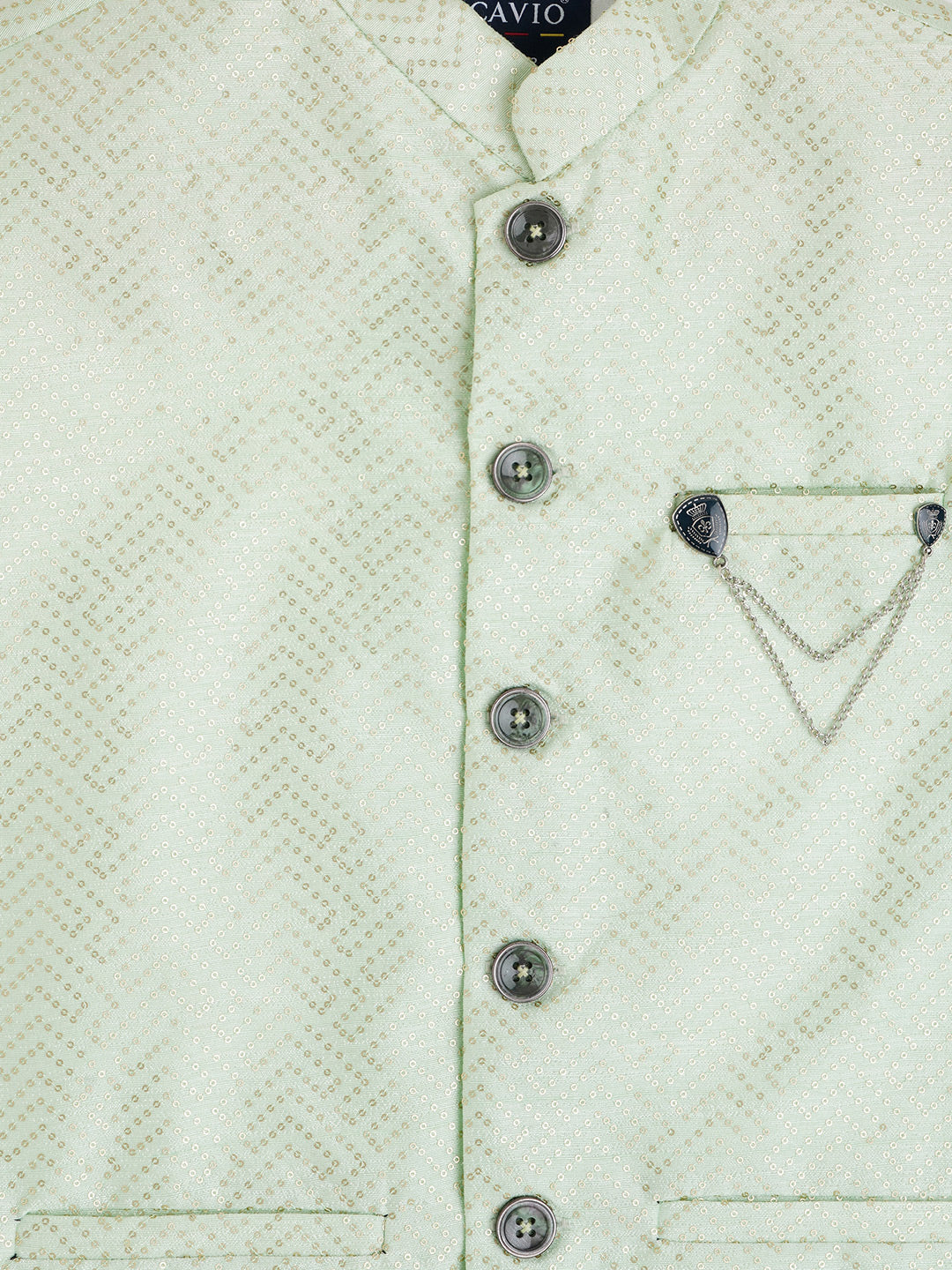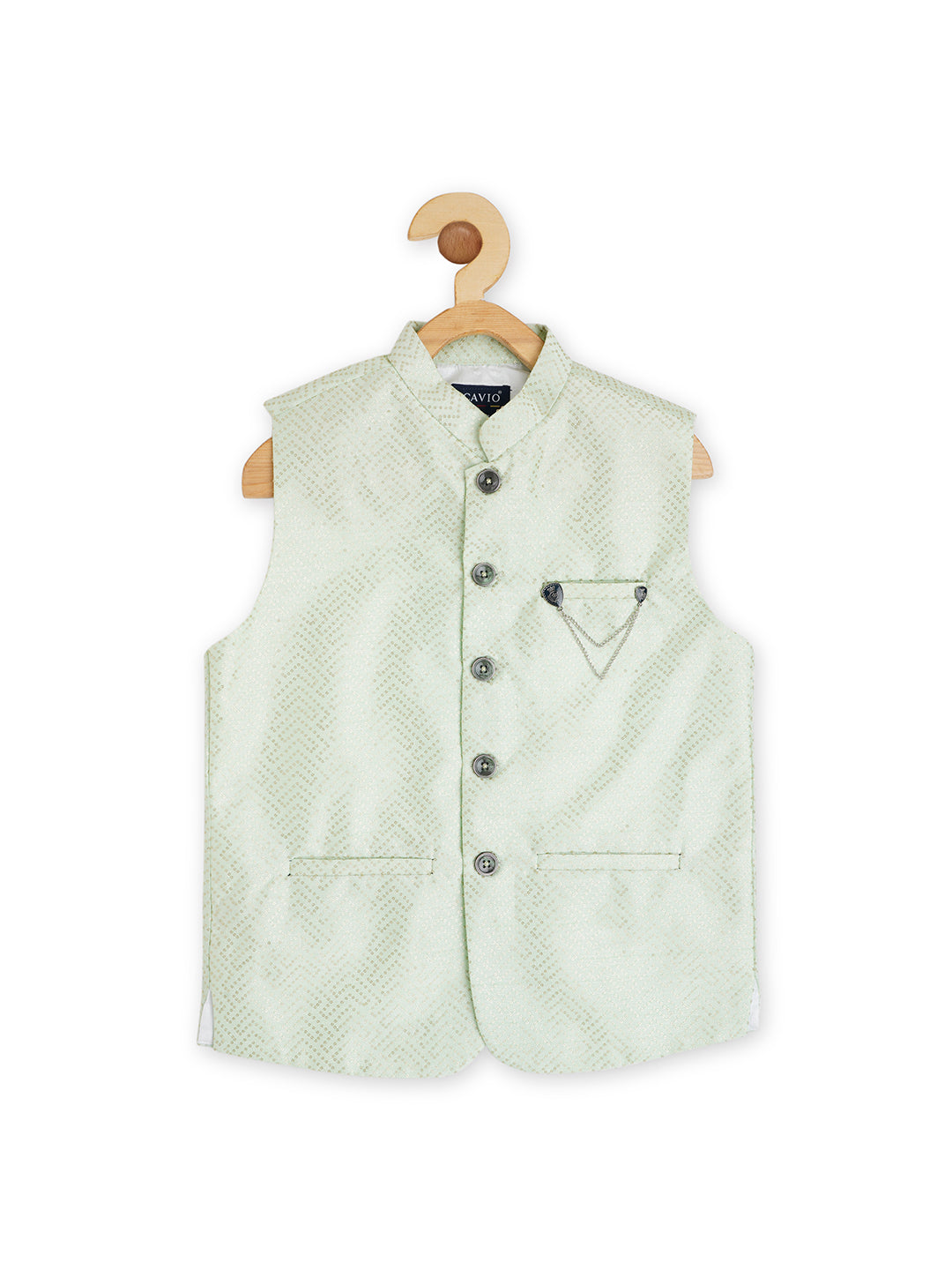 Sea green embellished slim-fit nehru jacket, has a mandarin collar, a button closure, sleeveless, side slits and three pockets