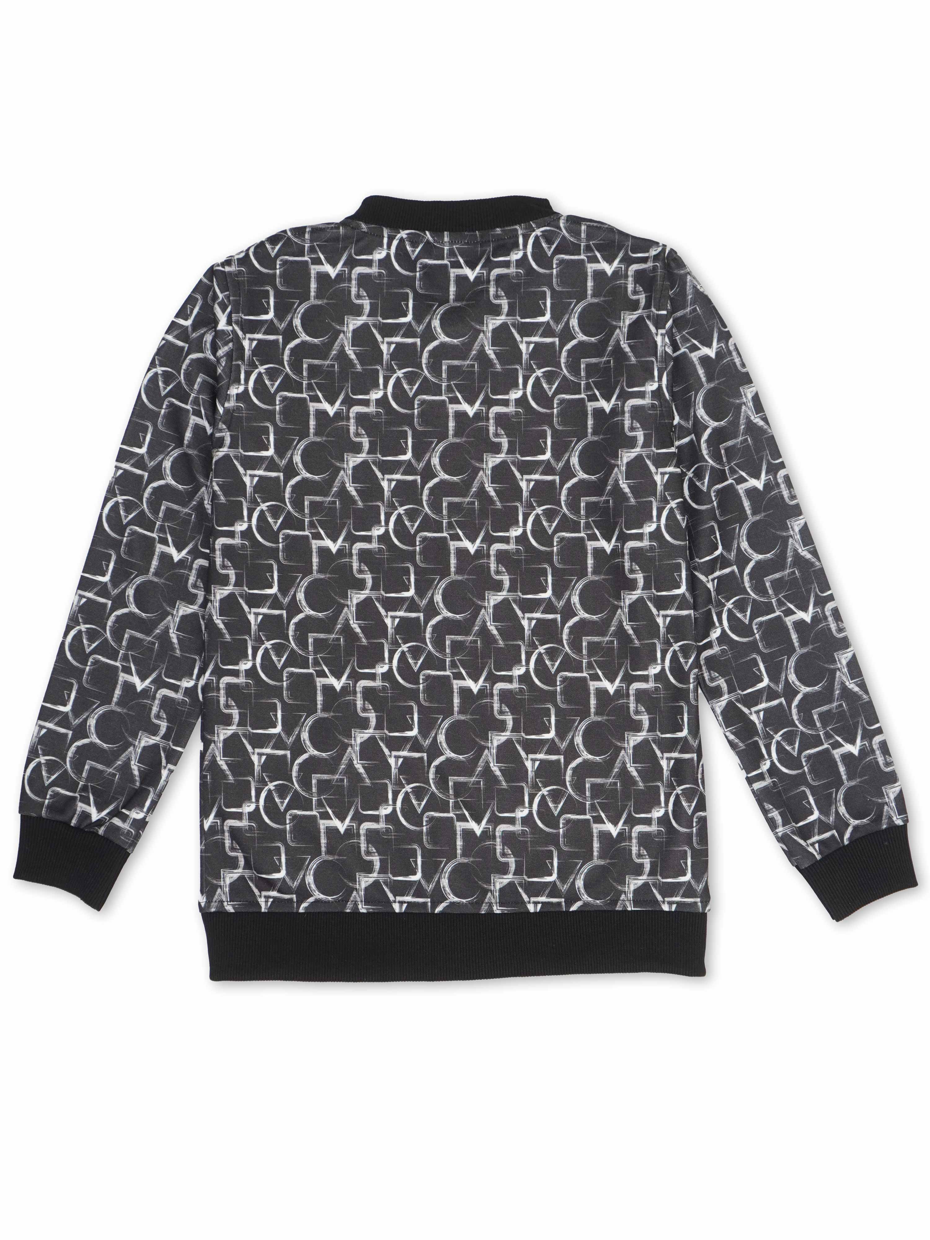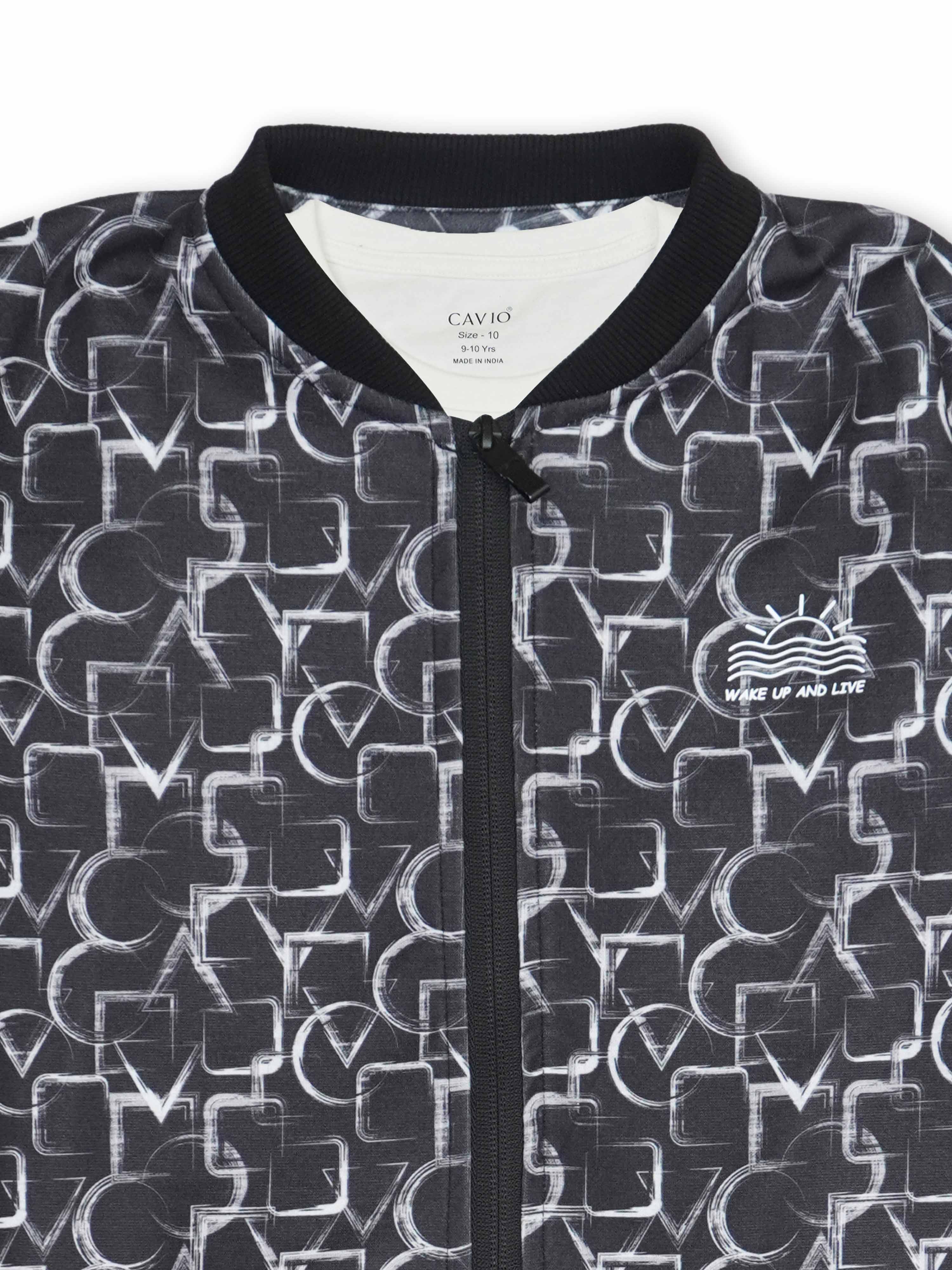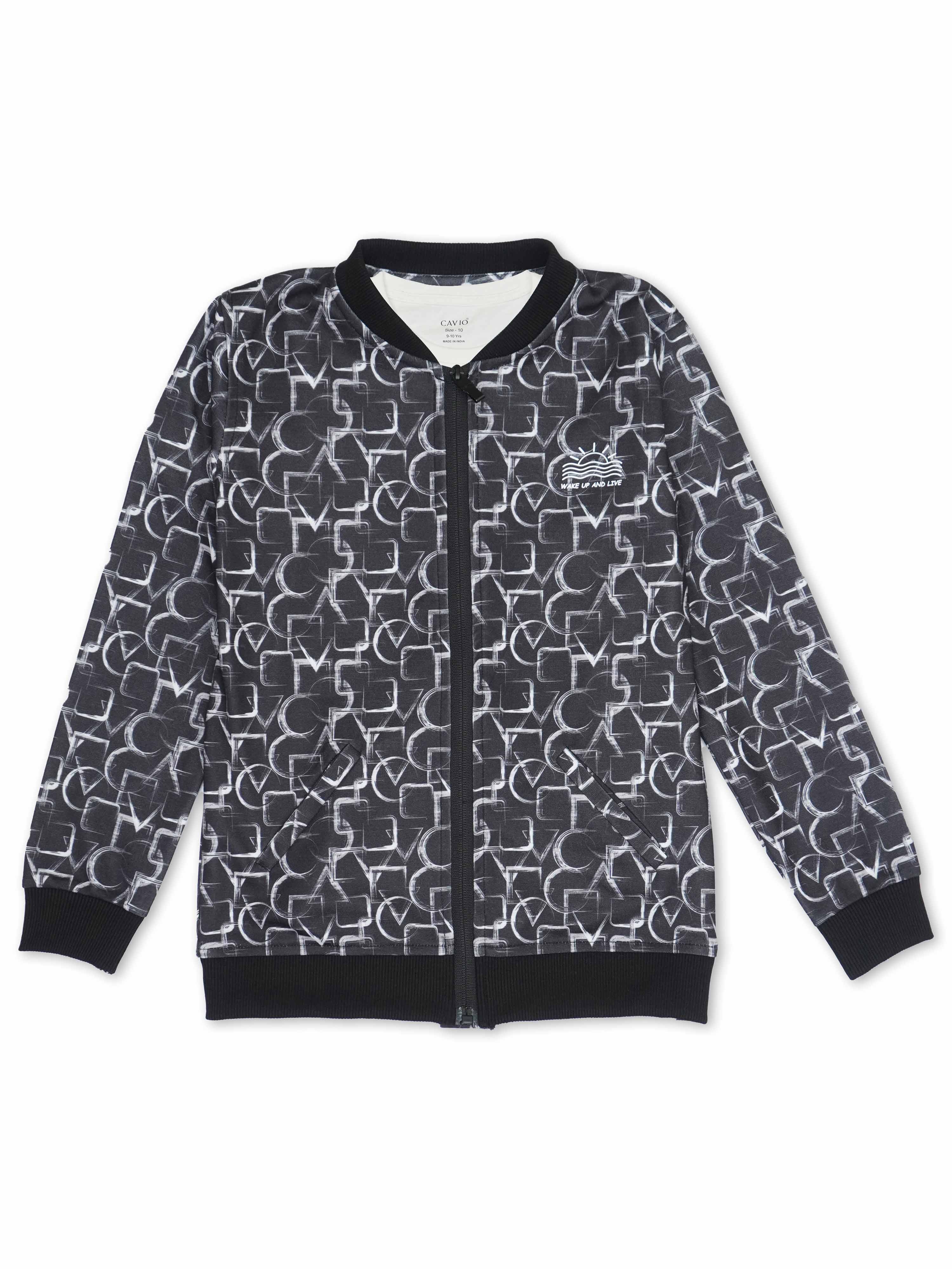 Black geometric printed lightweight bomber , has a stand,collar 2 pockets ,has a zip closure, long sleeves, straight hemline, cotton lining