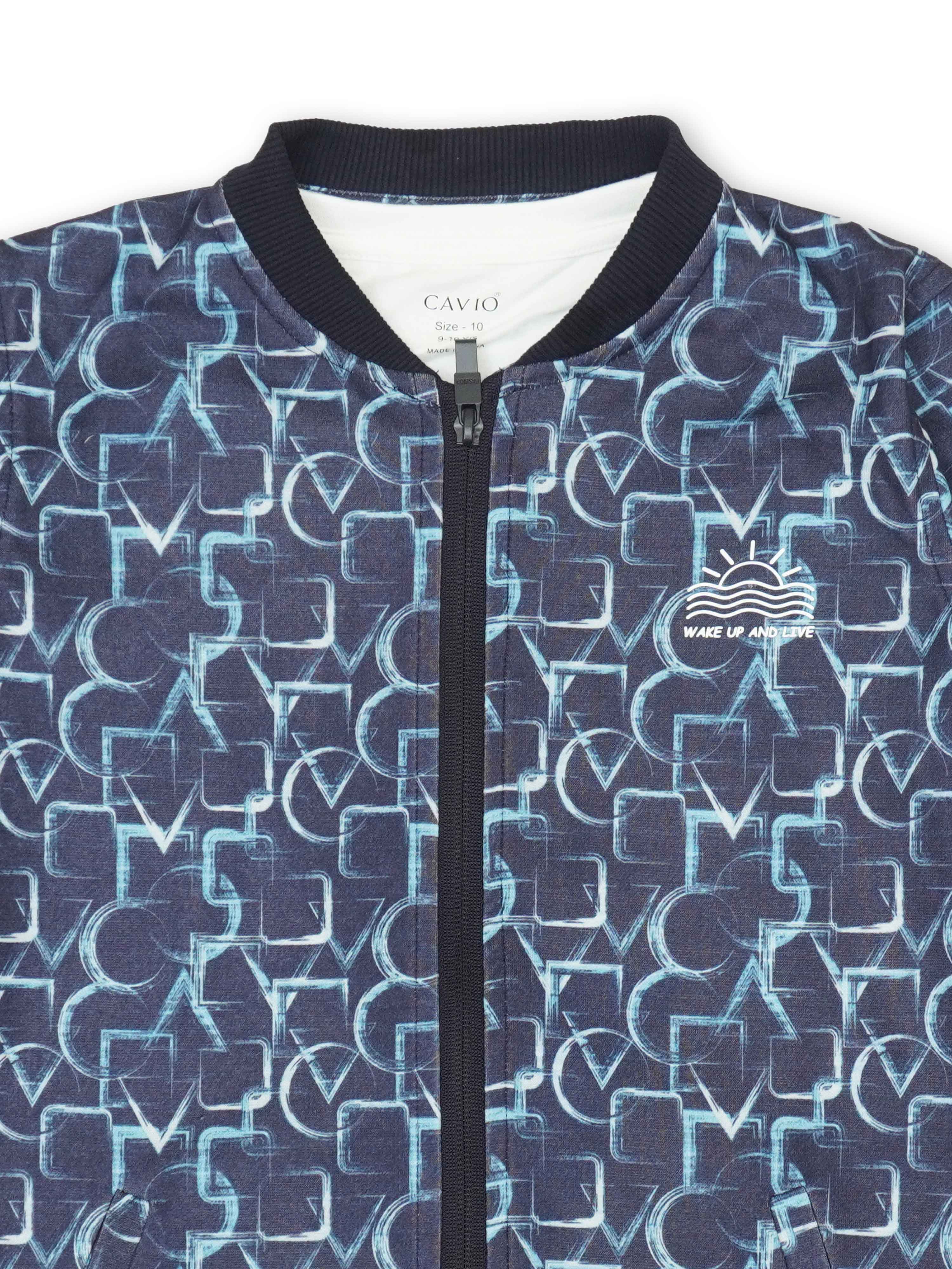 Blue geometric printed lightweight bomber , has a stand,collar 2 pockets ,has a zip closure, long sleeves, straight hemline, cotton lining