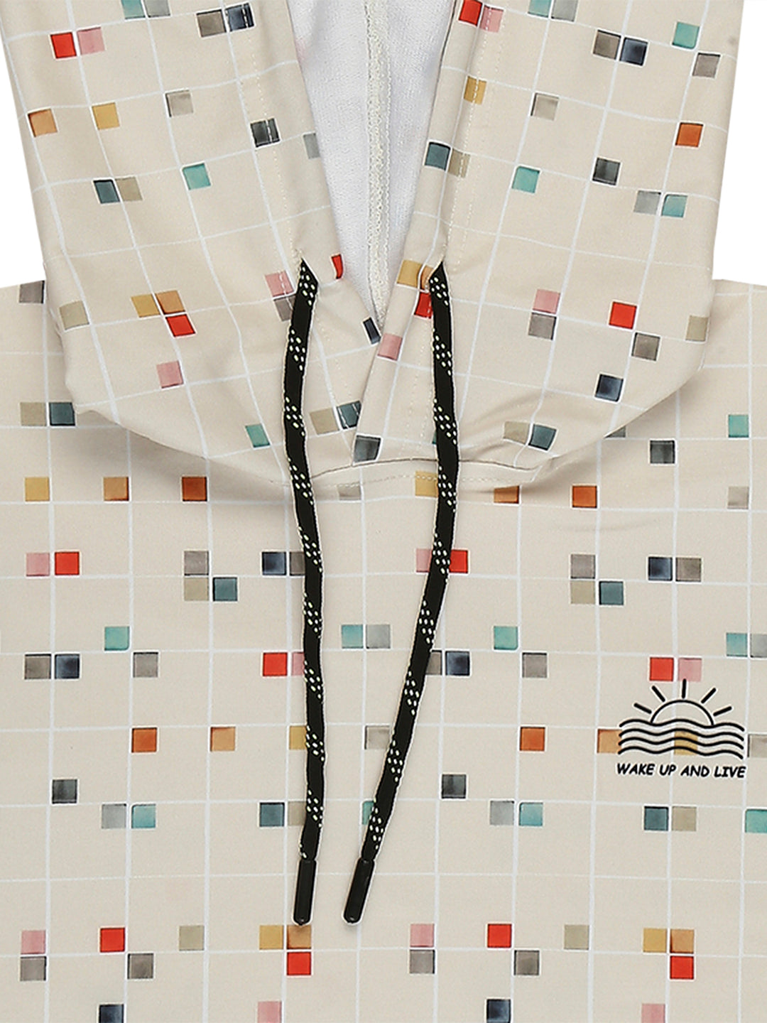 Cream-coloured and red geometric printed T-shirt ,has a hooded, short sleeves