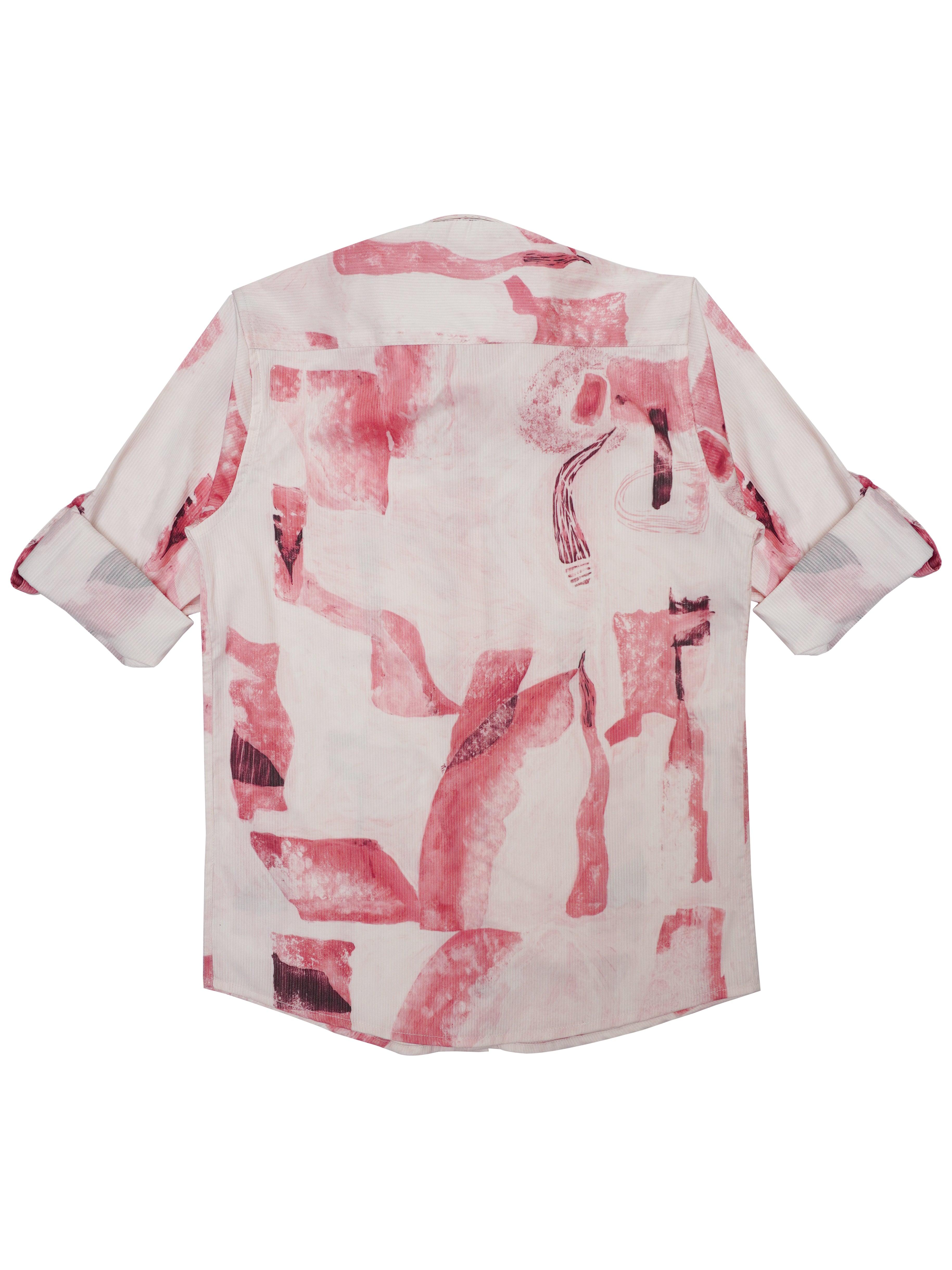 Pink abstract printed opaque Casual shirt ,has a spread collar, button placket, na pocket, long roll-up sleeves, curved hem