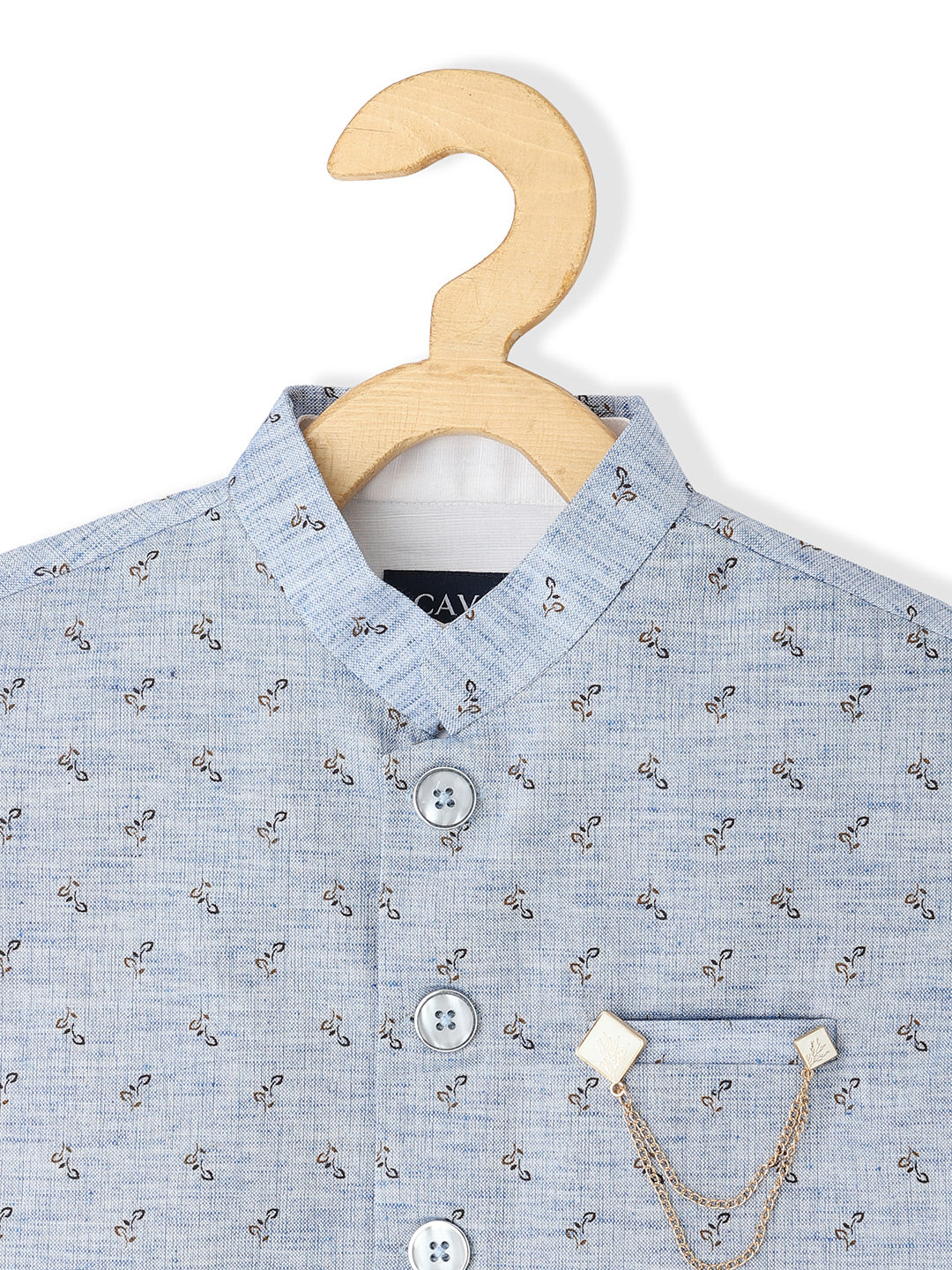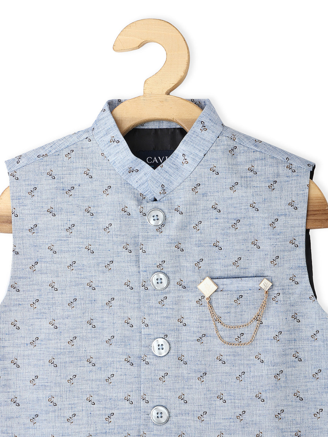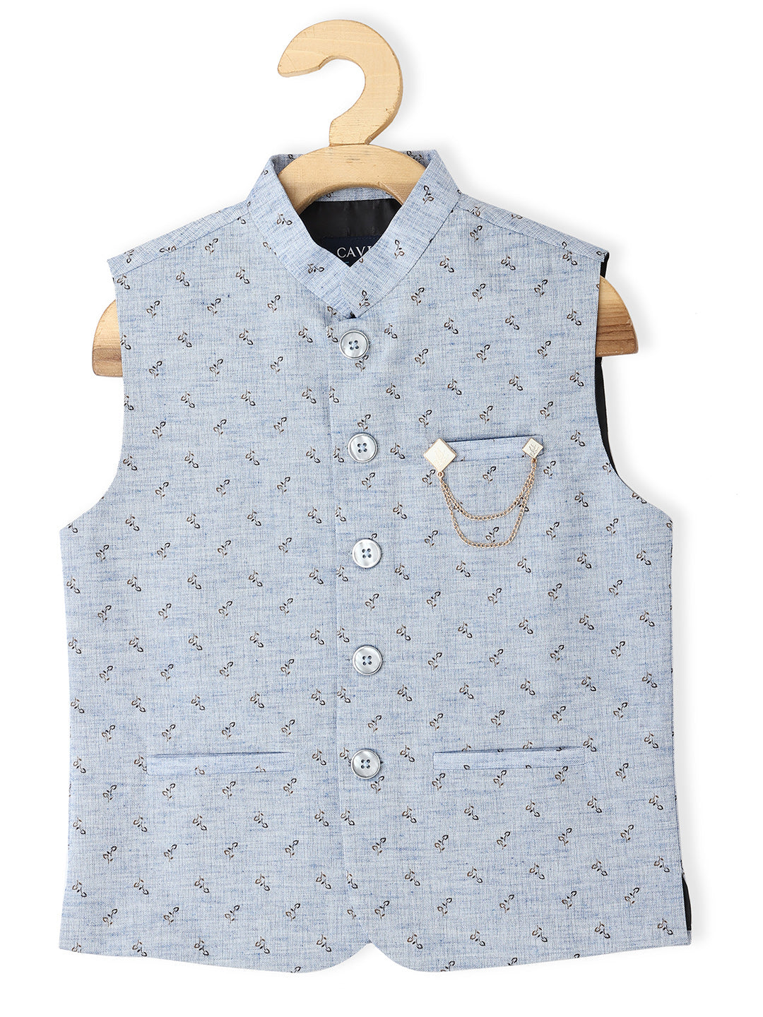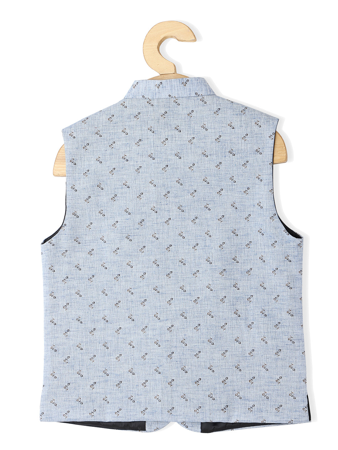 Printed Nehru jacket, has a mandarin collar, a full button placket, sleeveless and 3 pockets