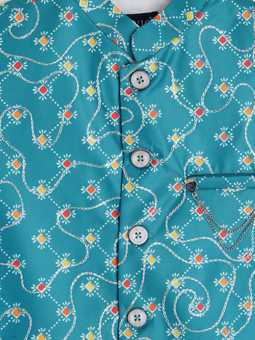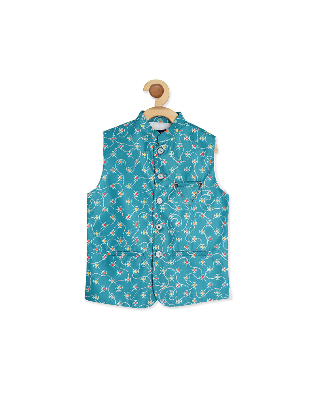Printed with embroidered woven Nehru jacket, has a mandarin collar, a full button placket, sleeveless, three pockets