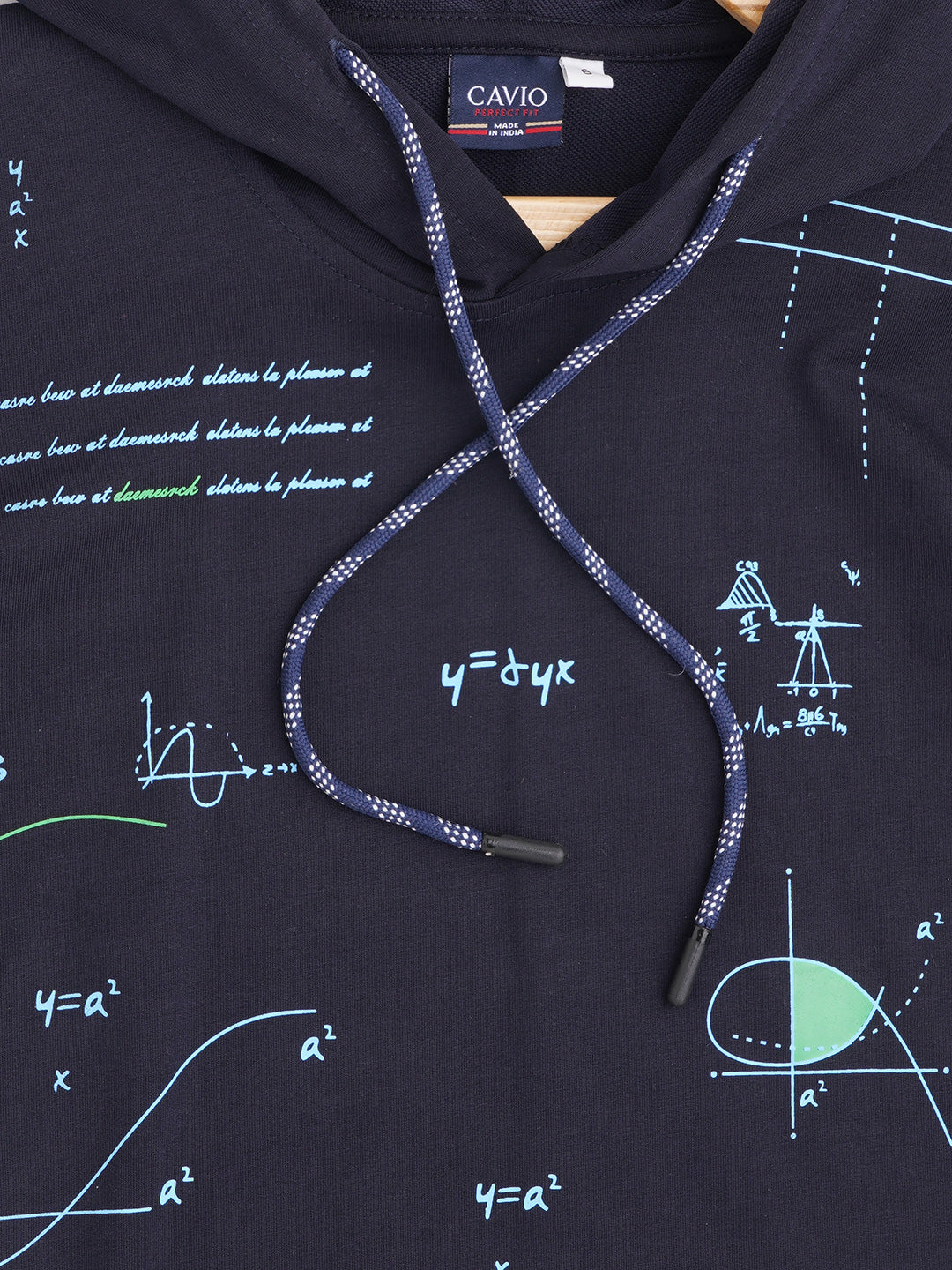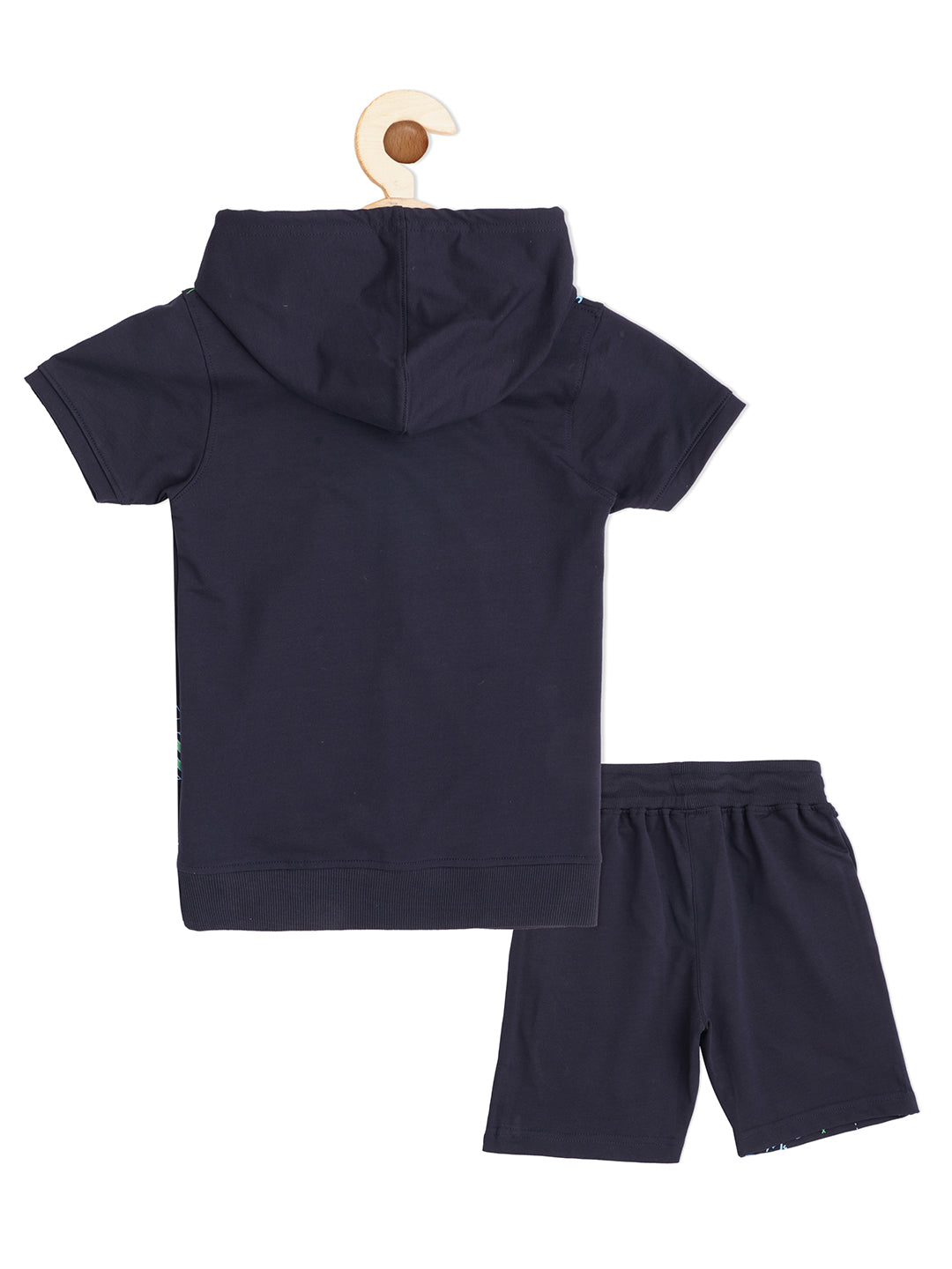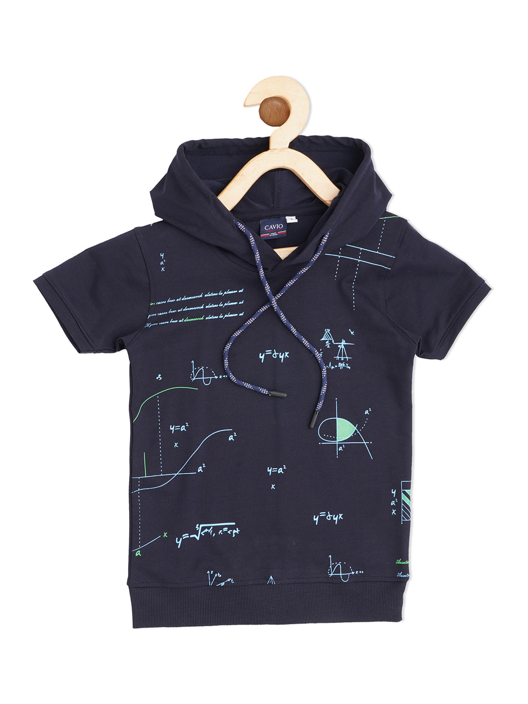 Navy blue and green printed T-shirt, has a hooded, short sleeves