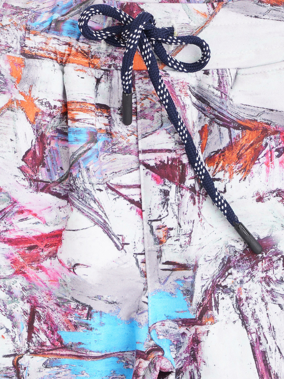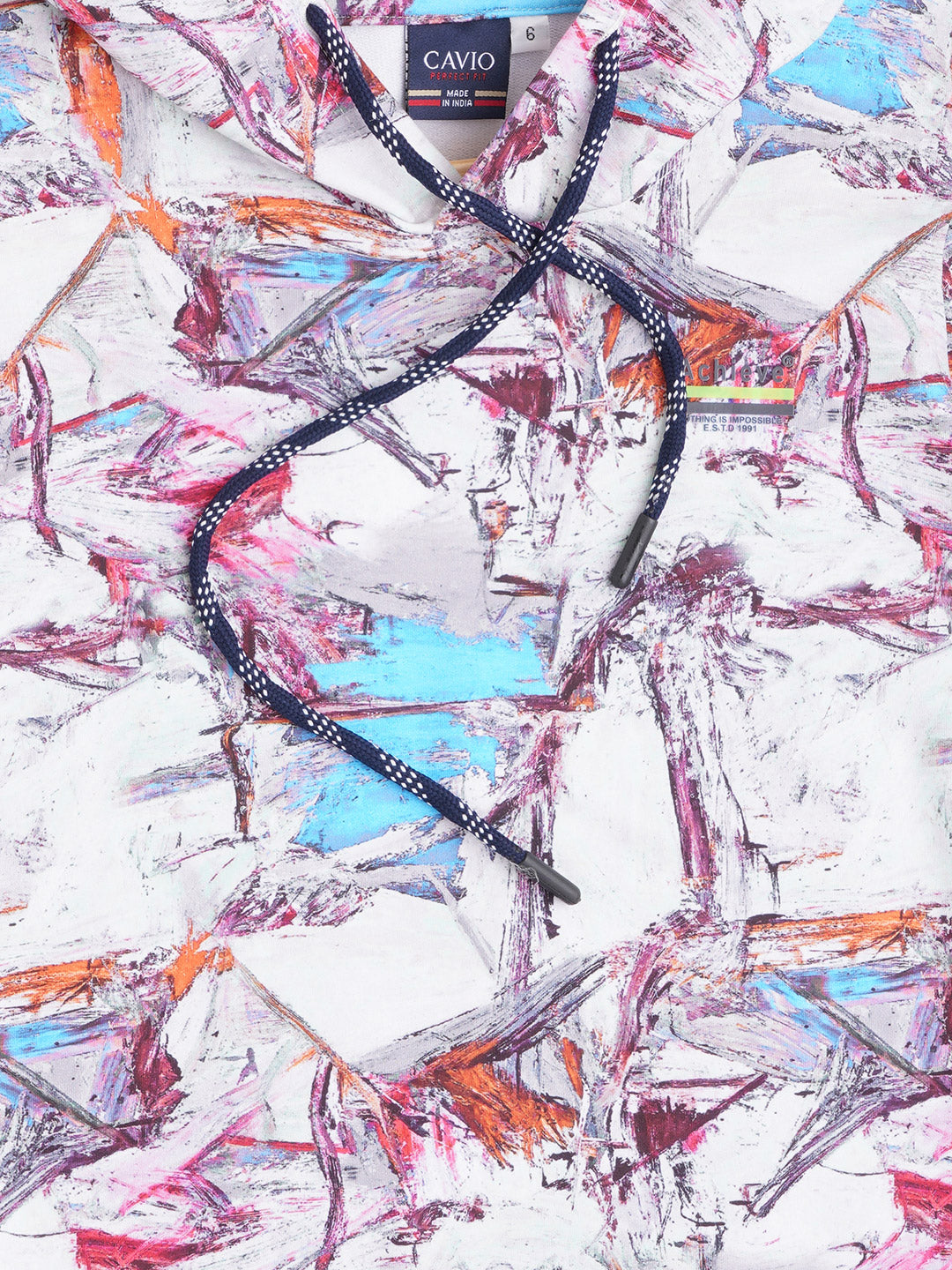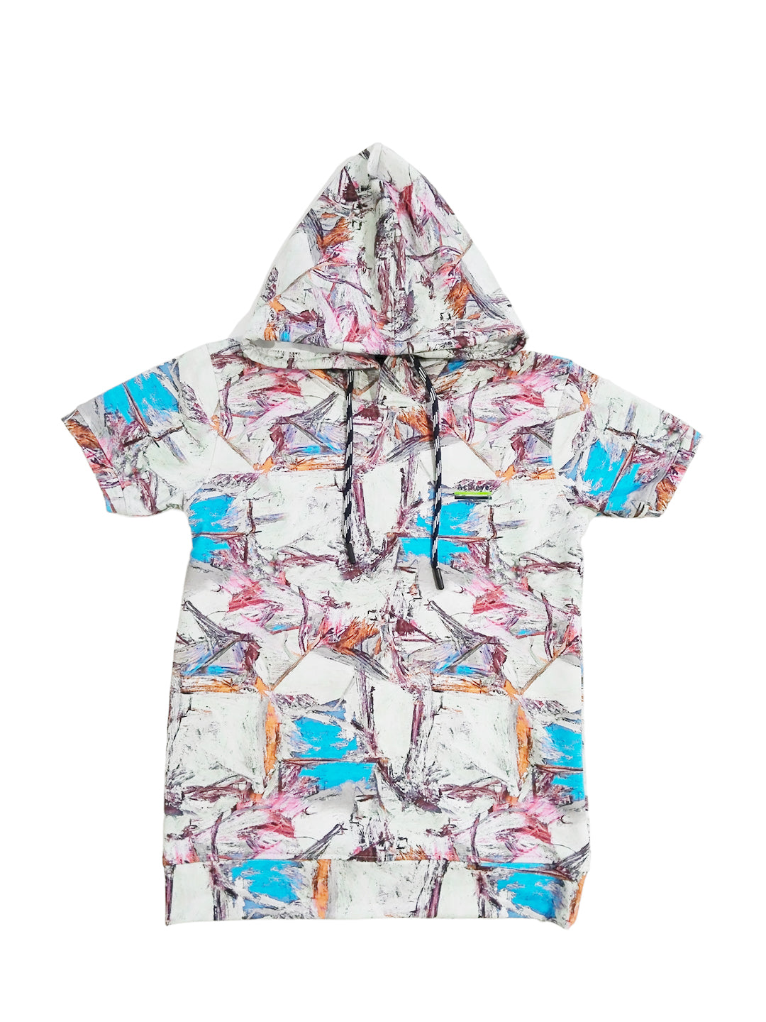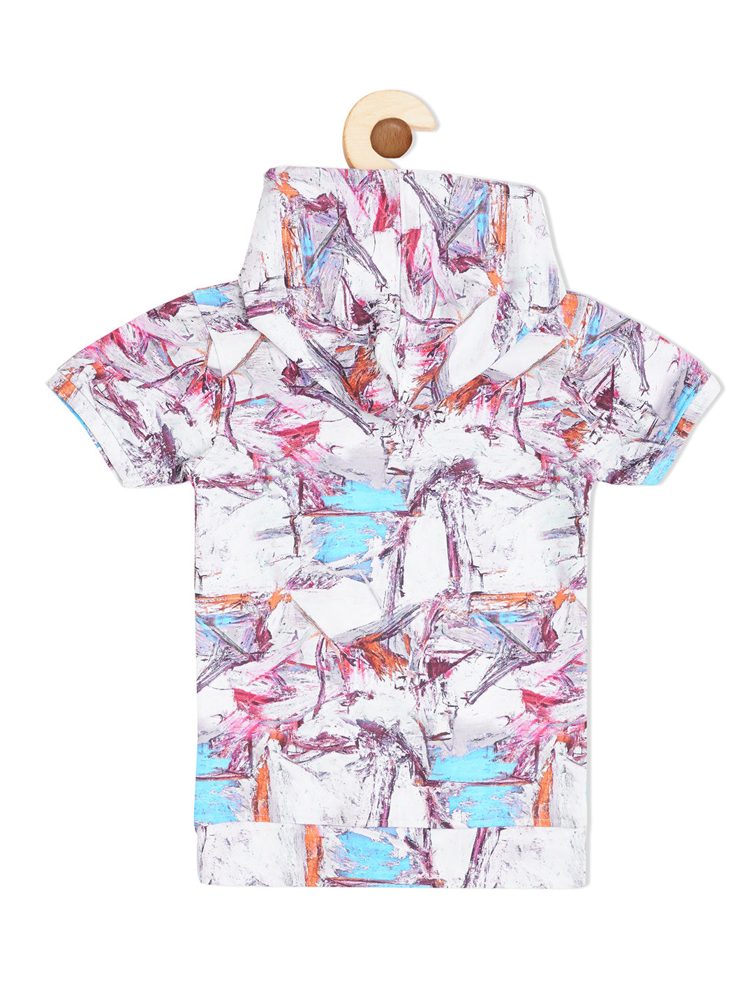White,purple and blue printed T-shirt ,has a hooded, short sleeves