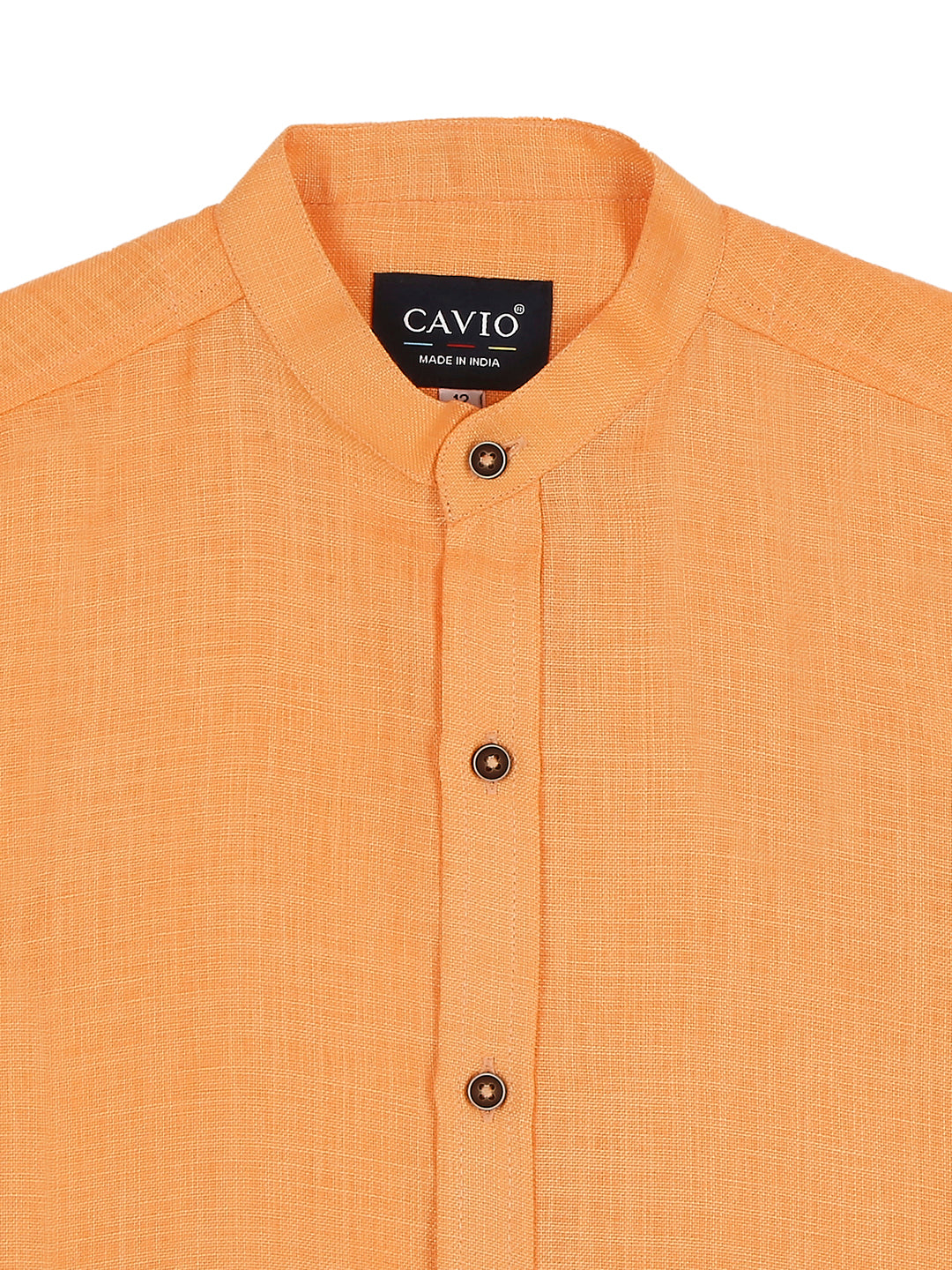 Orange colored solid shirt, has a mandarin collar, three fourth sleeves and button closure