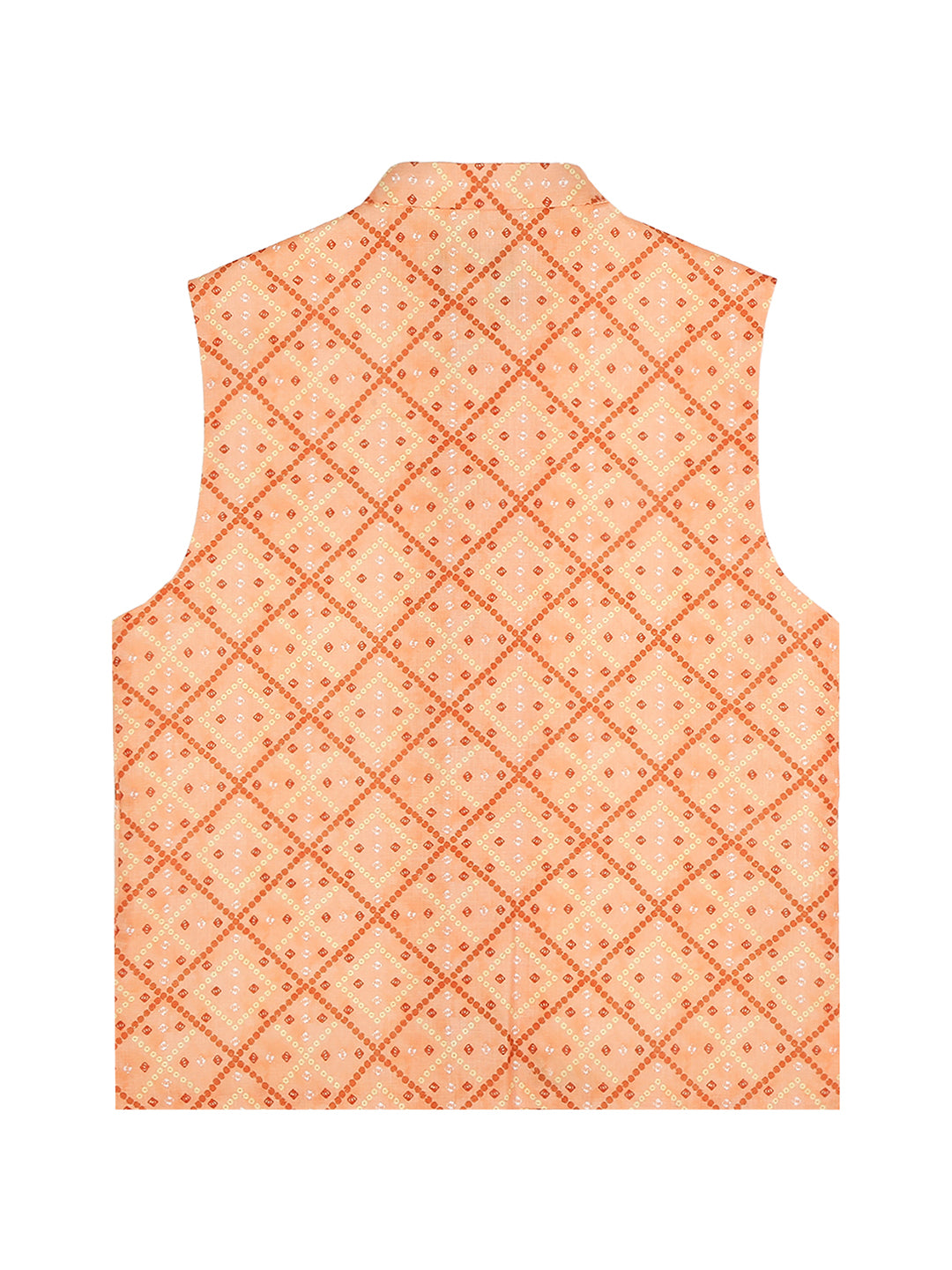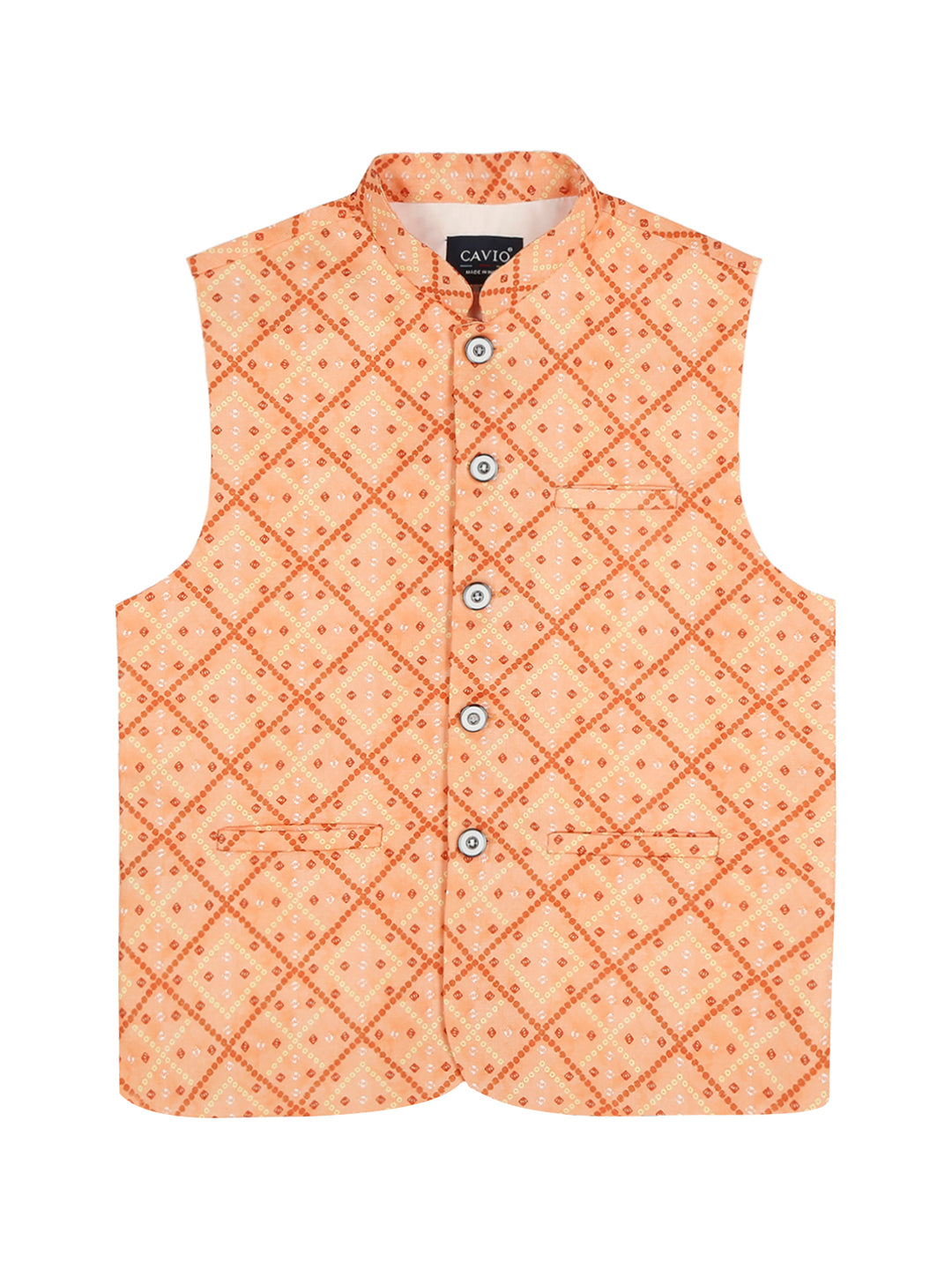 Orange colored printed woven Nehru jacket has a mandarin collar, a full button placket, sleeveless and 3 pockets