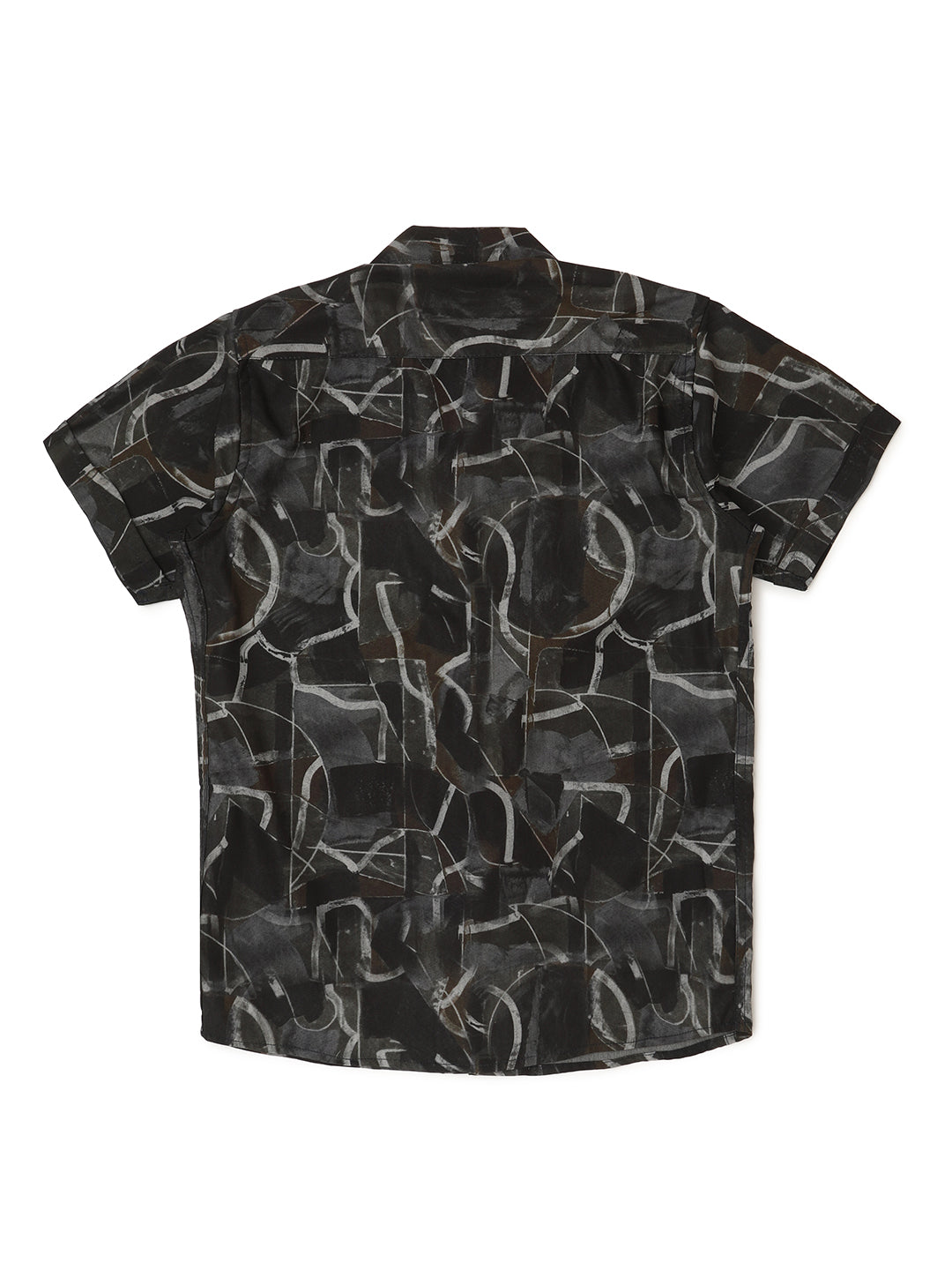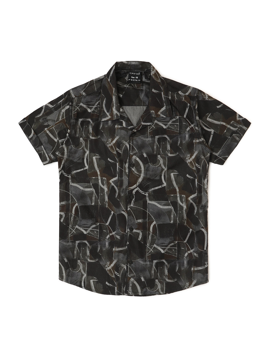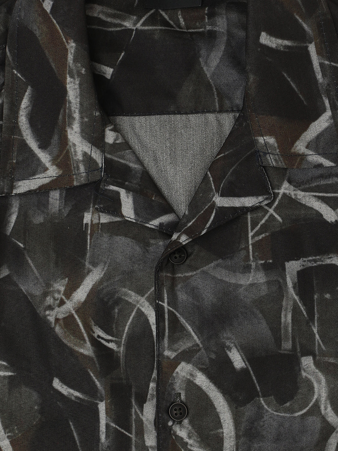 Black, grey and green abstract printed shirt ,has a shirt collar, short sleeves