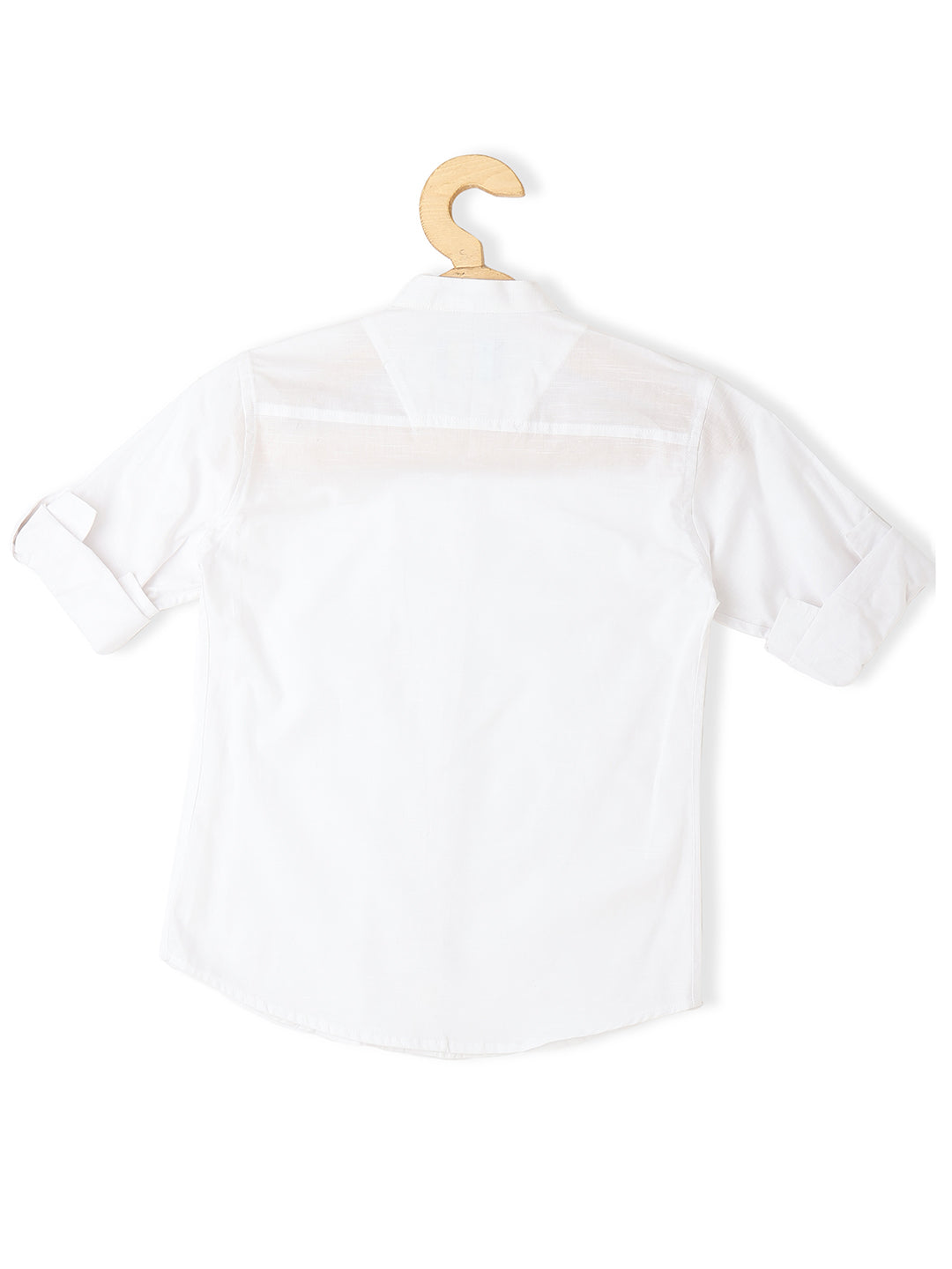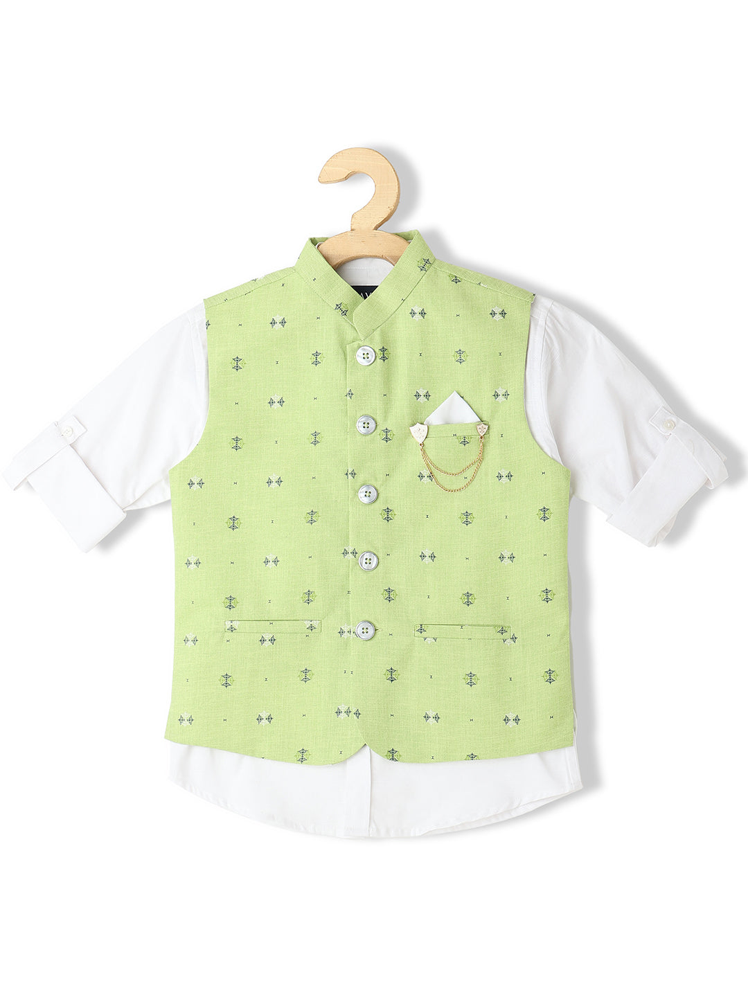 Comes with a brooch and a white solid shirt with half roll-up sleeves