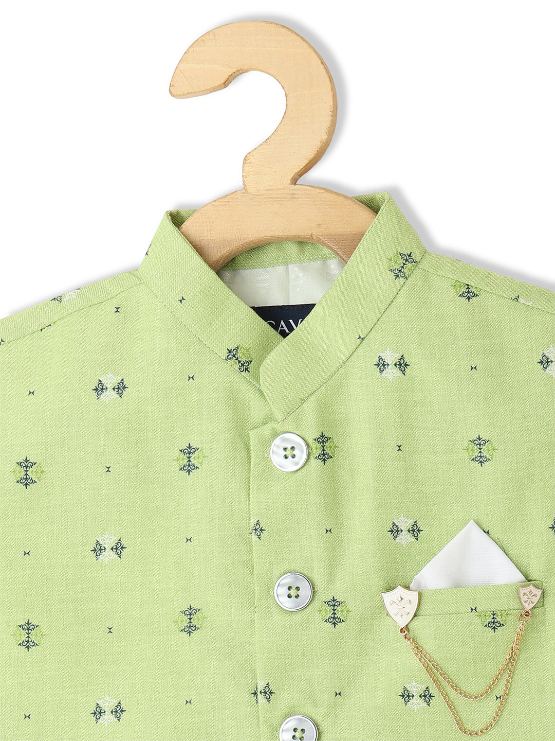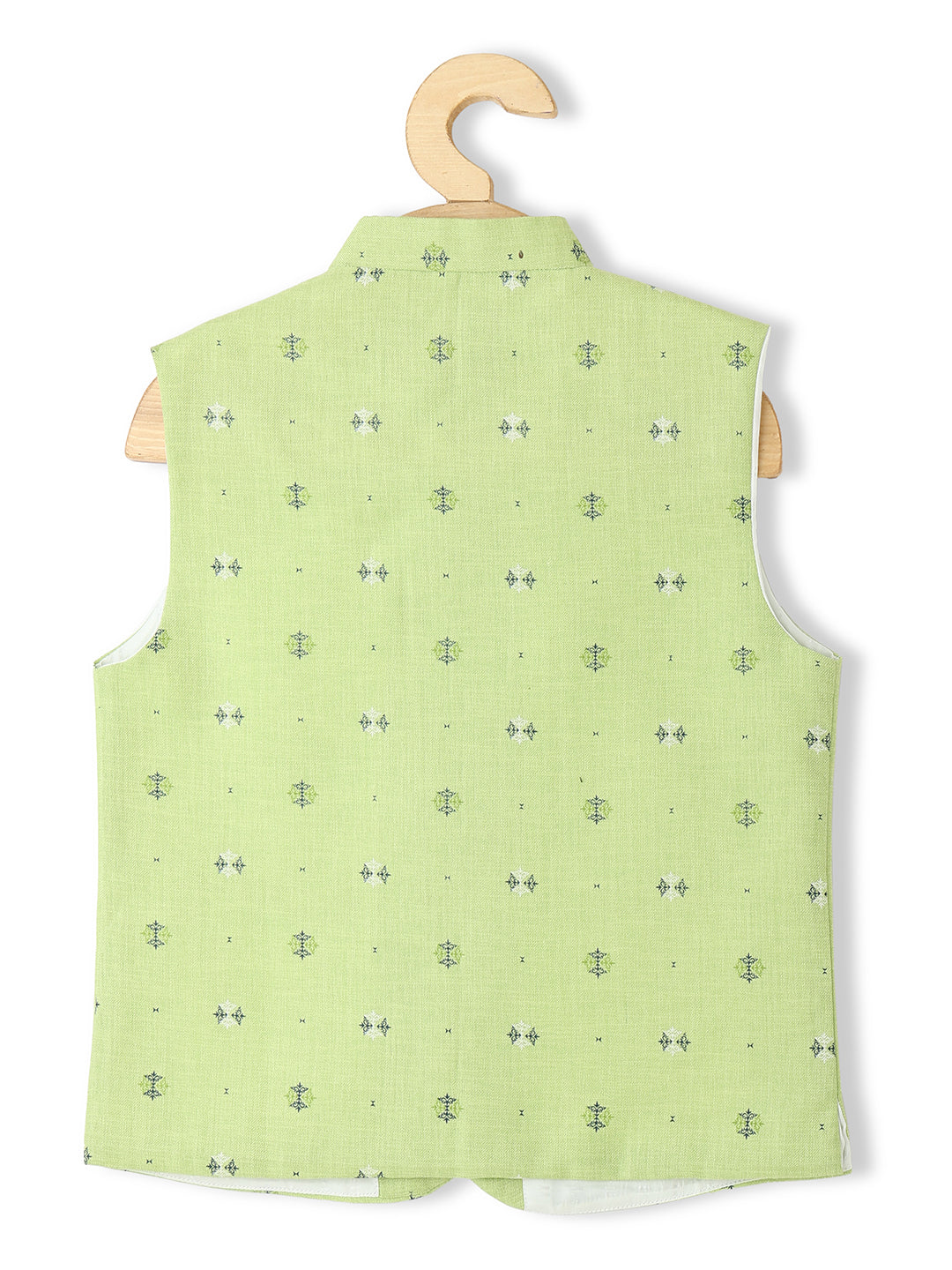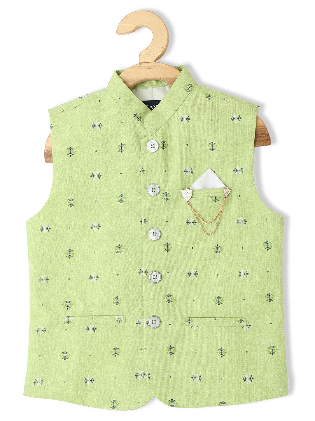 Green and white printed woven Nehru jacket, has a mandarin collar, a full button placket, sleeveless, three pockets