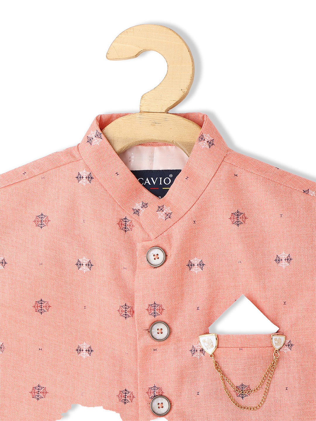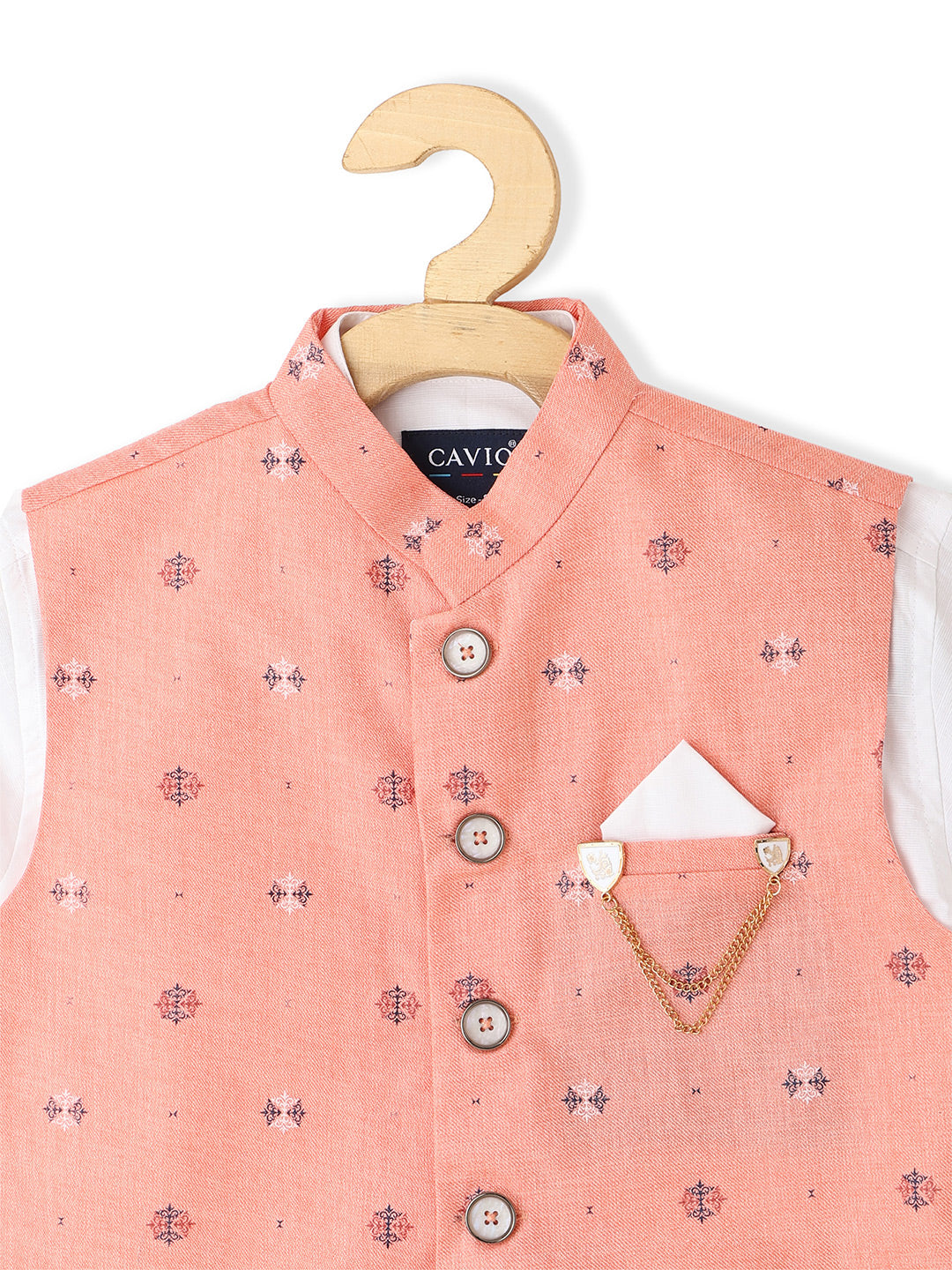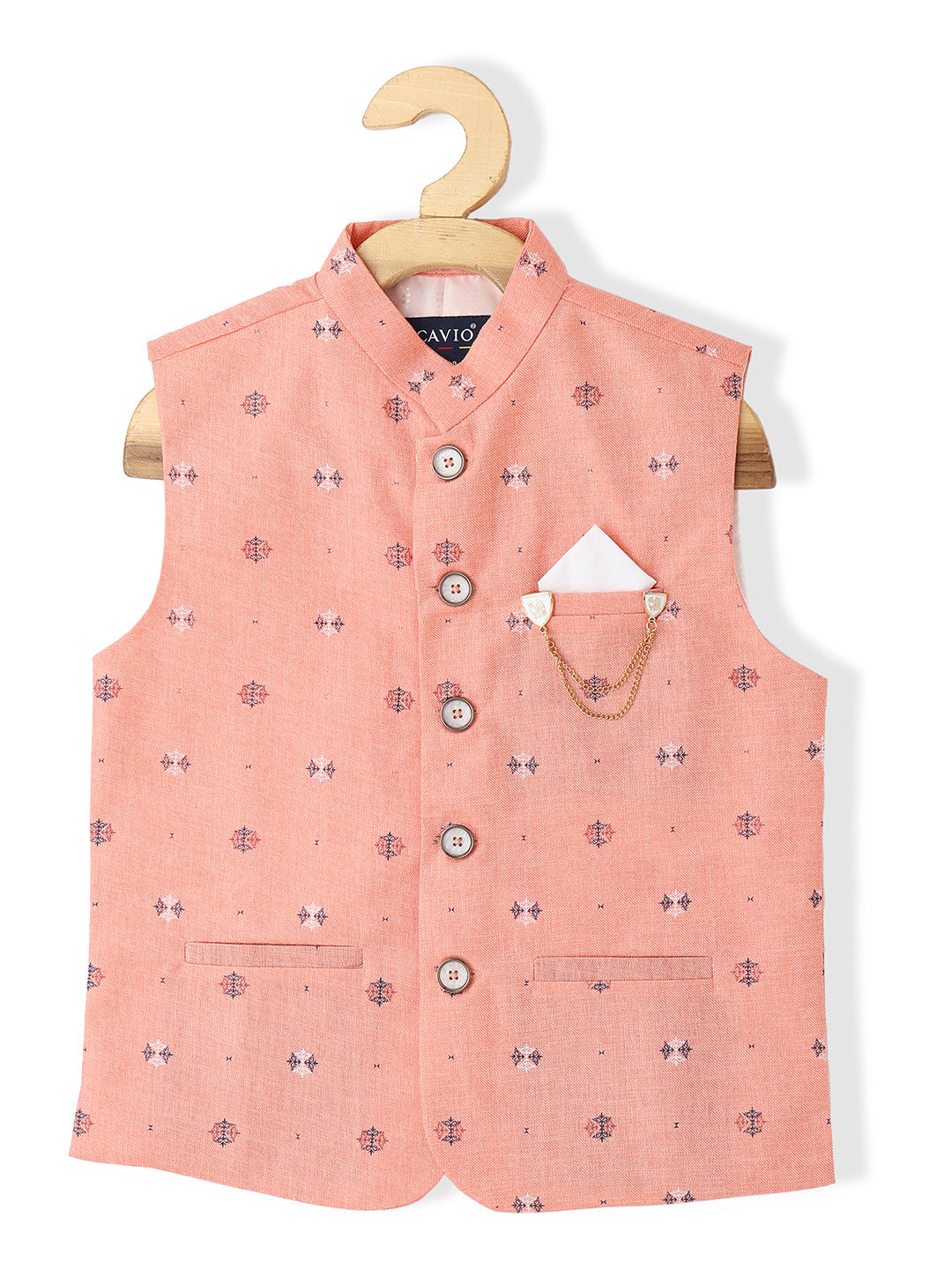 Woven-design Nehru jacket, has a mandarin collar, a full button placket, sleeveless, three pockets
