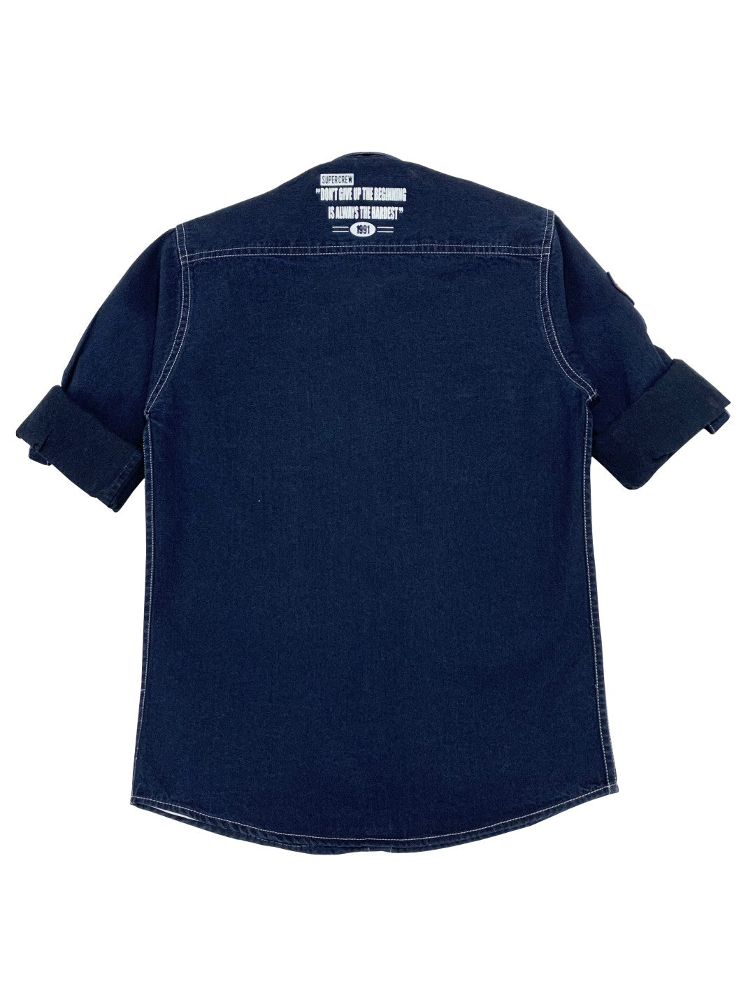 Blue typography printed opaque Casual shirt ,has a spread collar, button placket, na pocket, long roll-up sleeves, curved hem