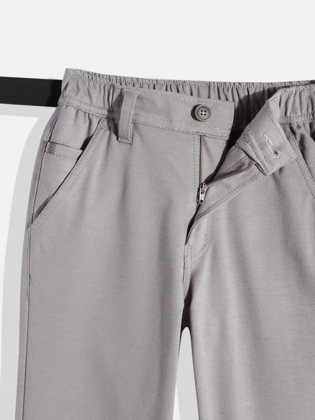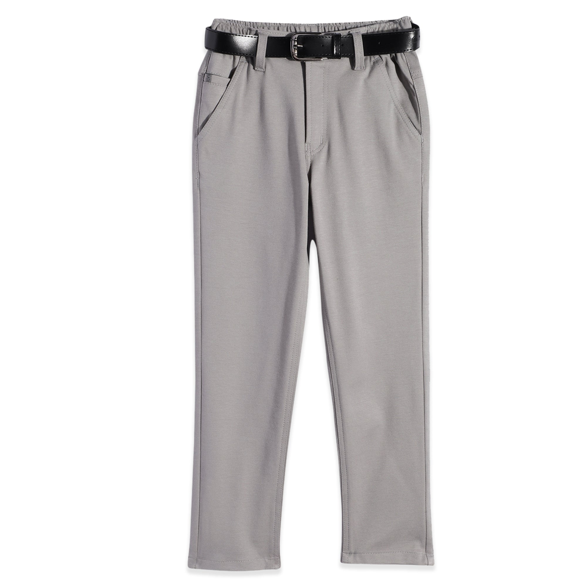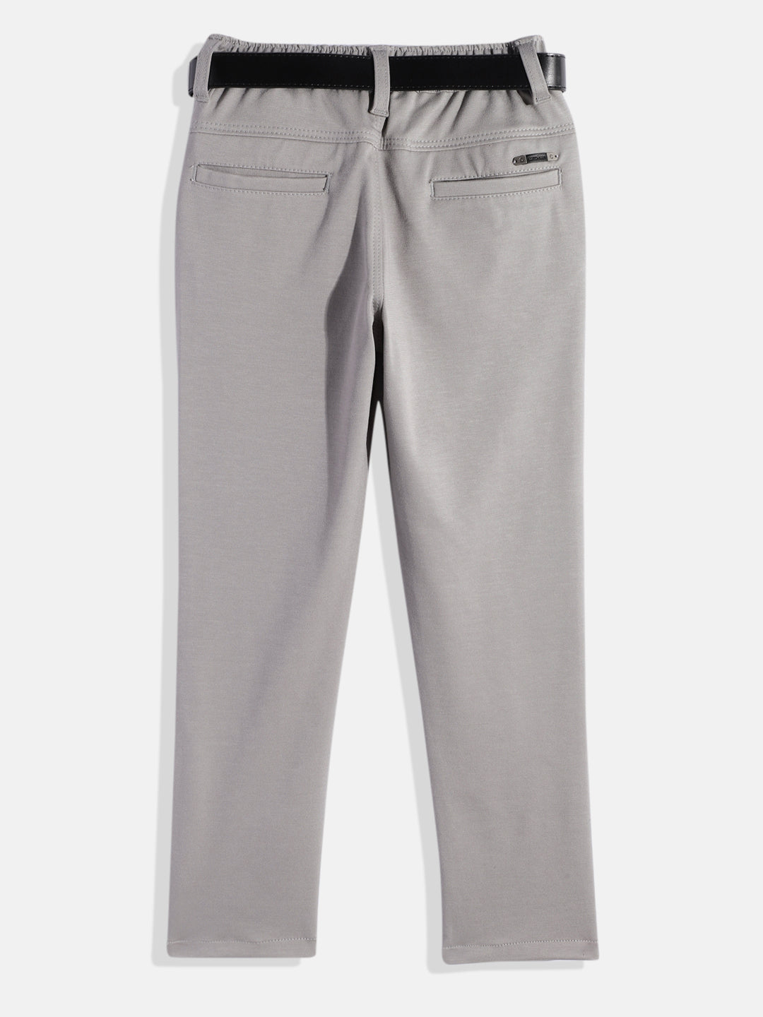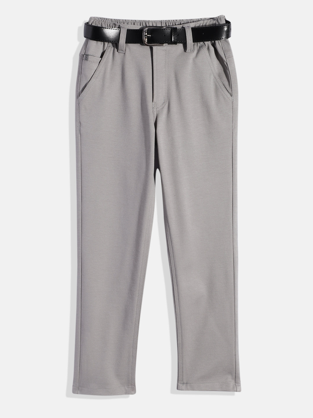 These boys' lycra-blend solid regular-fit trousers with a belt combine comfort and style for a polished look. Crafted from a stretchy lycra blend, these trousers provide excellent flexibility and all-day comfort. The regular fit ensures a classic silhouette, while the included belt adds a smart finishing touch. Perfect for both casual and semi-formal occasions.