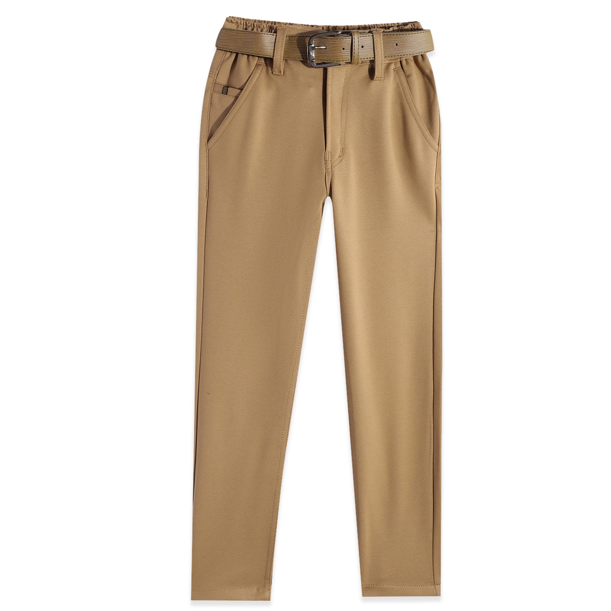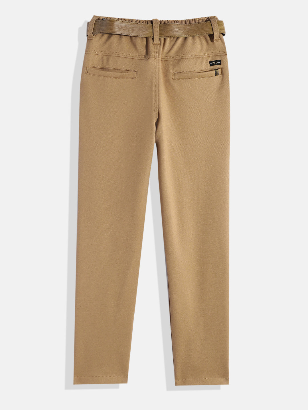 These boys' lycra-blend solid regular-fit trousers with a belt combine comfort and style for a polished look. Crafted from a stretchy lycra blend, these trousers provide excellent flexibility and all-day comfort. The regular fit ensures a classic silhouette, while the included belt adds a smart finishing touch. Perfect for both casual and semi-formal occasions.