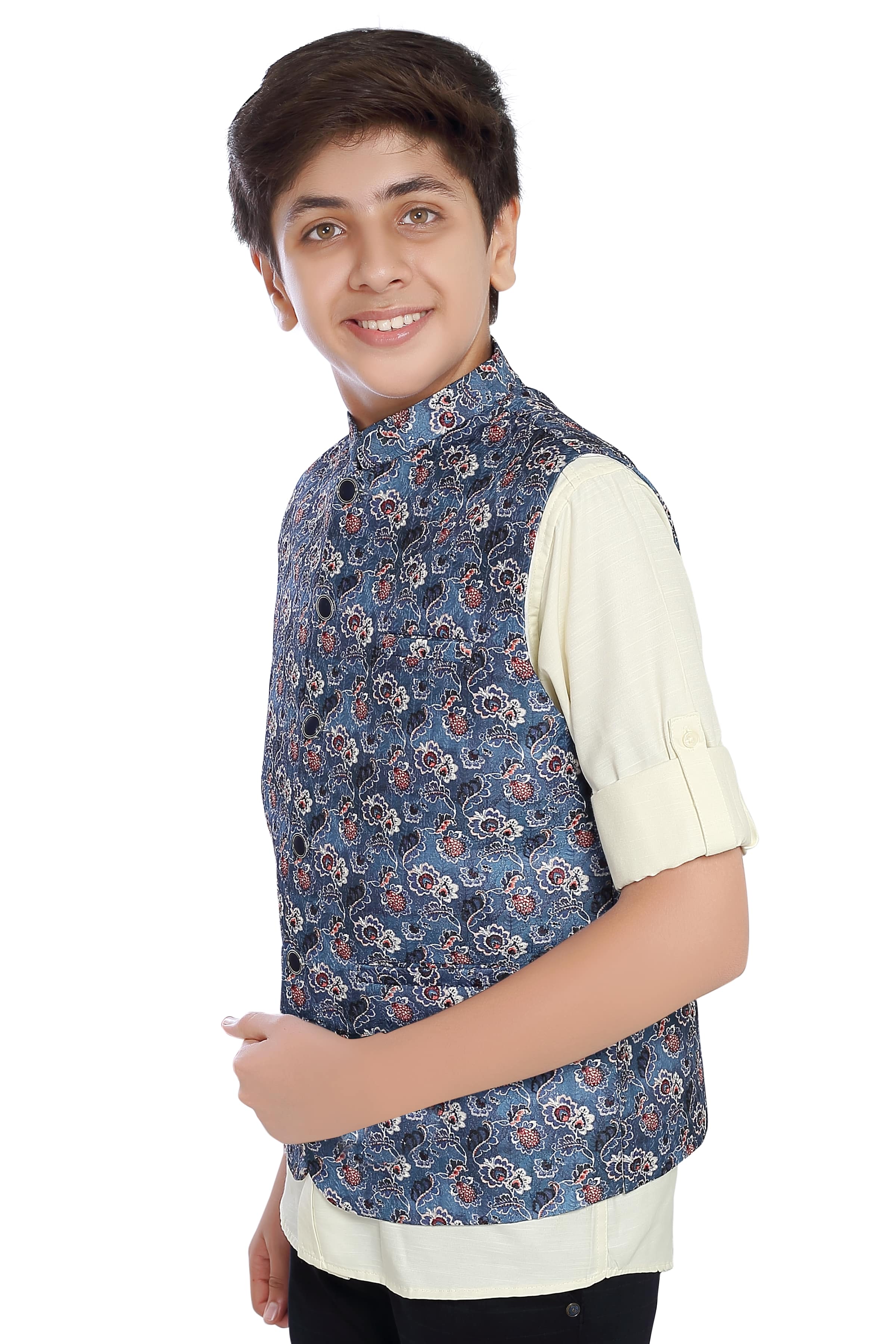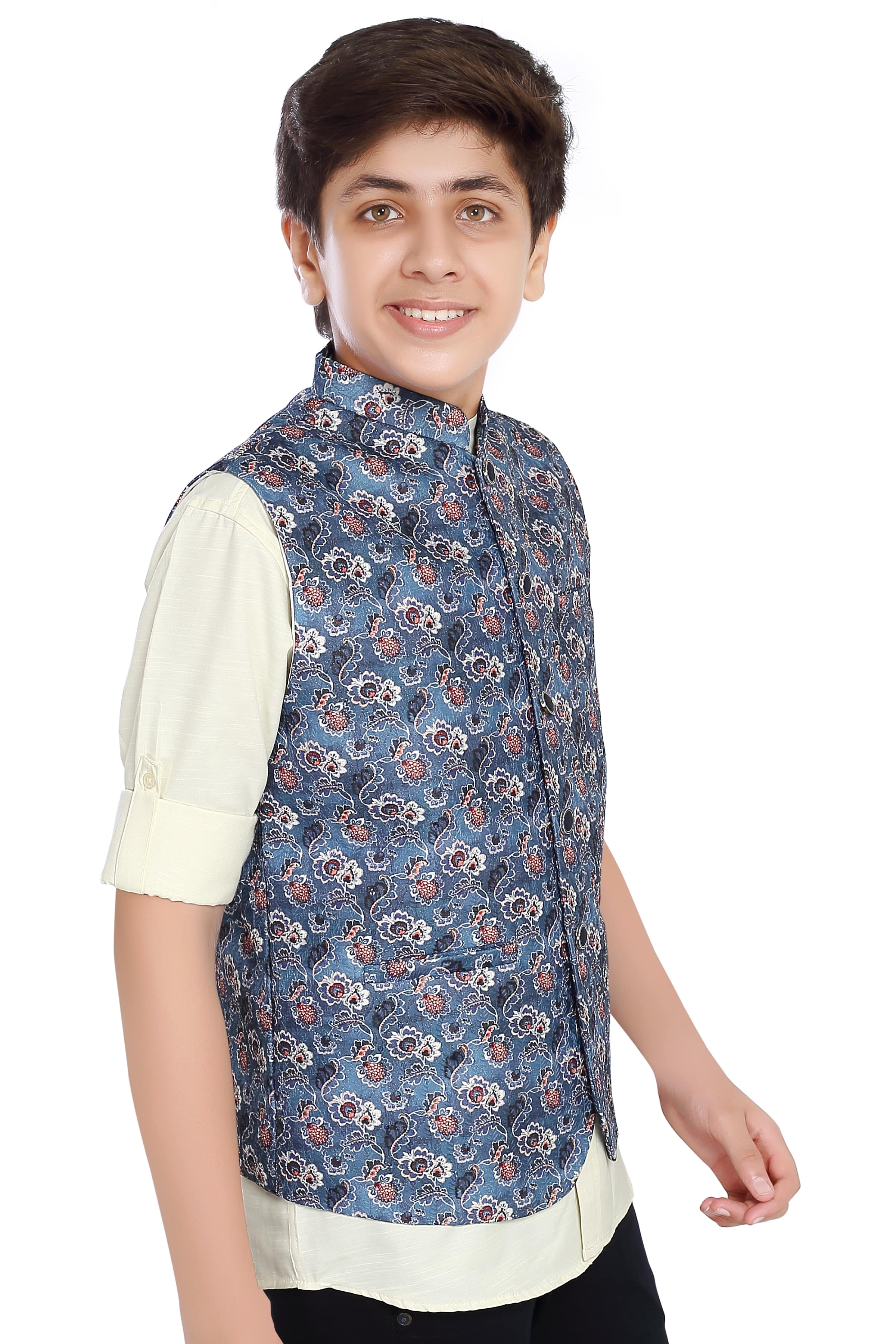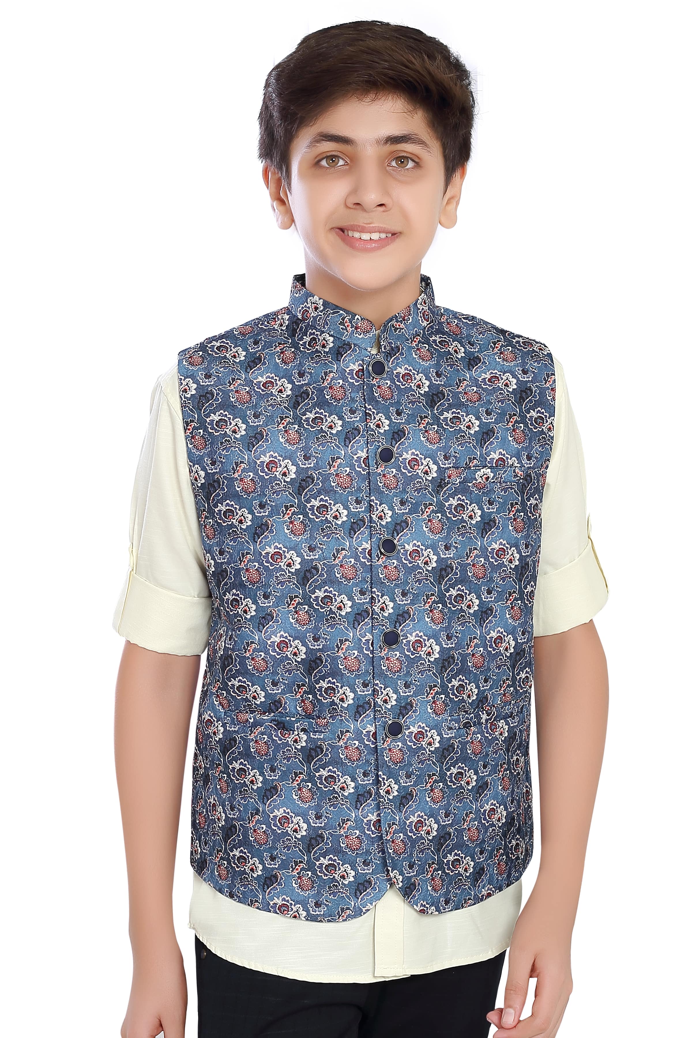 The CHARCHIT Boys Printed Nehru Jacket with Shirt combines classic elegance with a touch of contemporary flair, making it a charming choice for young Boys. The jacket boasts a timeless Nehru collar, adding a sophisticated touch to the ensemble. The print adds a hint of playfulness and modernity to the overall design. Crafted with meticulous attention to detail, the jacket features impeccable tailoring, ensuring a perfect fit. Paired seamlessly with a complementary shirt, this ensemble effortlessly bridges the gap between tradition and modern style, making it an ideal choice for formal occasions or cultural celebrations. The CHARCHIT Boys Printed Nehru Jacket with Shirt is a testament to the brand's commitment to quality and style, offering young boys a tasteful and refined outfit for special events.